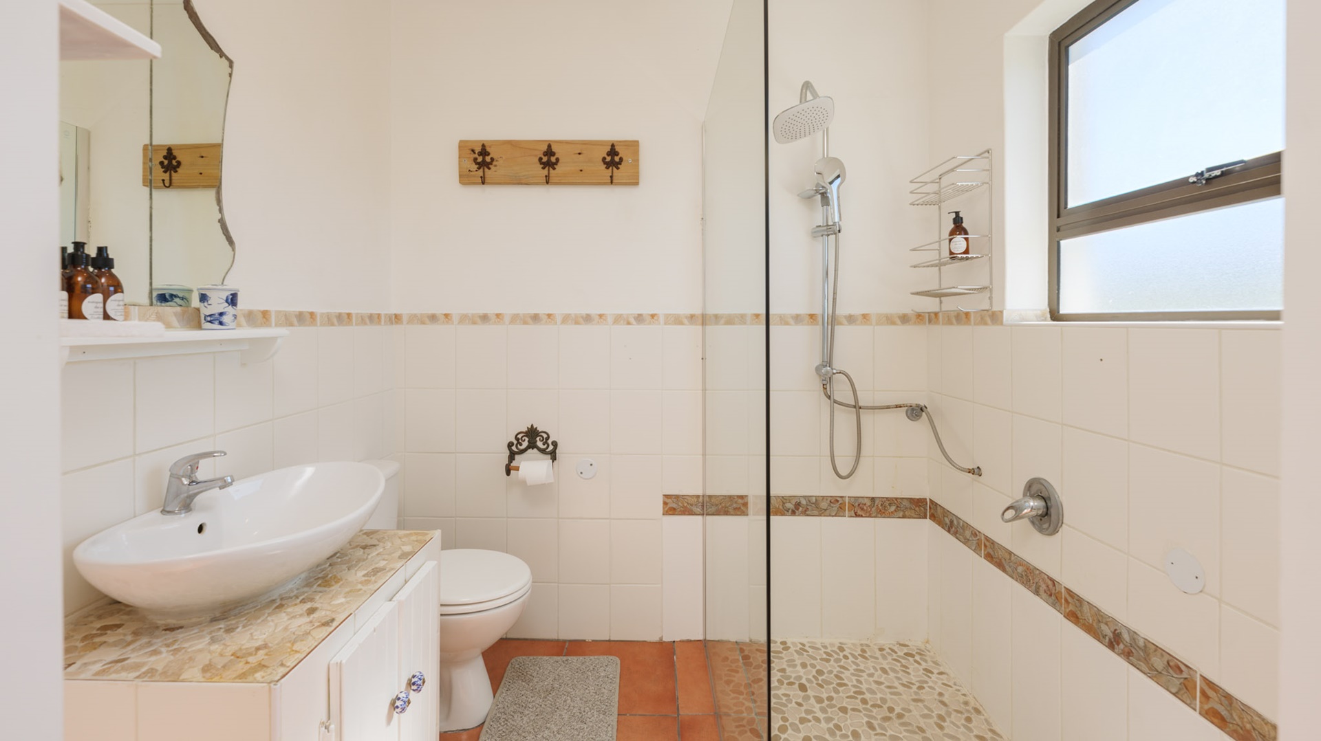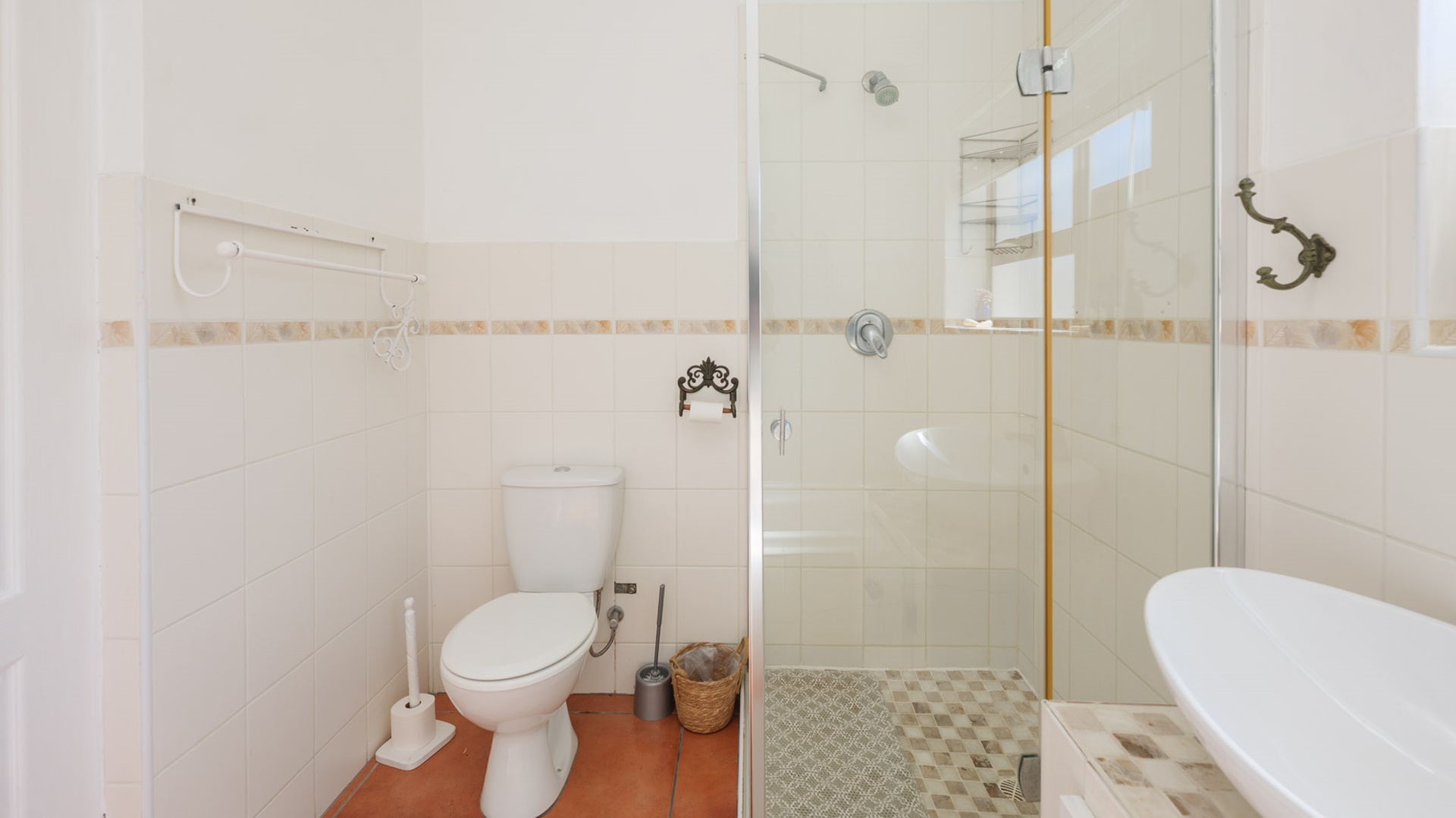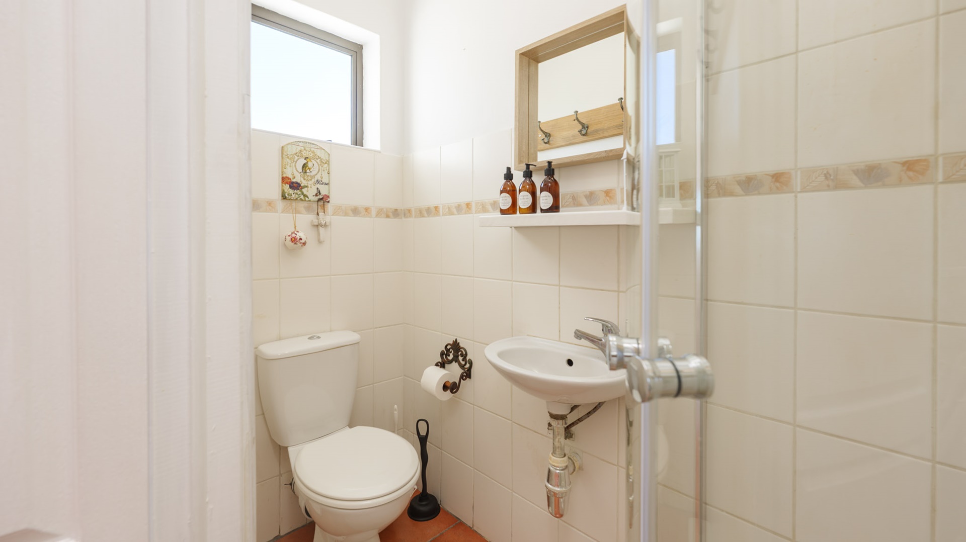 - A second bedroom alongside a bathroom with shower, toilet, and basin.