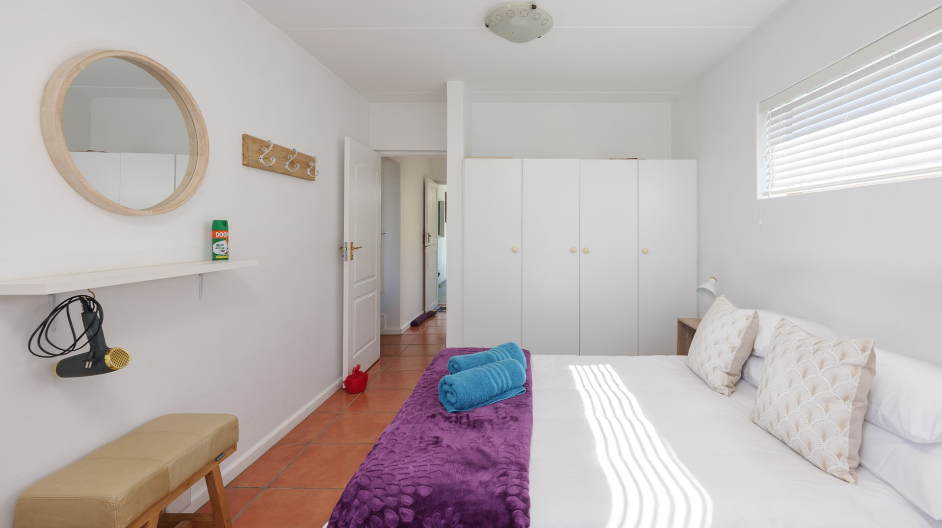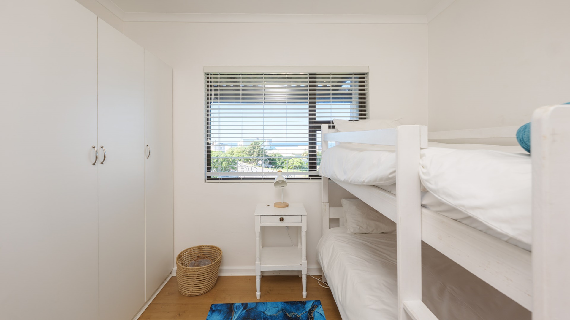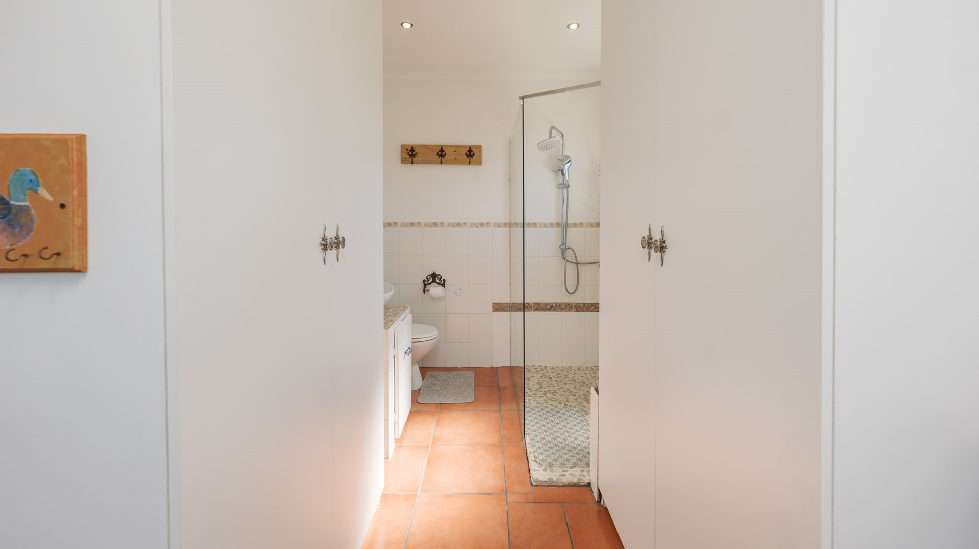 - A second bedroom alongside a bathroom with shower, toilet, and basin.