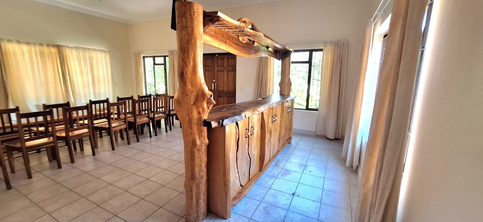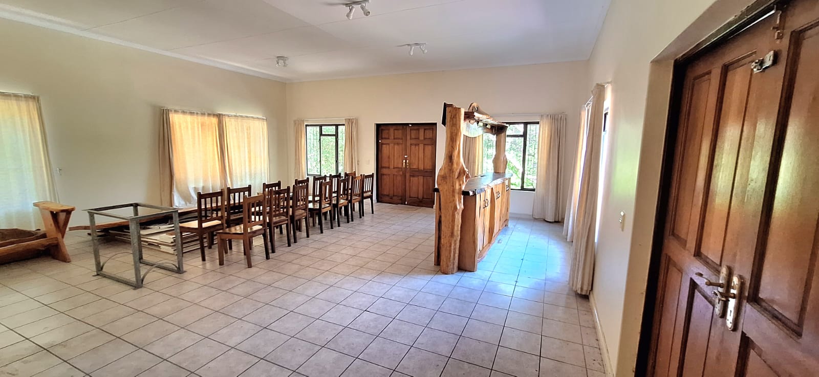 The living area leads into an exceptionally spacious lounge/entertainment area, providing the perfect setting for family gatherings or social occasions. Double doors open onto an enclosed courtyard patio with a built-in braai, creating a sheltered and private entertainment space that connects seamlessly with the garden and outdoor areas.