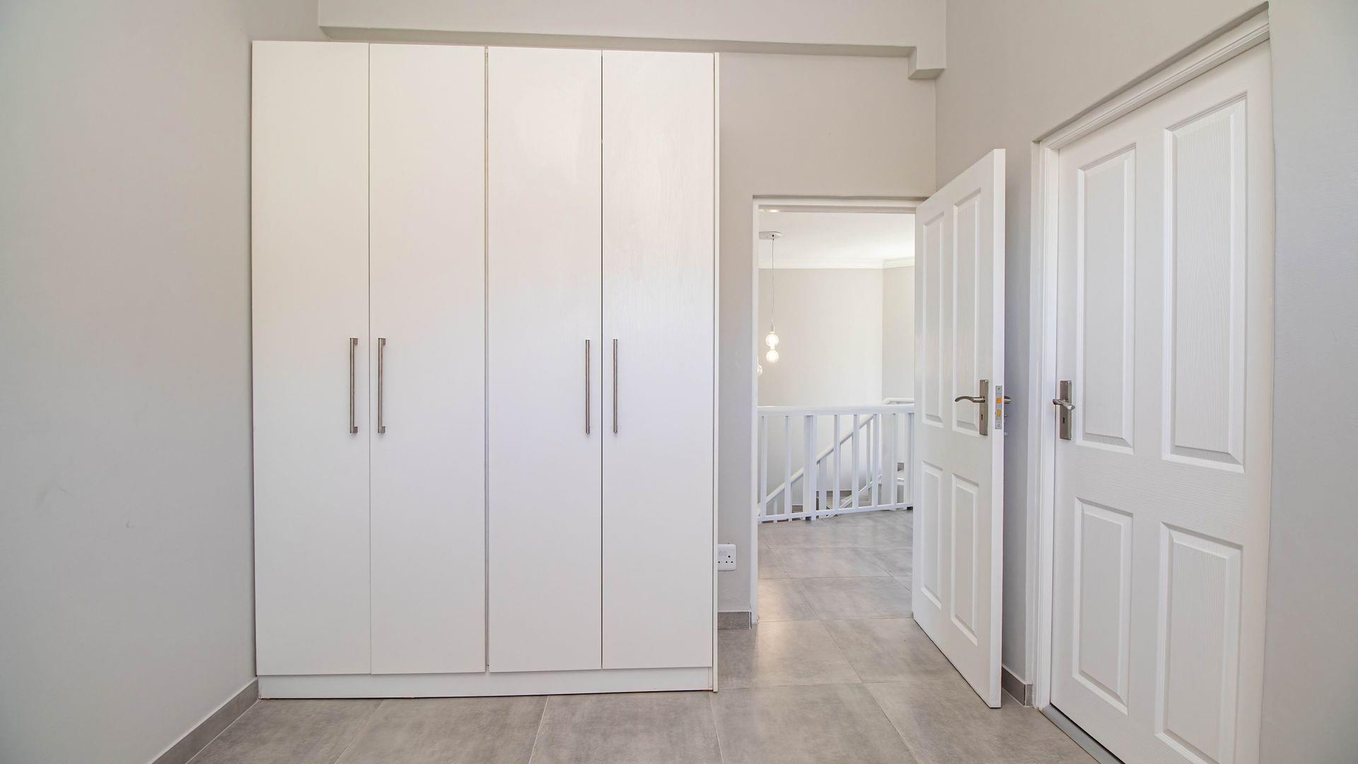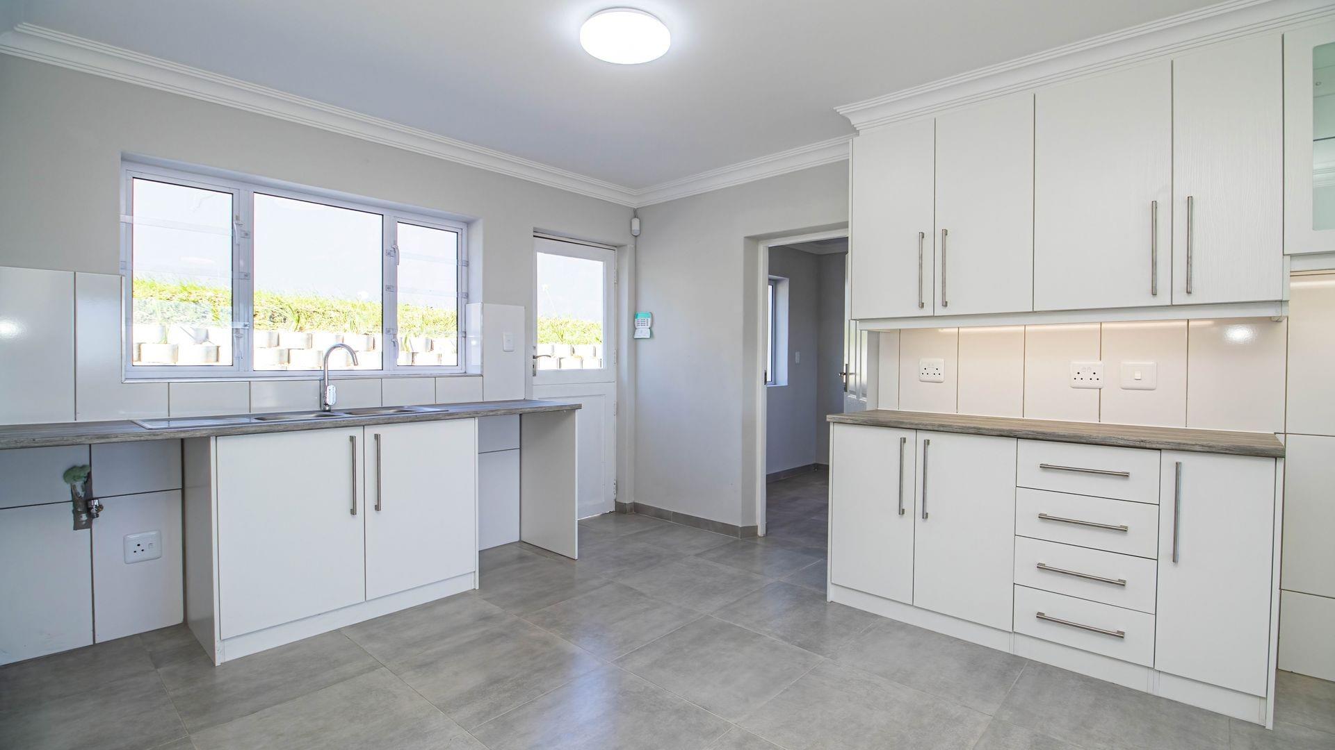 The ground floor features a bright, open plan living area with sliding doors that open onto a generous covered patio—perfect for year-round entertaining—complete with a built-in braai. The brand-new kitchen is a standout feature: spacious, stylish, and well-appointed, with ample cabinetry and a breakfast counter positioned to take in the lagoon views.