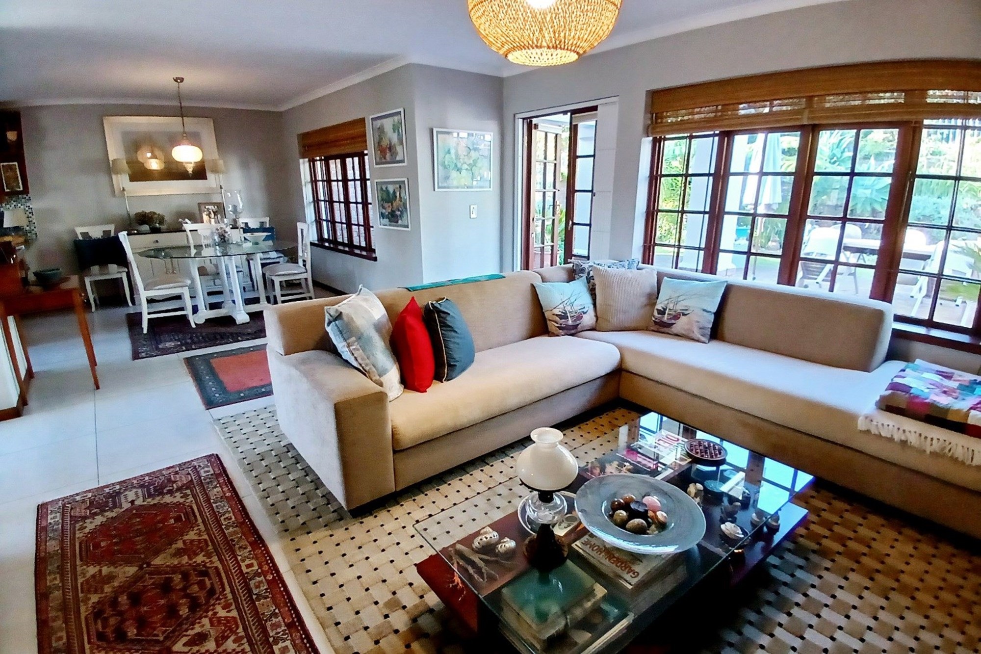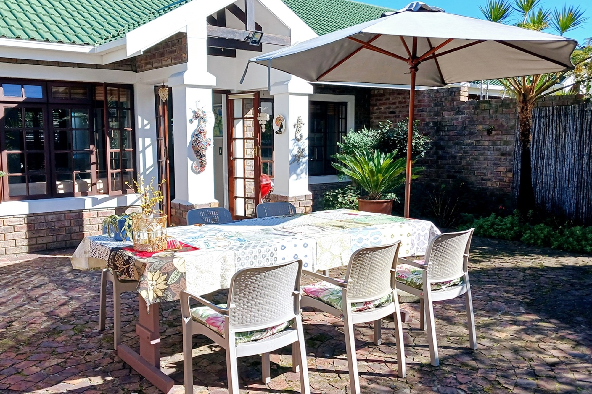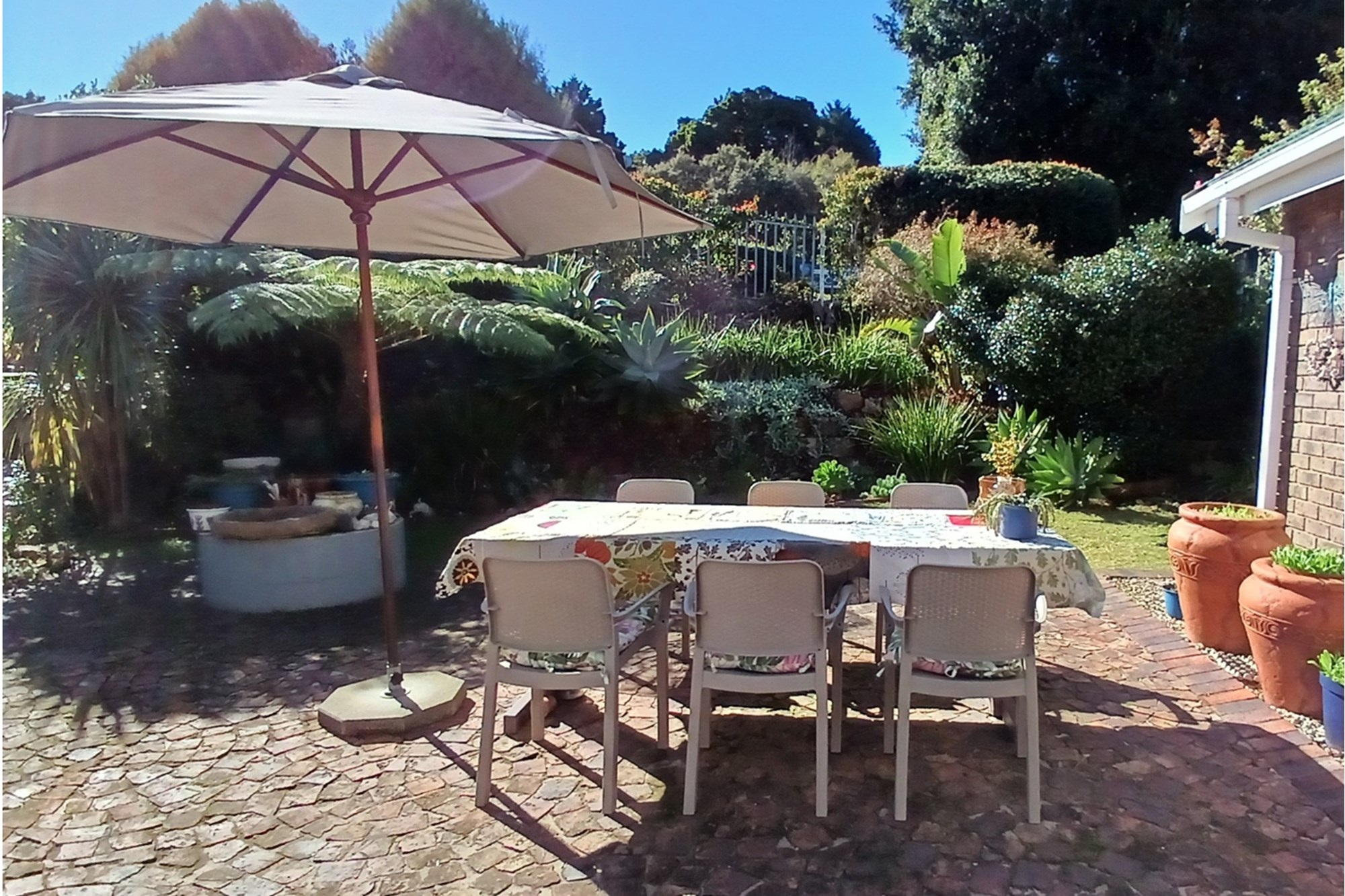 Open plan living areas leading to a pretty private garden with an outdoor table, chairs, and an umbrella.