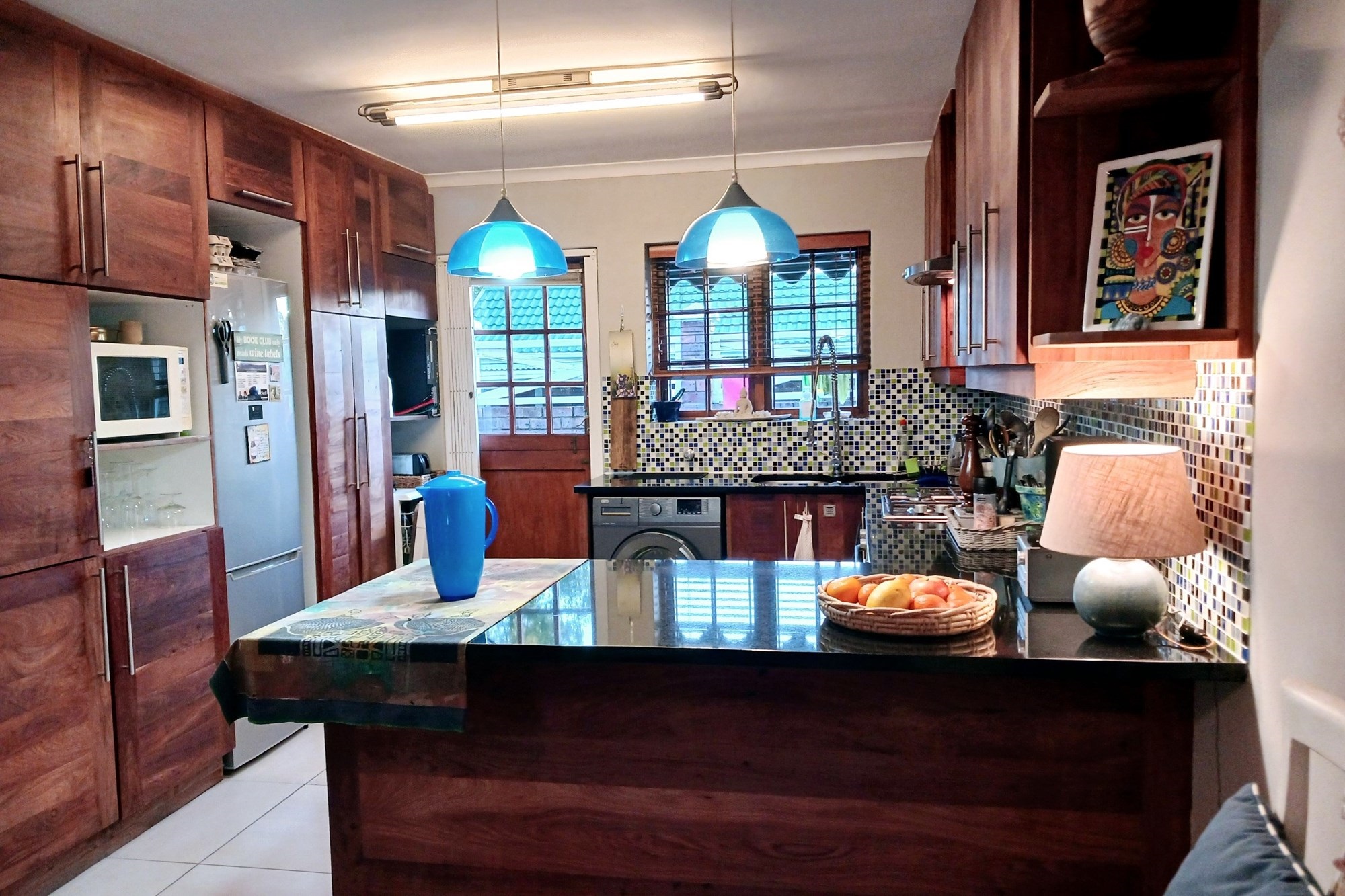 Kitchen fitted with dishwasher and washing machine. No air-fryer, but there is a microwave, gas hob, and electric oven.
