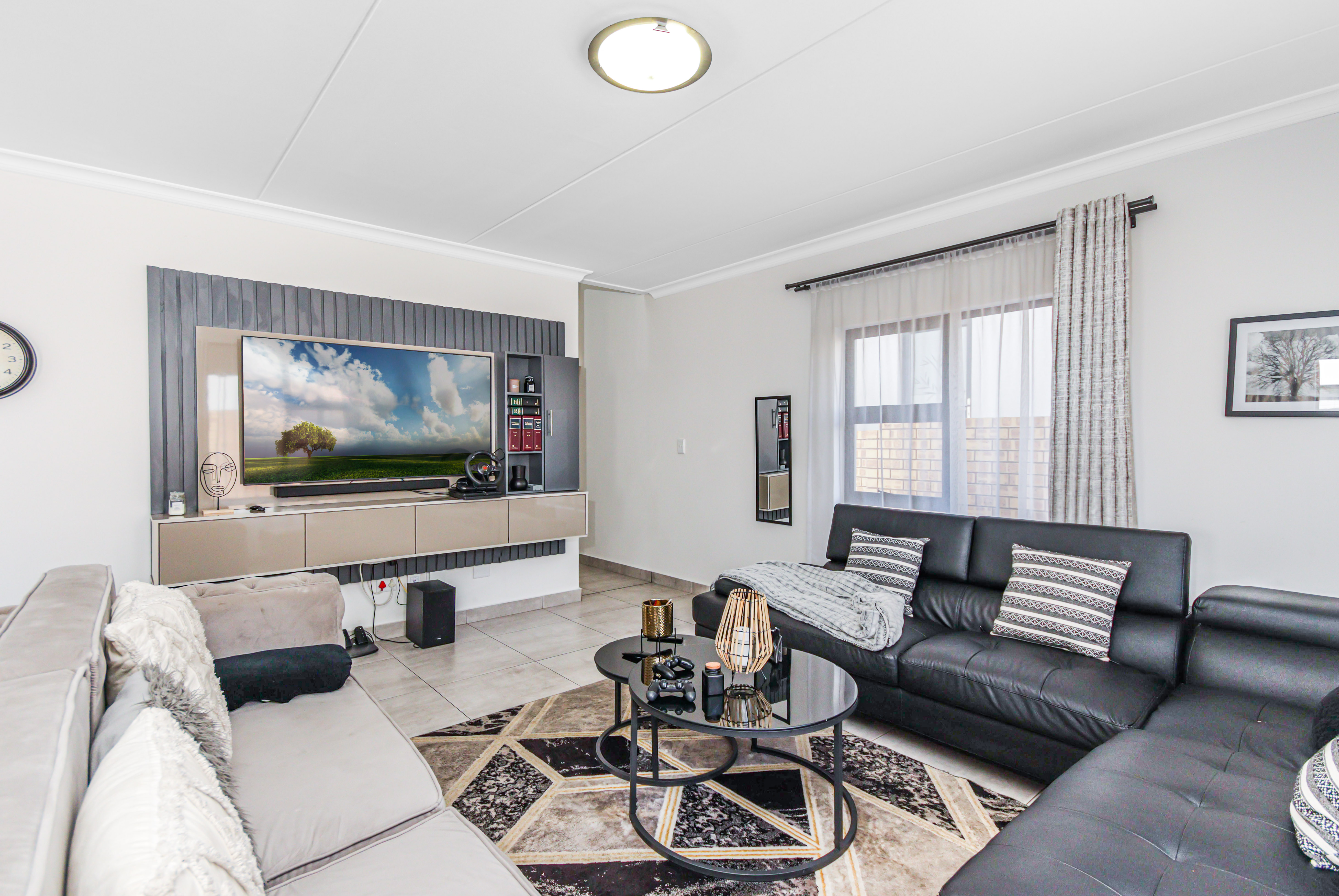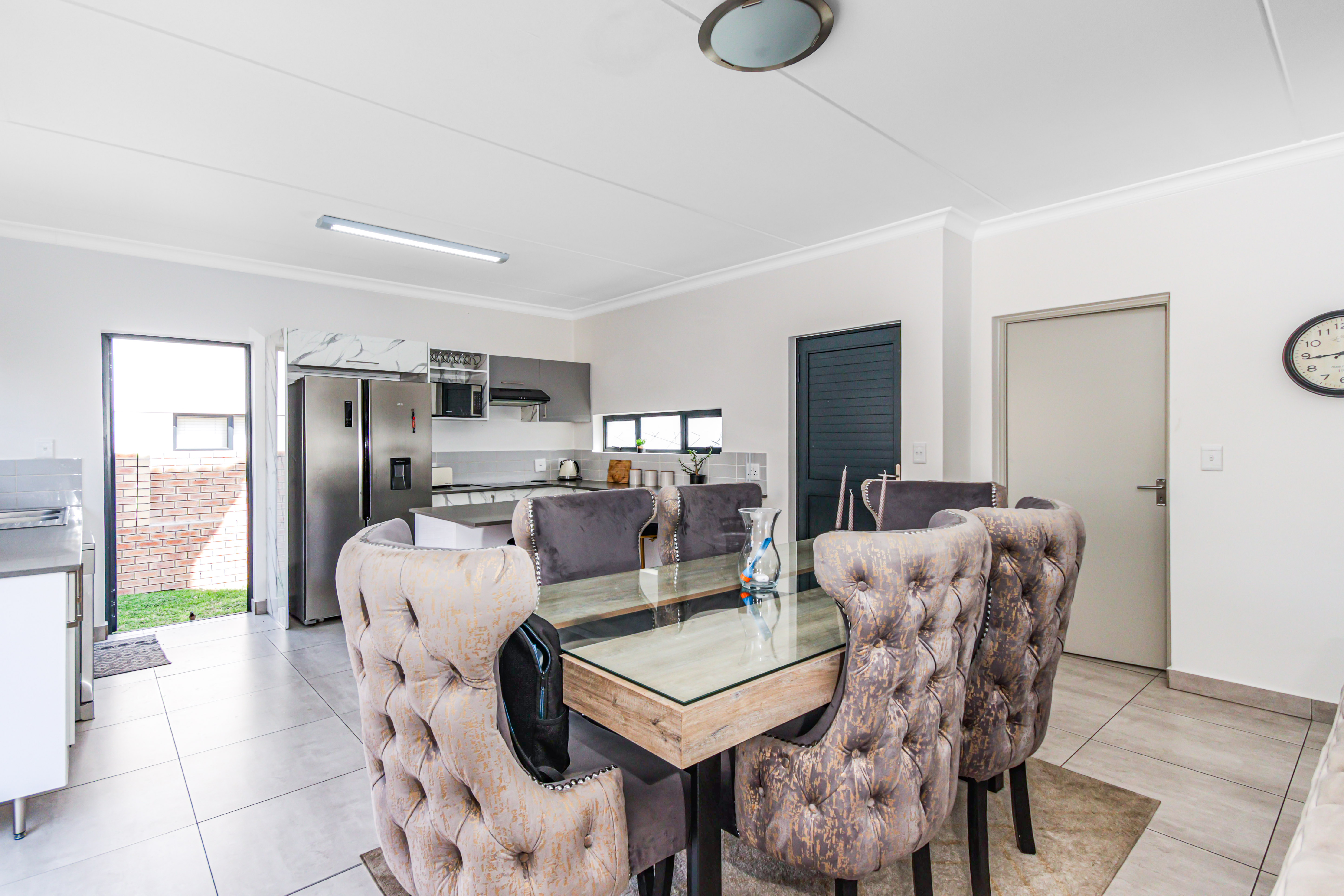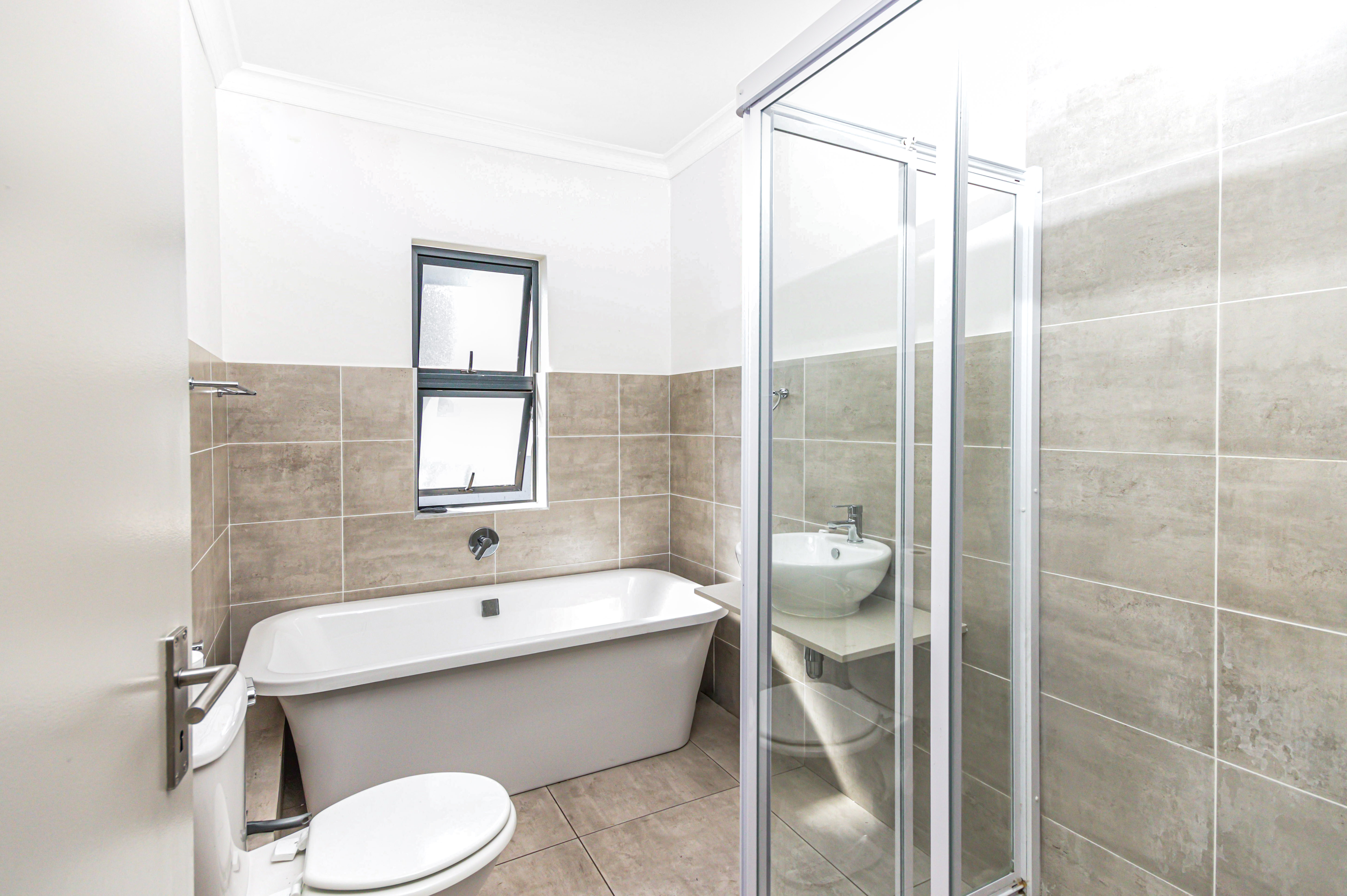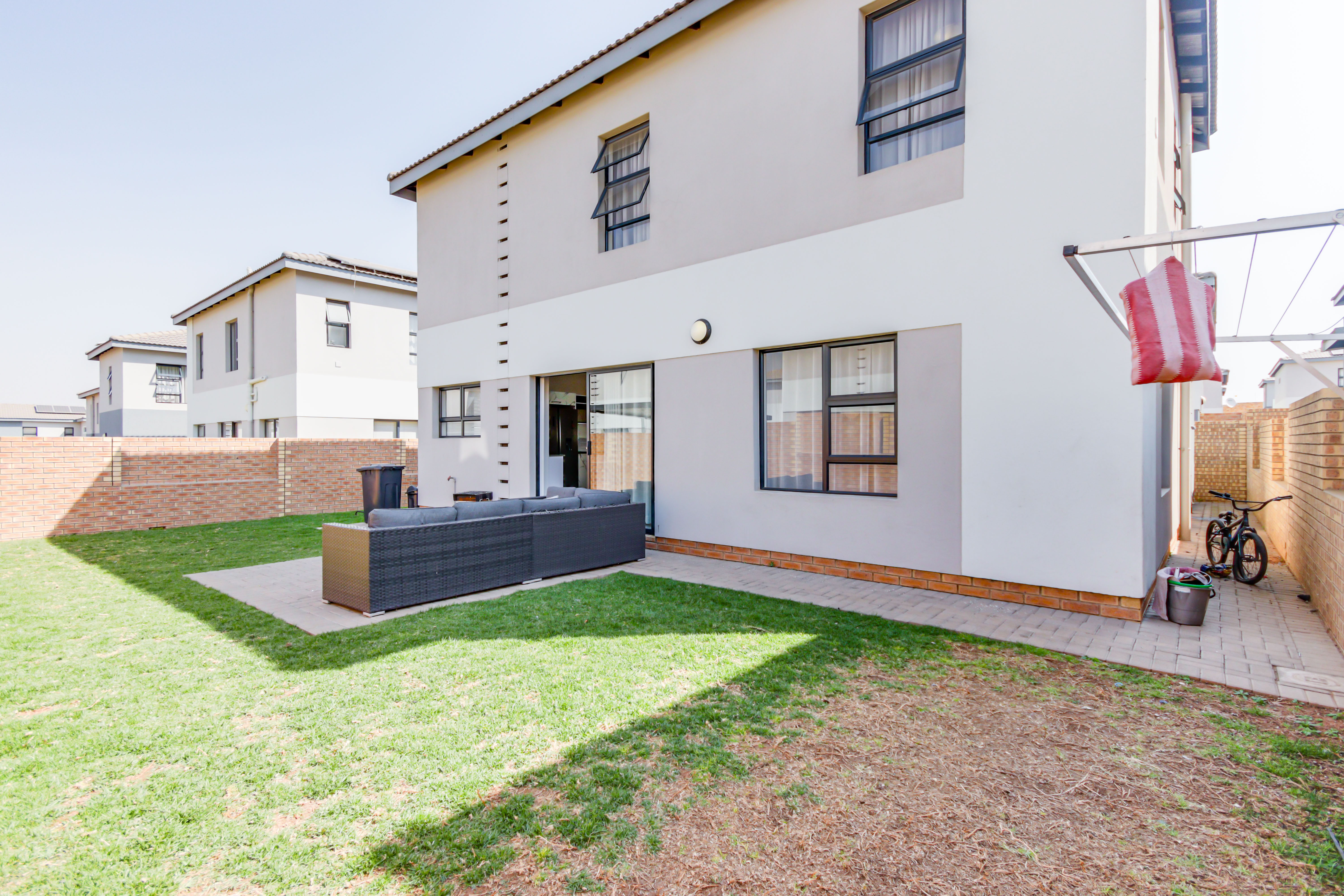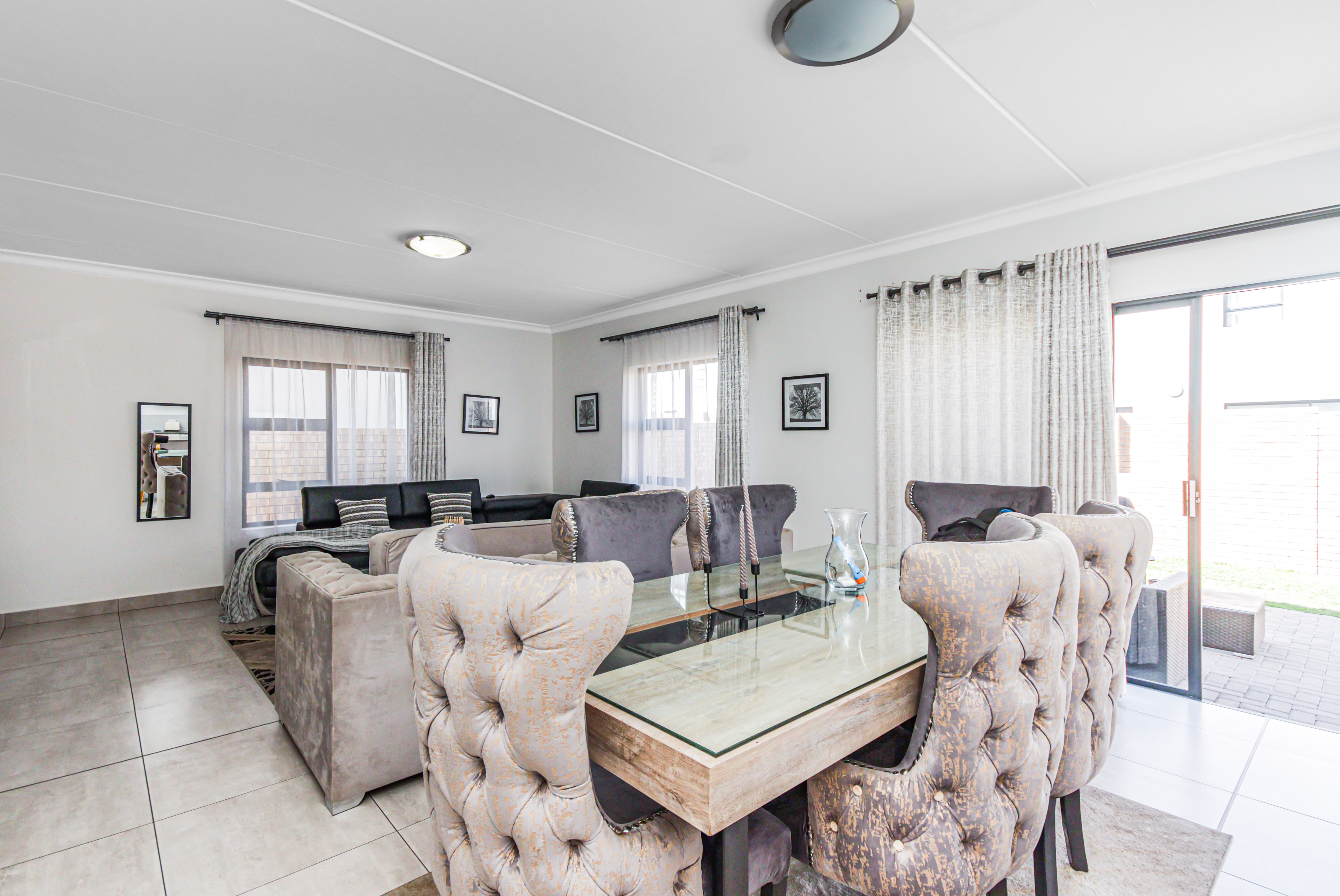 This exceptional two-story, ultra-modern home is located in the prestigious Thatchfield Ridge Estate, offering the perfect balance of elegance and comfort. Designed with family living in mind, it features three generously sized bedrooms. The master suite is a luxurious retreat, complete with a sleek en-suite bathroom and a contemporary shower. Thoughtfully designed with ample cupboard space throughout, the home ensures effortless organization and a clutter-free environment. The heart of the home is the stylish, modern kitchen, where form meets function. It includes space for two appliances and a double-door fridge, making meal prep and storage both practical and efficient. The open-plan layout connects seamlessly to the dining area, spacious enough for an 8-seater table, creating an inviting space for family meals and entertaining. The expansive lounge offers the ideal setting for relaxation and socializing. Outside, a well-maintained garden surrounds the home, providing a peaceful sanctuary for gardening, outdoor activities, or simply enjoying the natural beauty. The property is equipped with full solar power backup and a solar geyser, ensuring an uninterrupted energy supply while promoting eco-friendly, cost-efficient living. This meticulously designed double-story home in Thatchfield Ridge Estate epitomizes contemporary living, combining style and functionality for the modern family. Its focus on sustainability through solar power highlights its commitment to both comfort and environmentally conscious living.