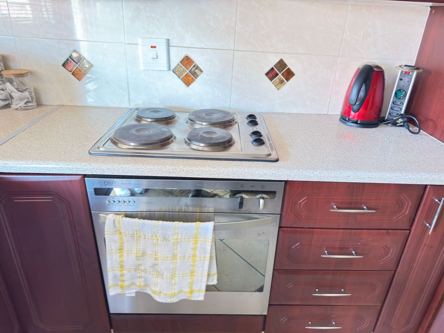 Fully fitted kitchen with built-in cupboards, a four-plate electric stove, and