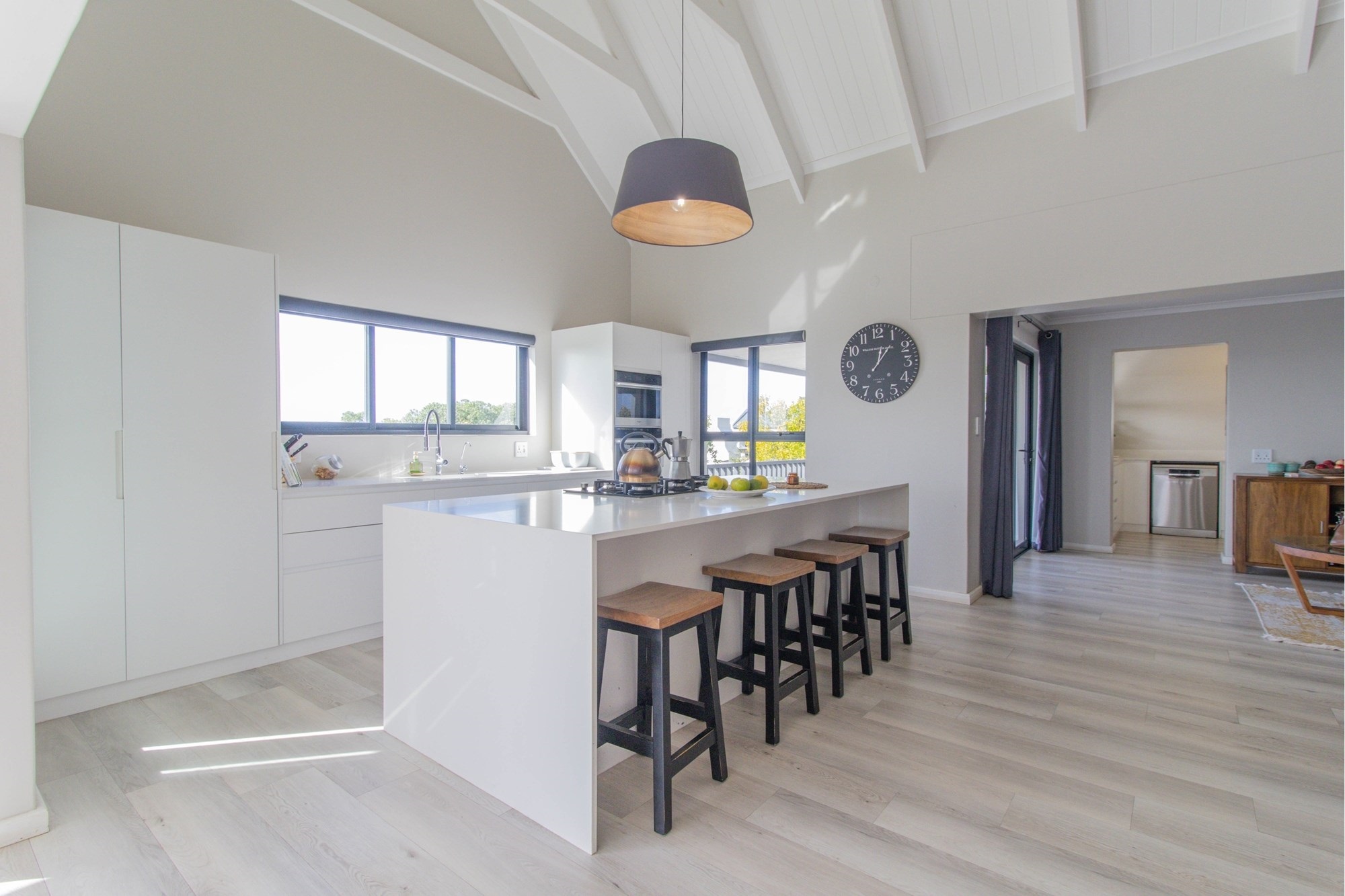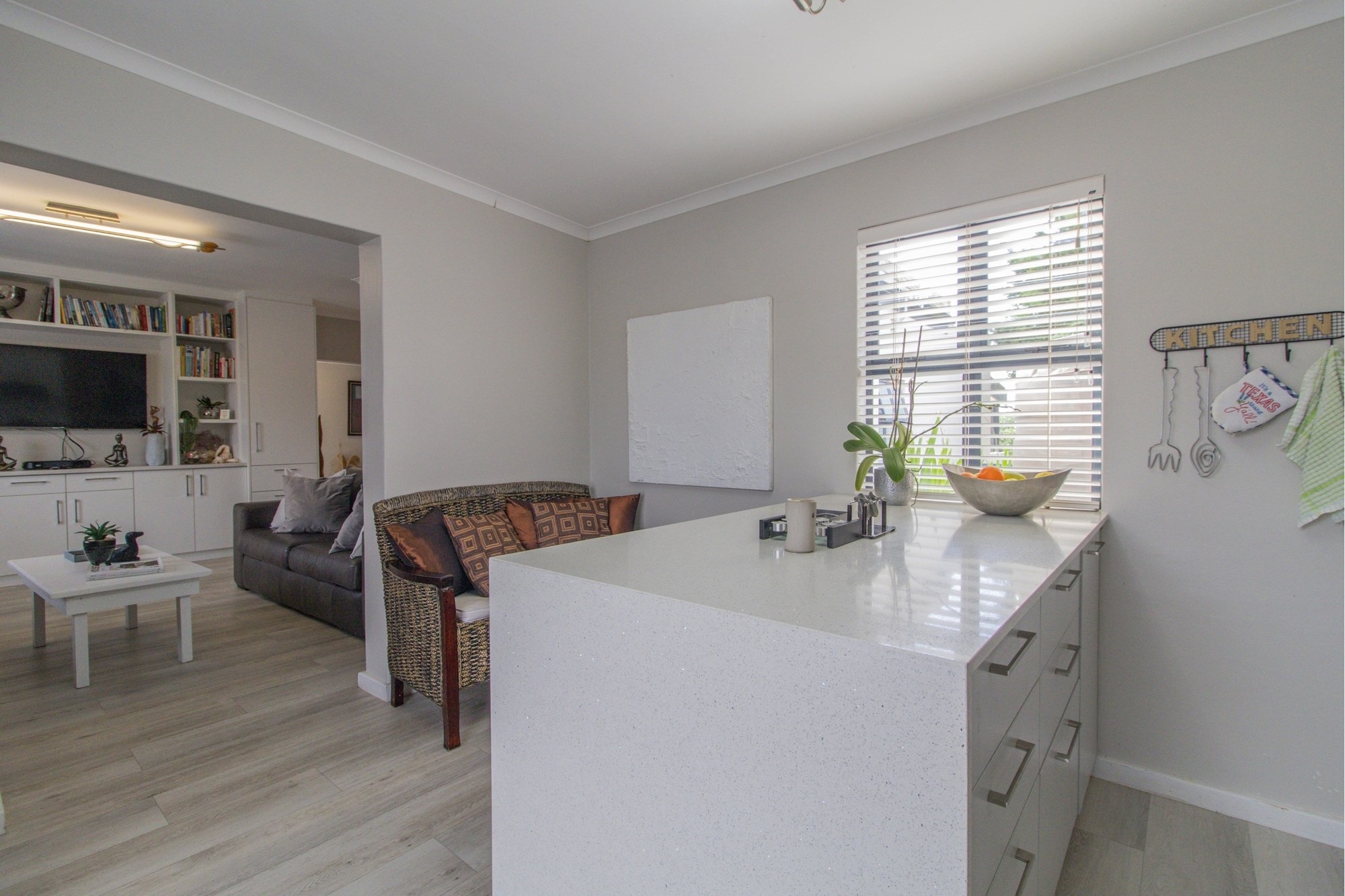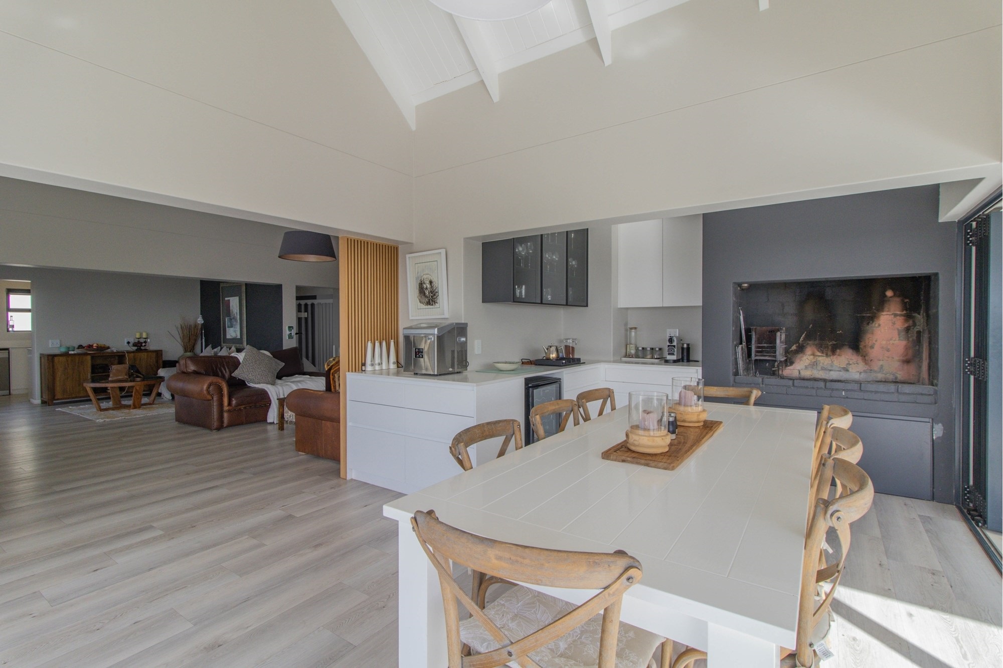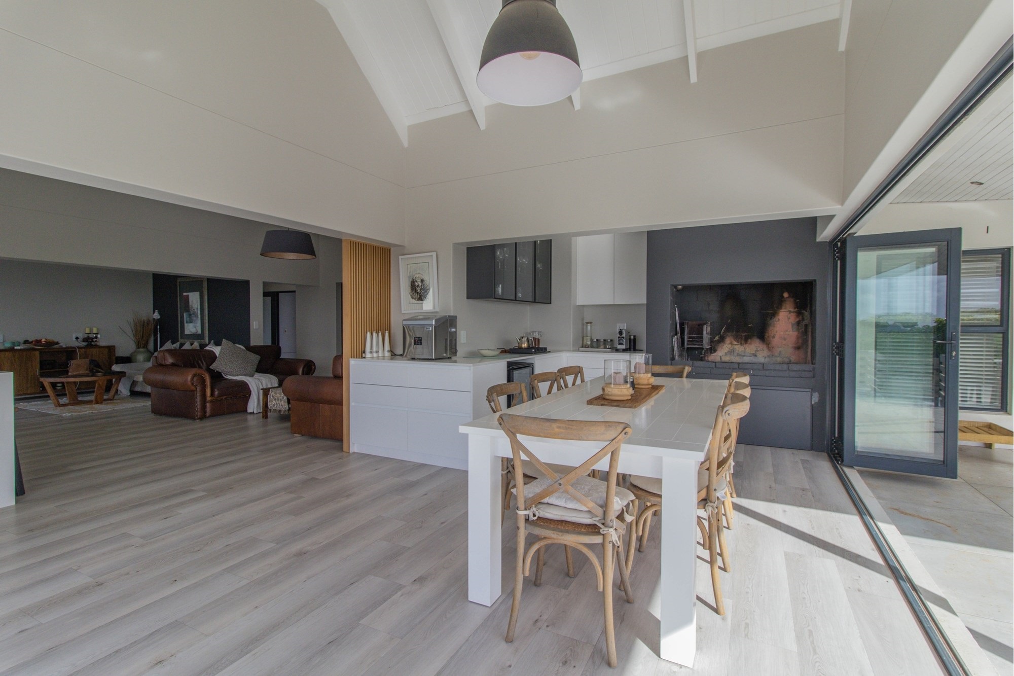 Open-plan lounge and kitchen with separate scullery
