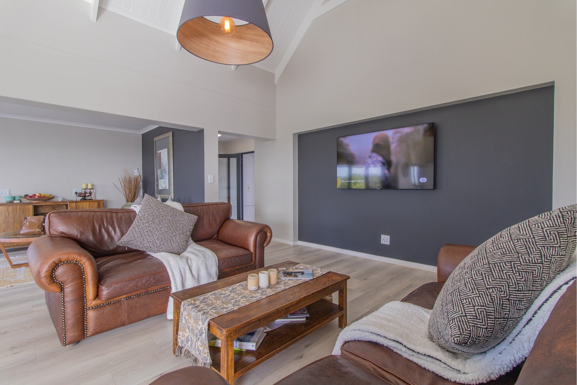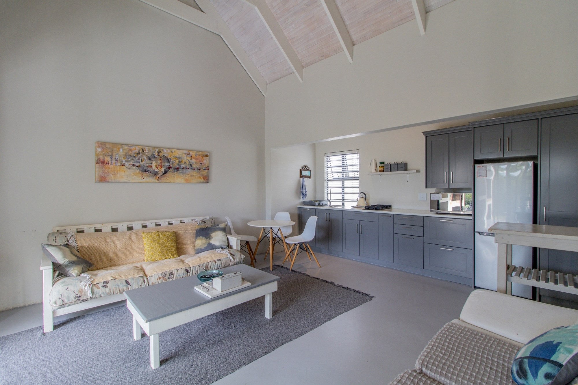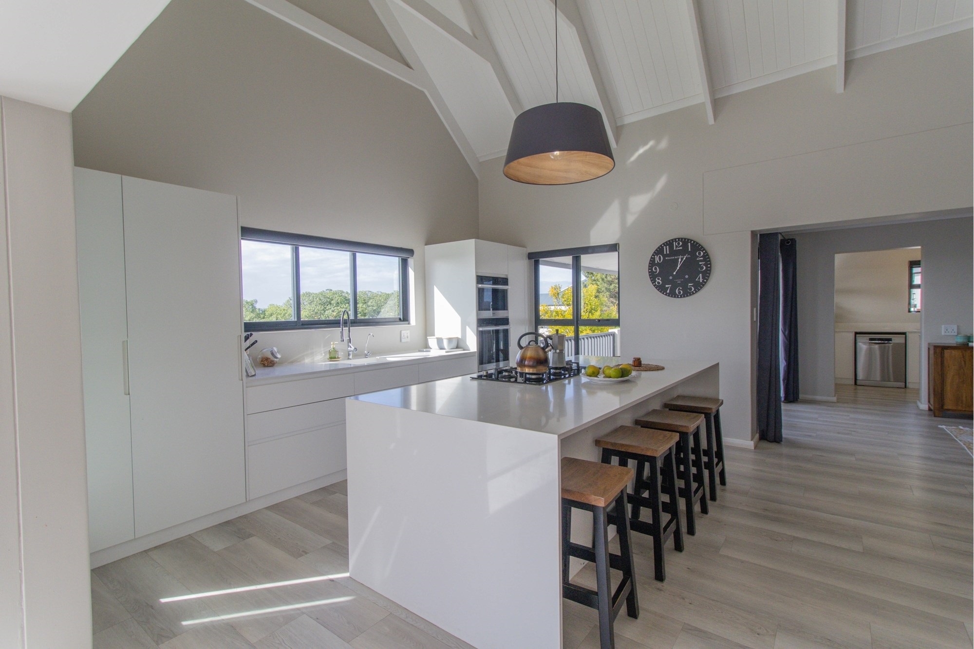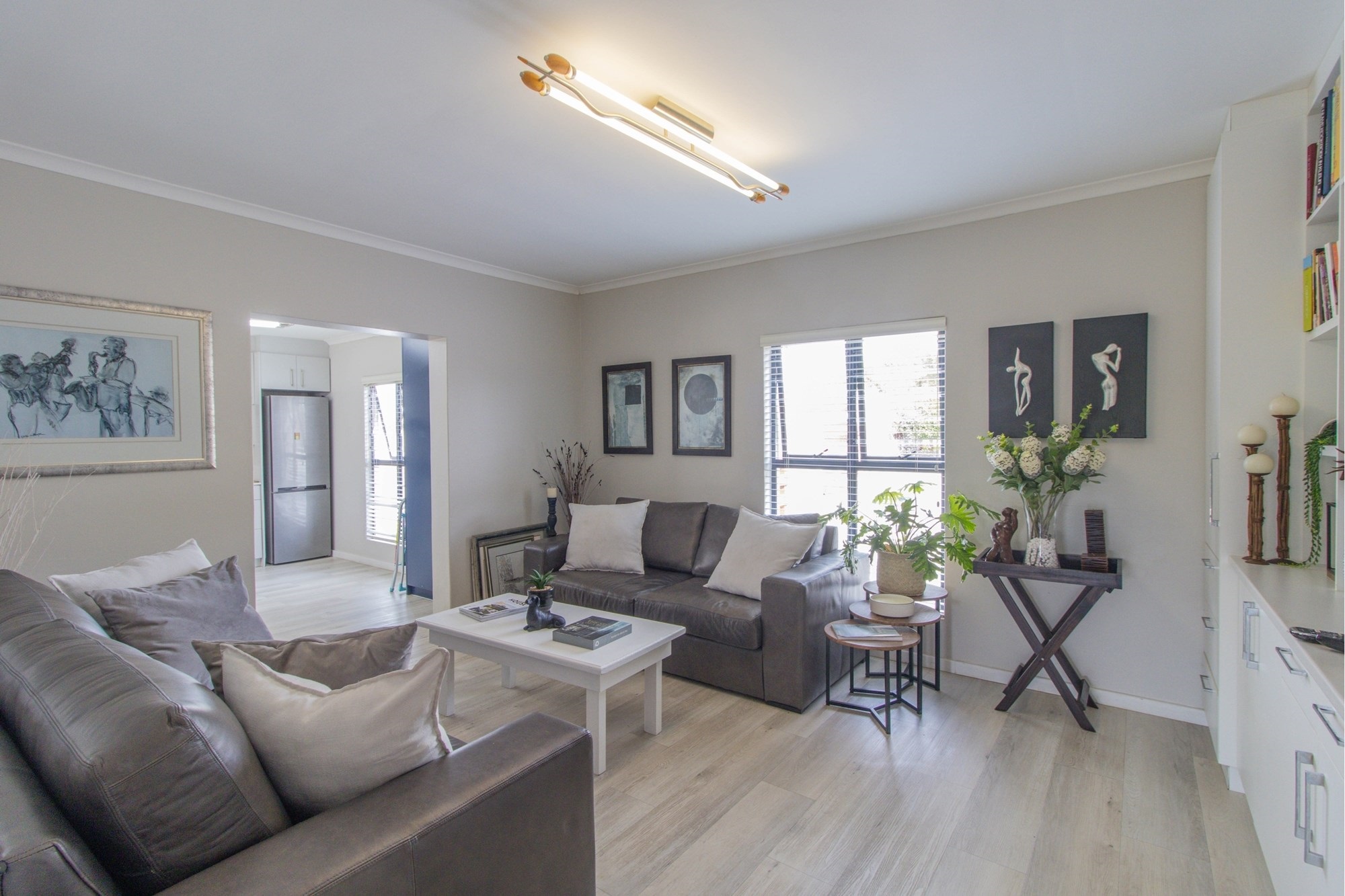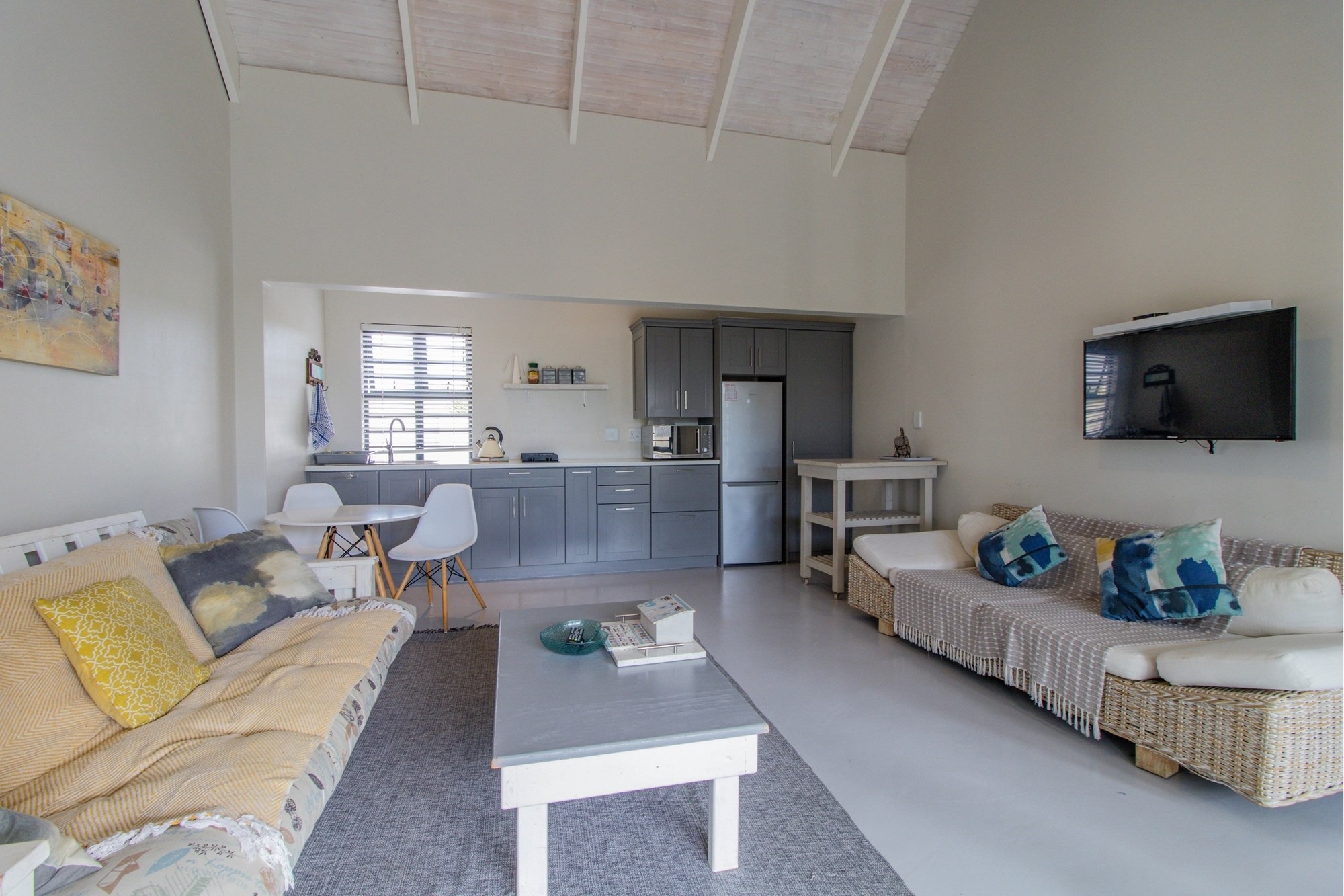Open-plan lounge and kitchen with separate scullery