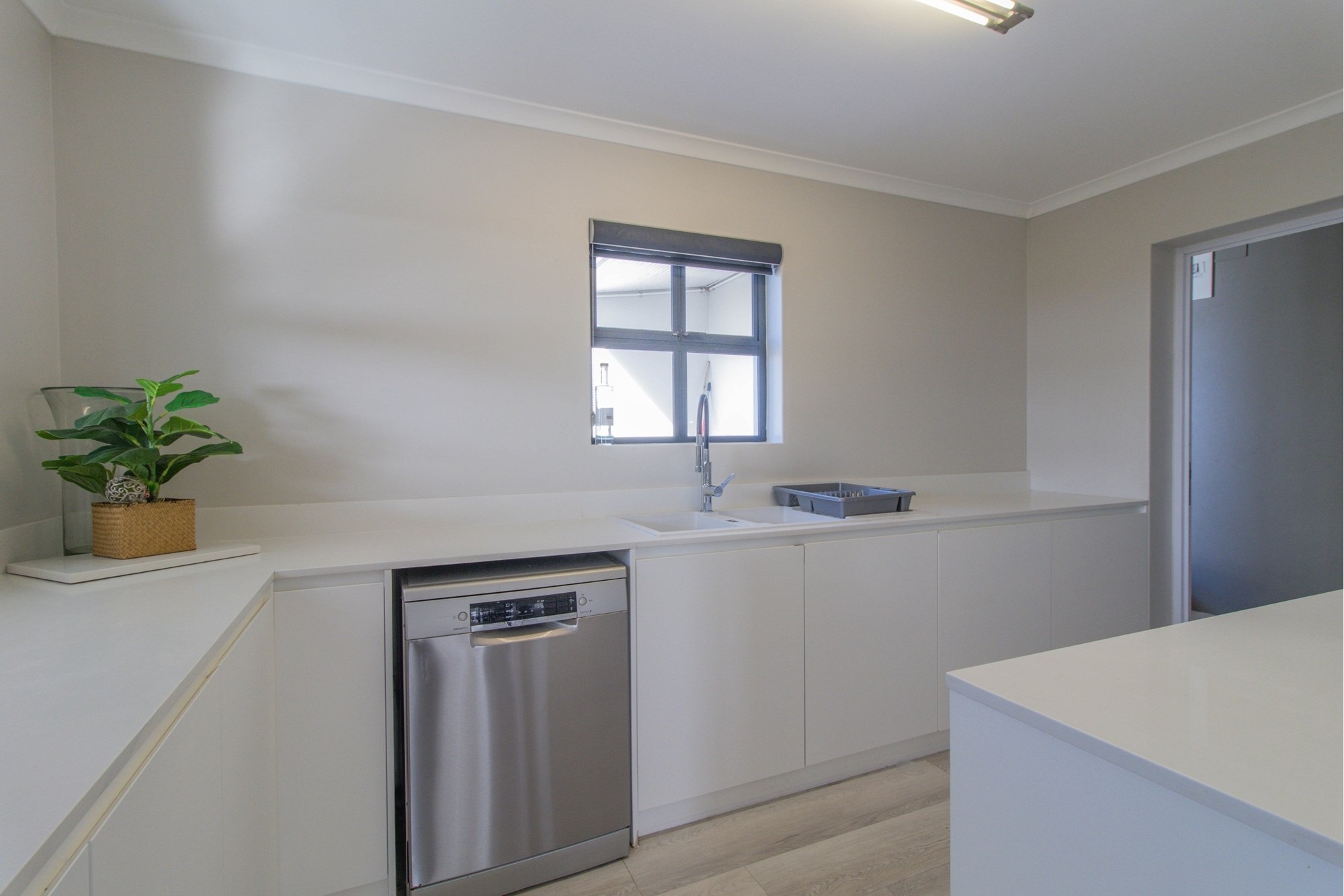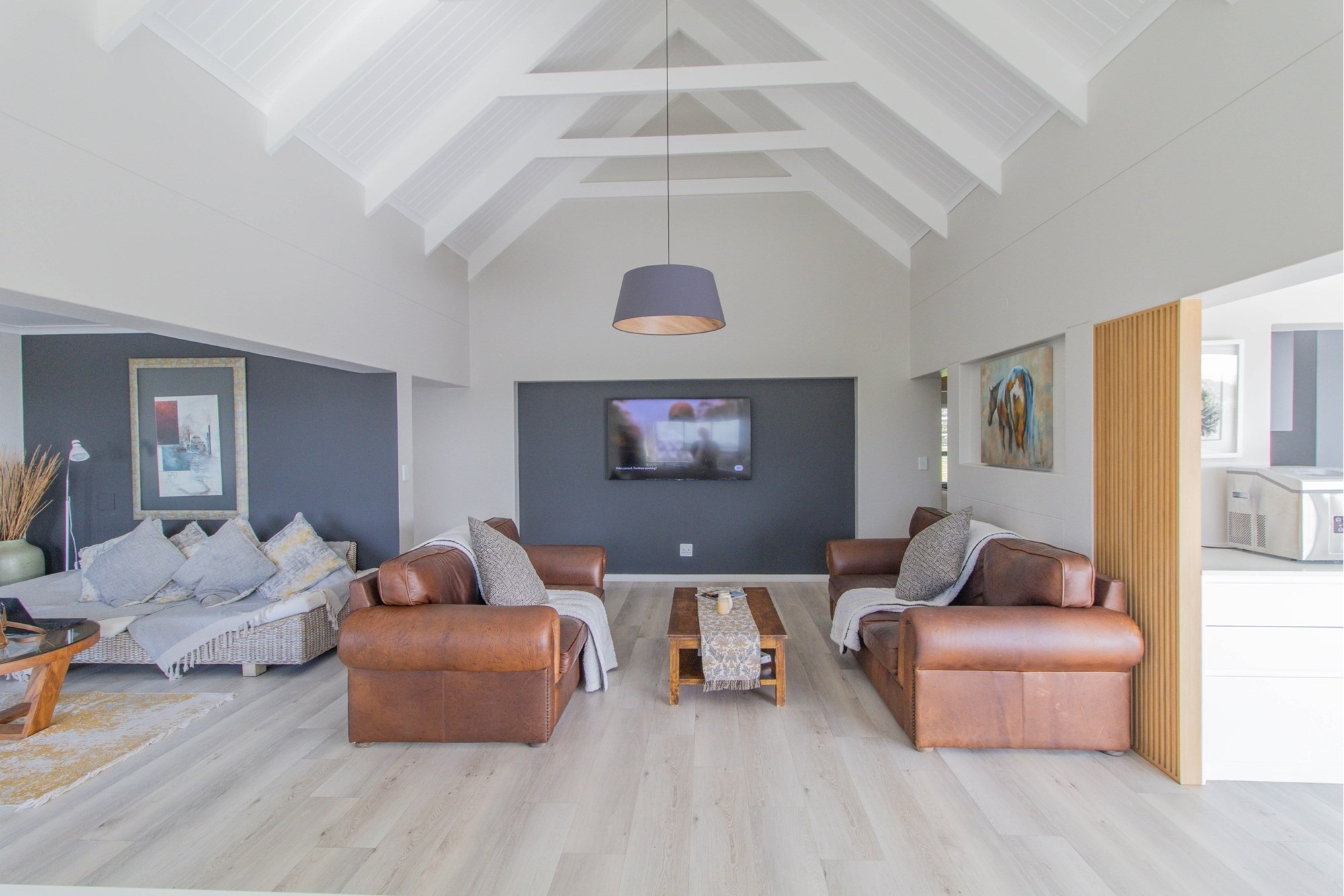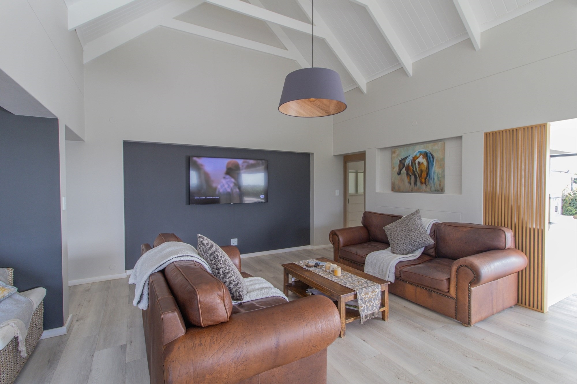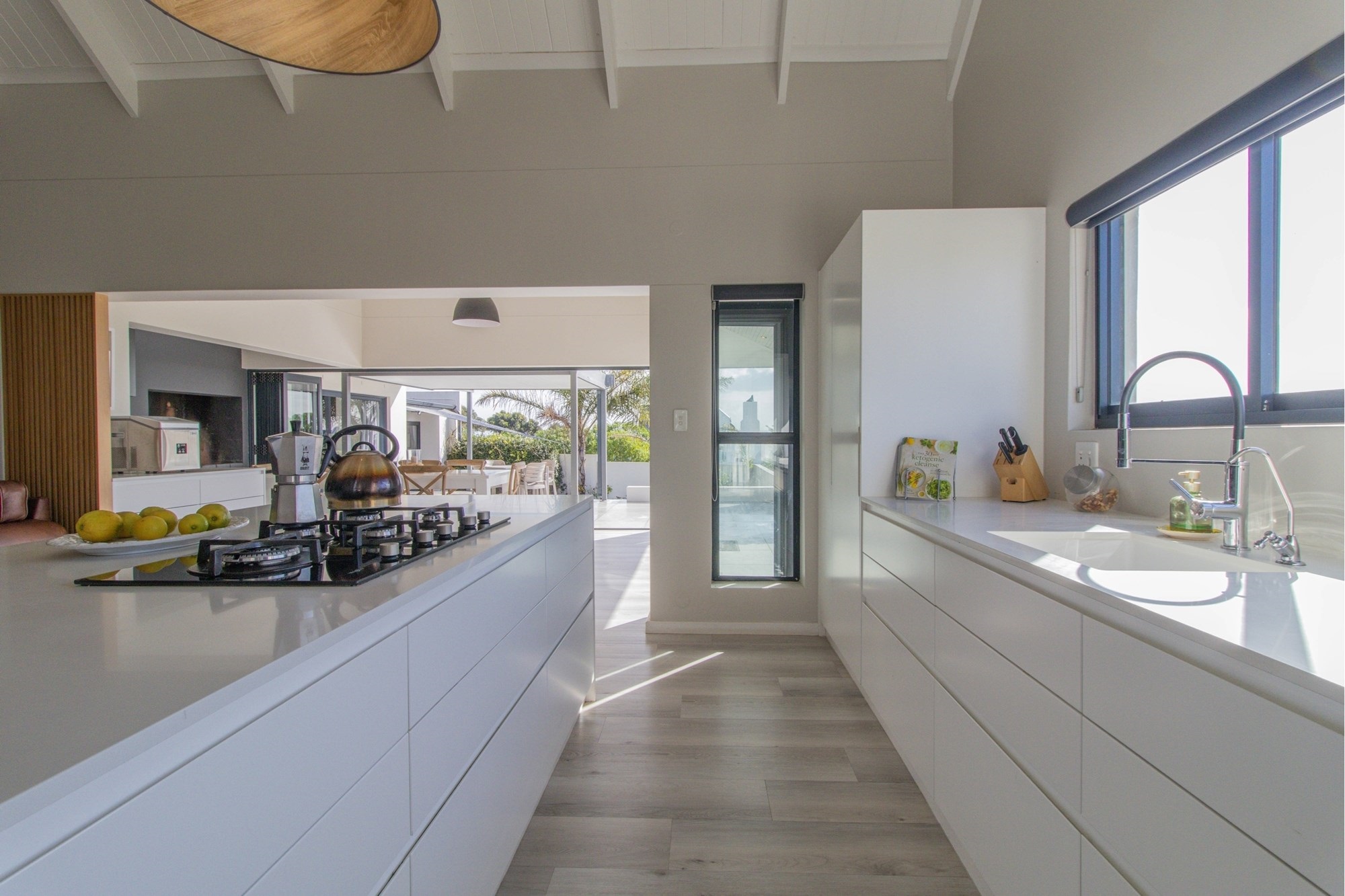 Open-plan lounge and kitchen with separate scullery