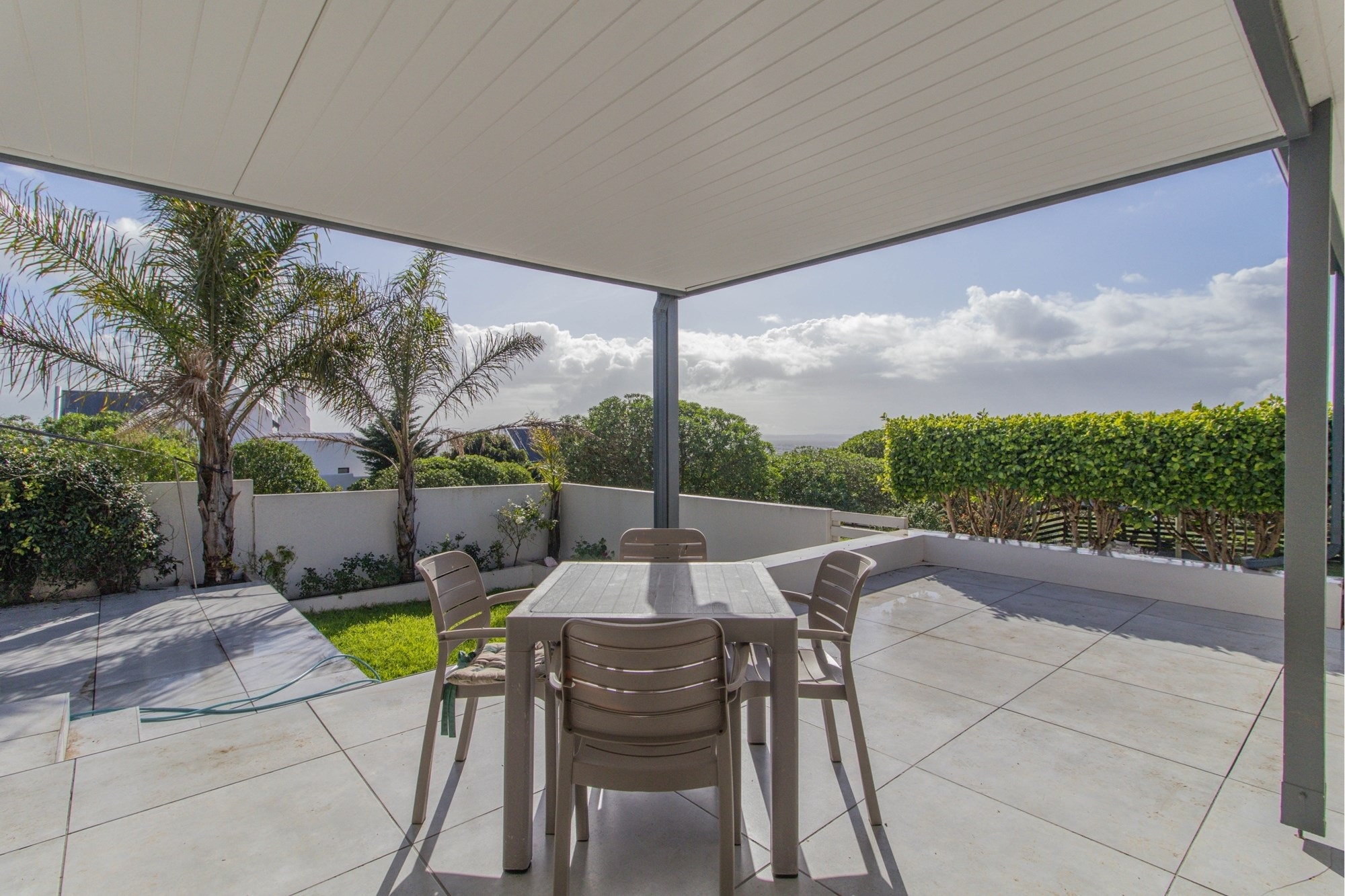 Covered patio overlooking a thriving vegetable garden