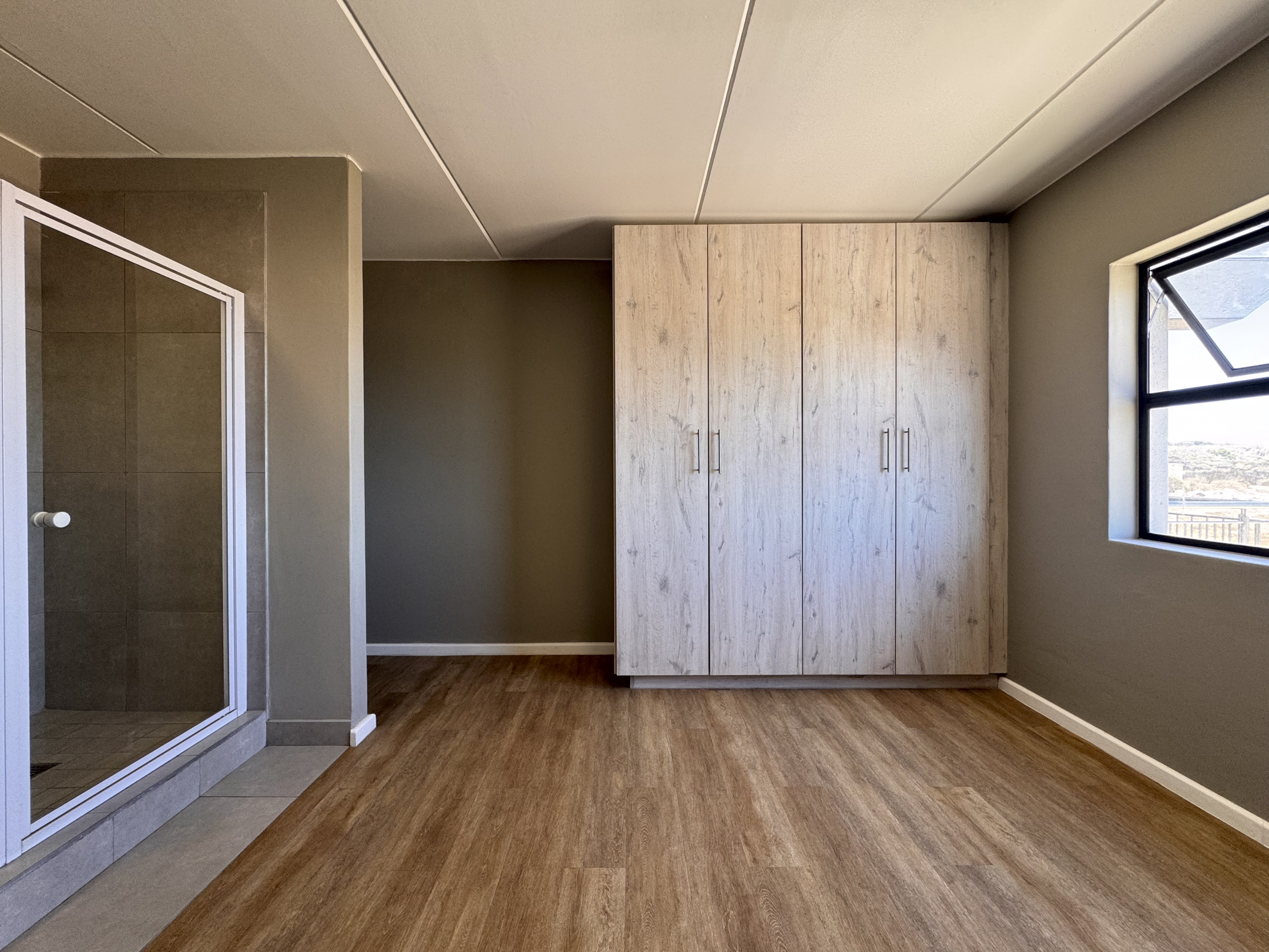 The apartment features beautiful vinyl flooring throughout, creating a clean, modern aesthetic that is both durable and easy to maintain. The open-plan kitchen is thoughtfully designed with a centre island, integrated appliances, Caesarstone countertops, and modern built-in cupboards, offering both elegance and practicality. A stainless-steel built-in indoor braai adds a unique entertainment feature — perfect for year-round gatherings.