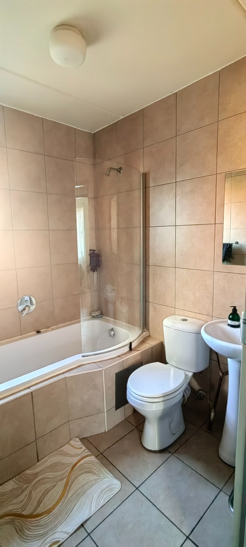 The modern bathroom features convenient amenities, including a shower, bathtub, basin, toilet, and sink, ensuring comfort and functionality.
