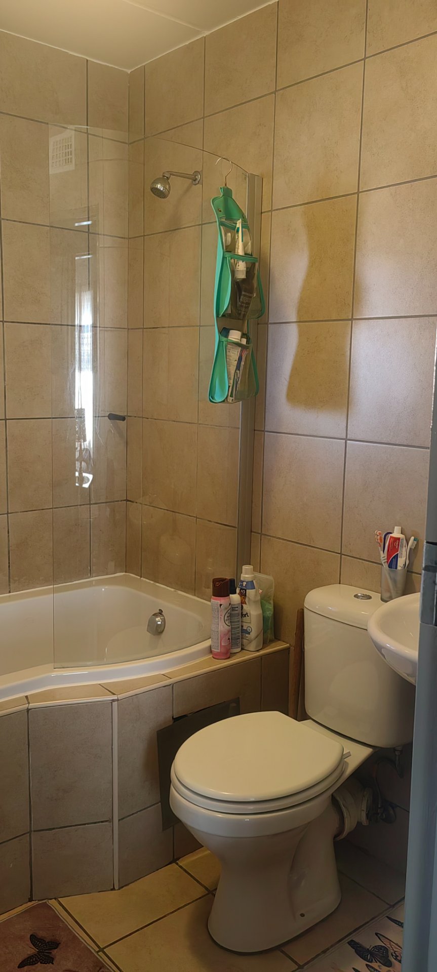 The modern bathroom features convenient amenities, including a shower, bathtub, basin, toilet, and sink, ensuring comfort and functionality.