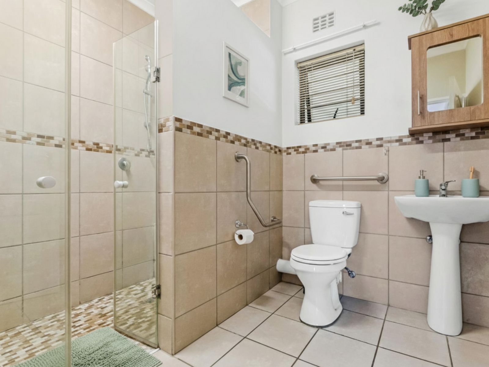 Comfort & Safety: The bathroom is designed for longevity, featuring a shower equipped with a handrail and seating option.