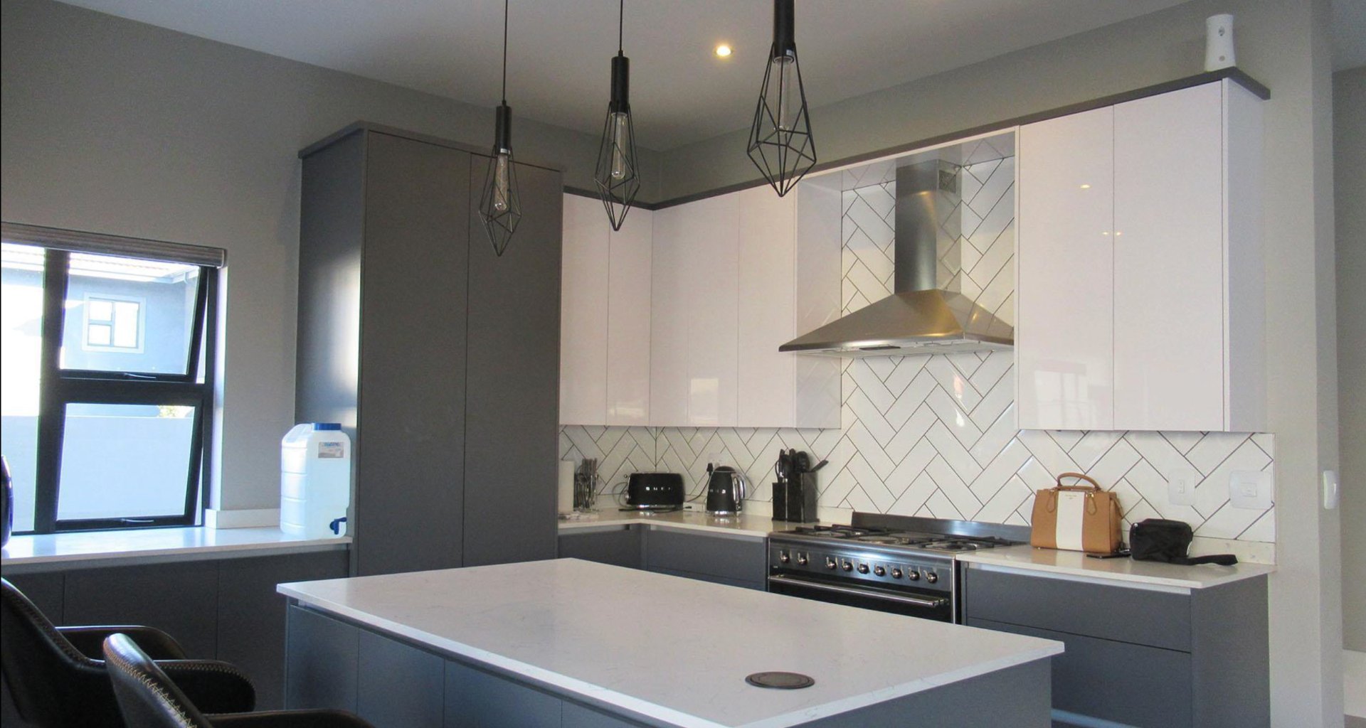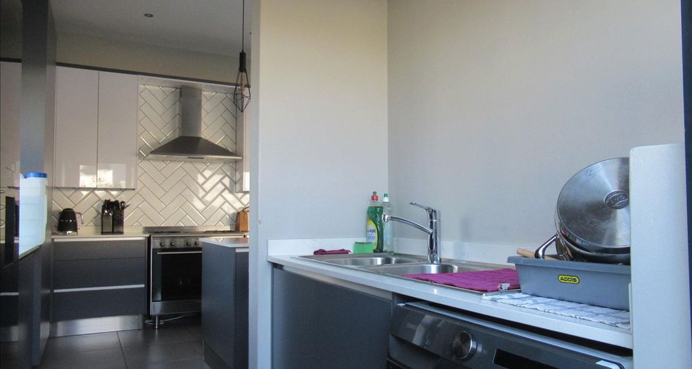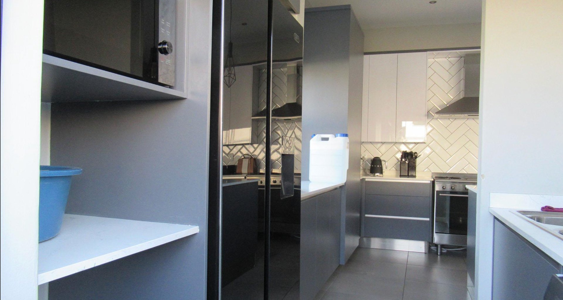 Modern kitchen with newly renovated finishes, ample cupboard space, and a scullery that accommodates a double-door fridge.