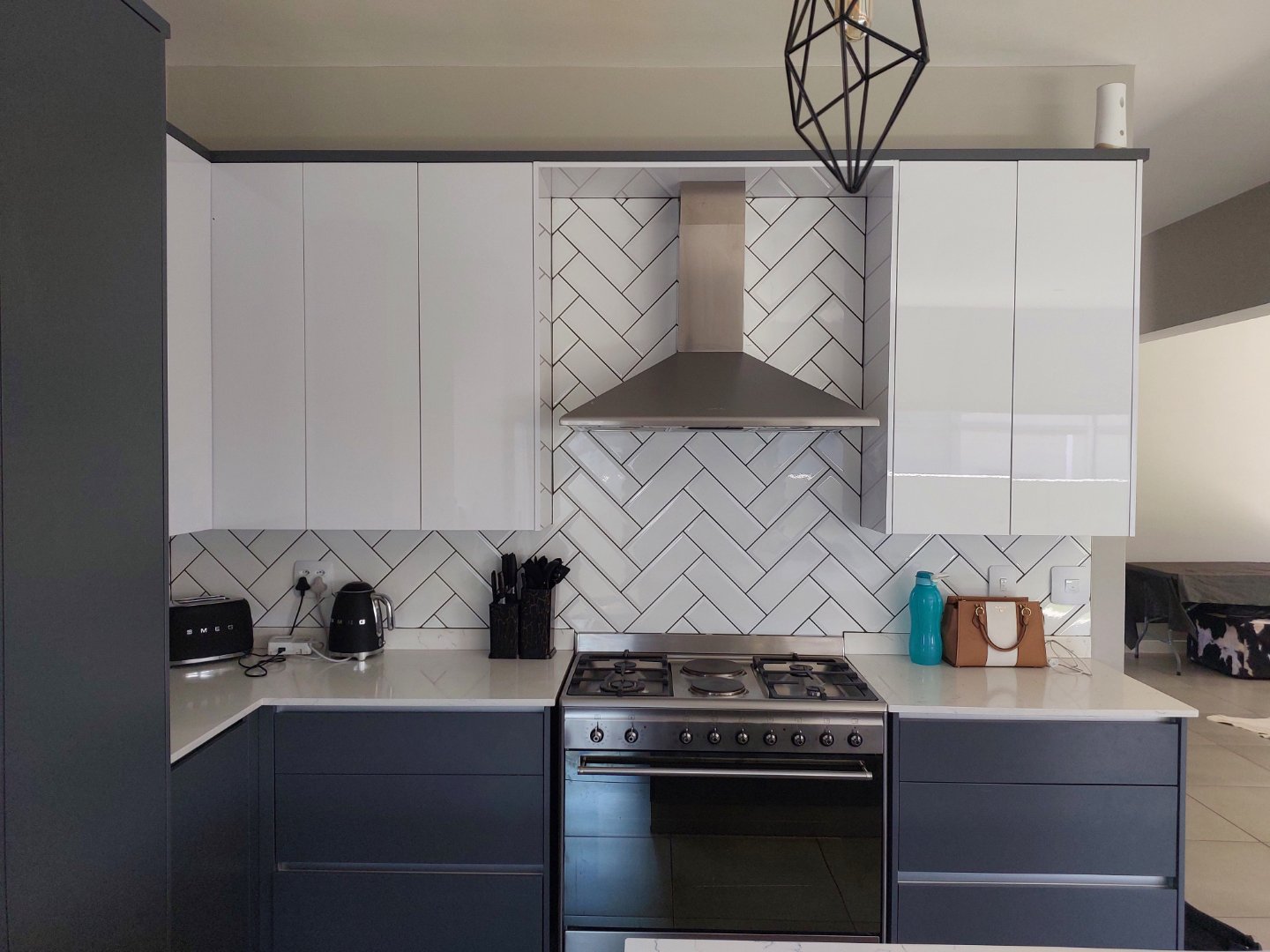 The spacious open-plan living and entertainment area features large stacker doors that flow seamlessly onto the garden and private jacuzzi—ideal for relaxed indoor-outdoor living. The gourmet kitchen is beautifully finished with Quartz countertops, a central island, gas hob with extractor, and a separate scullery accommodating a double-door fridge and two under-counter appliances.