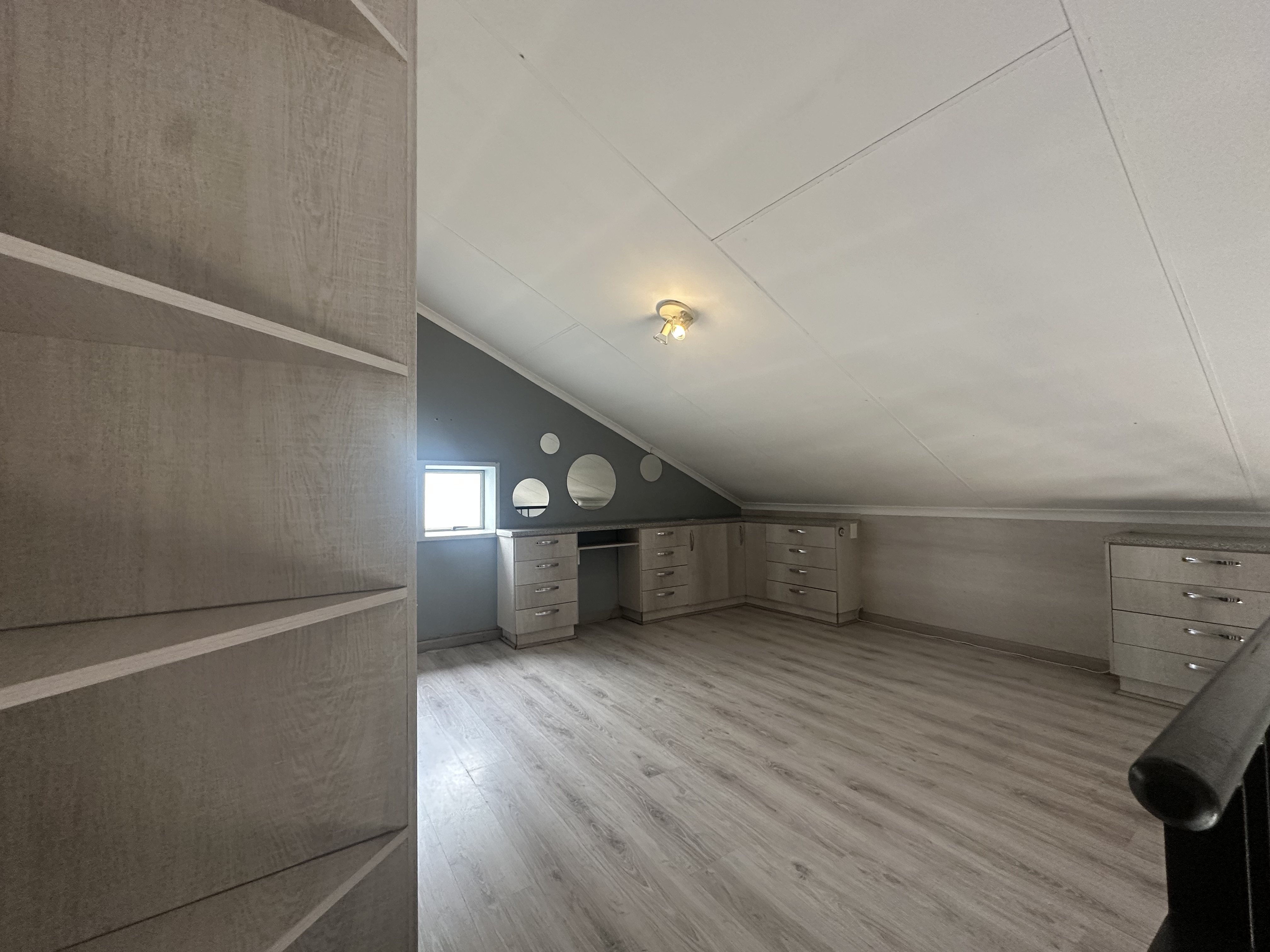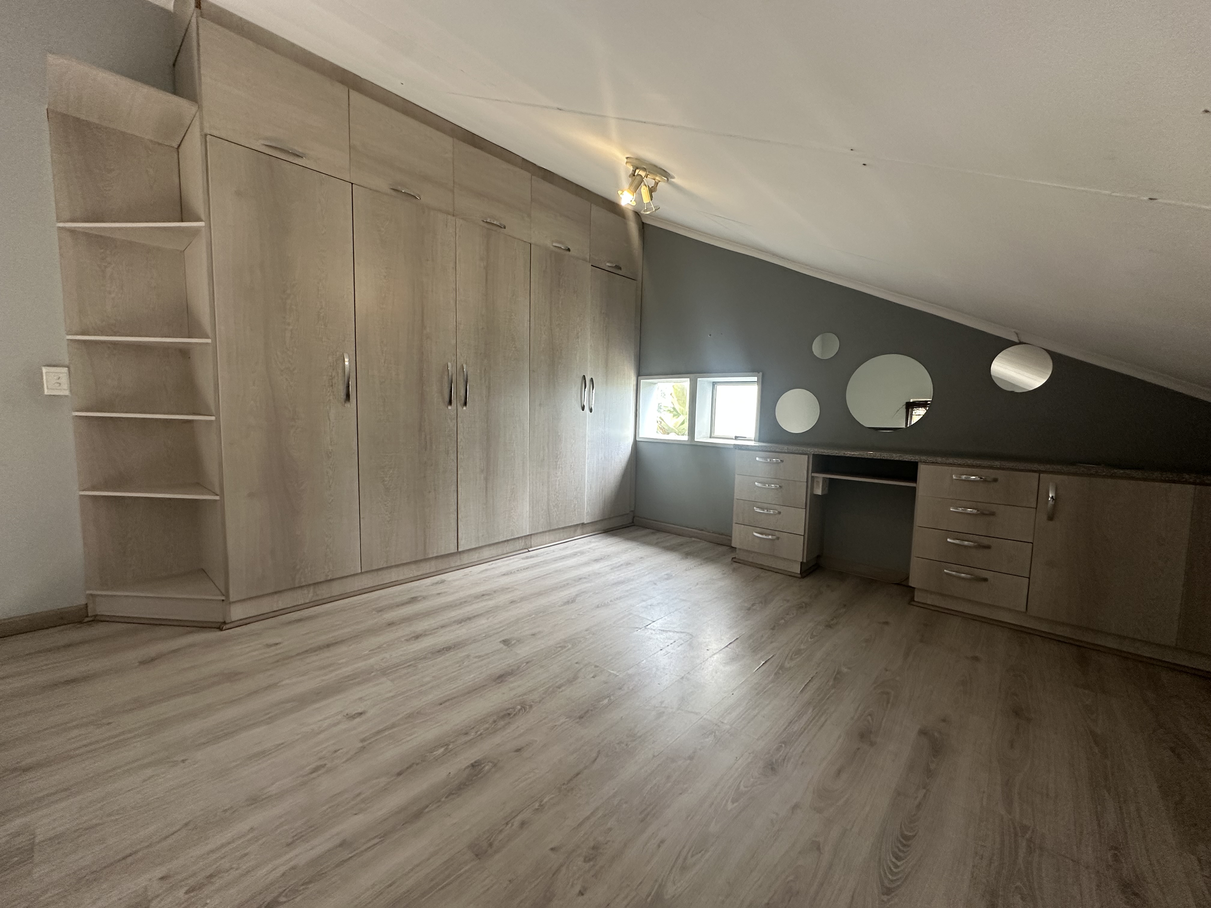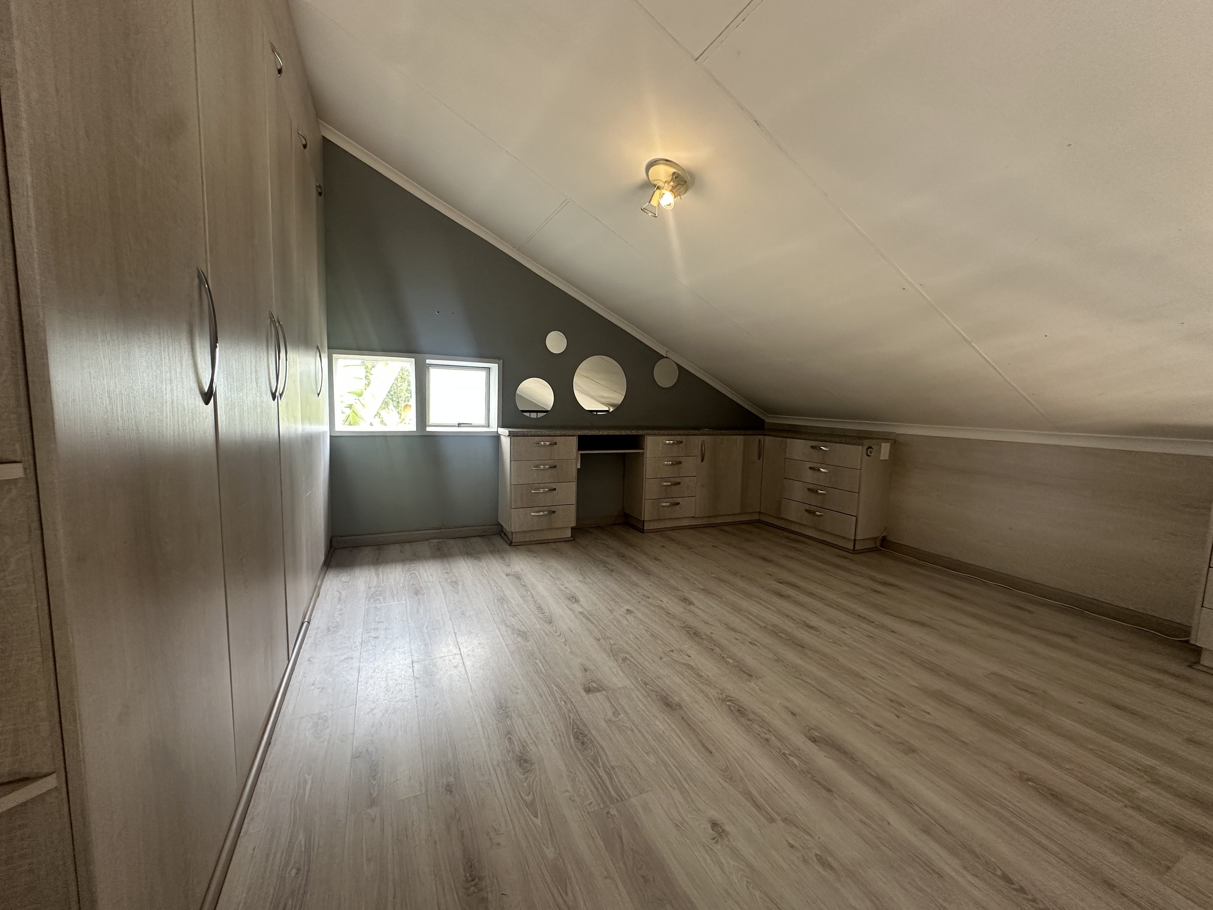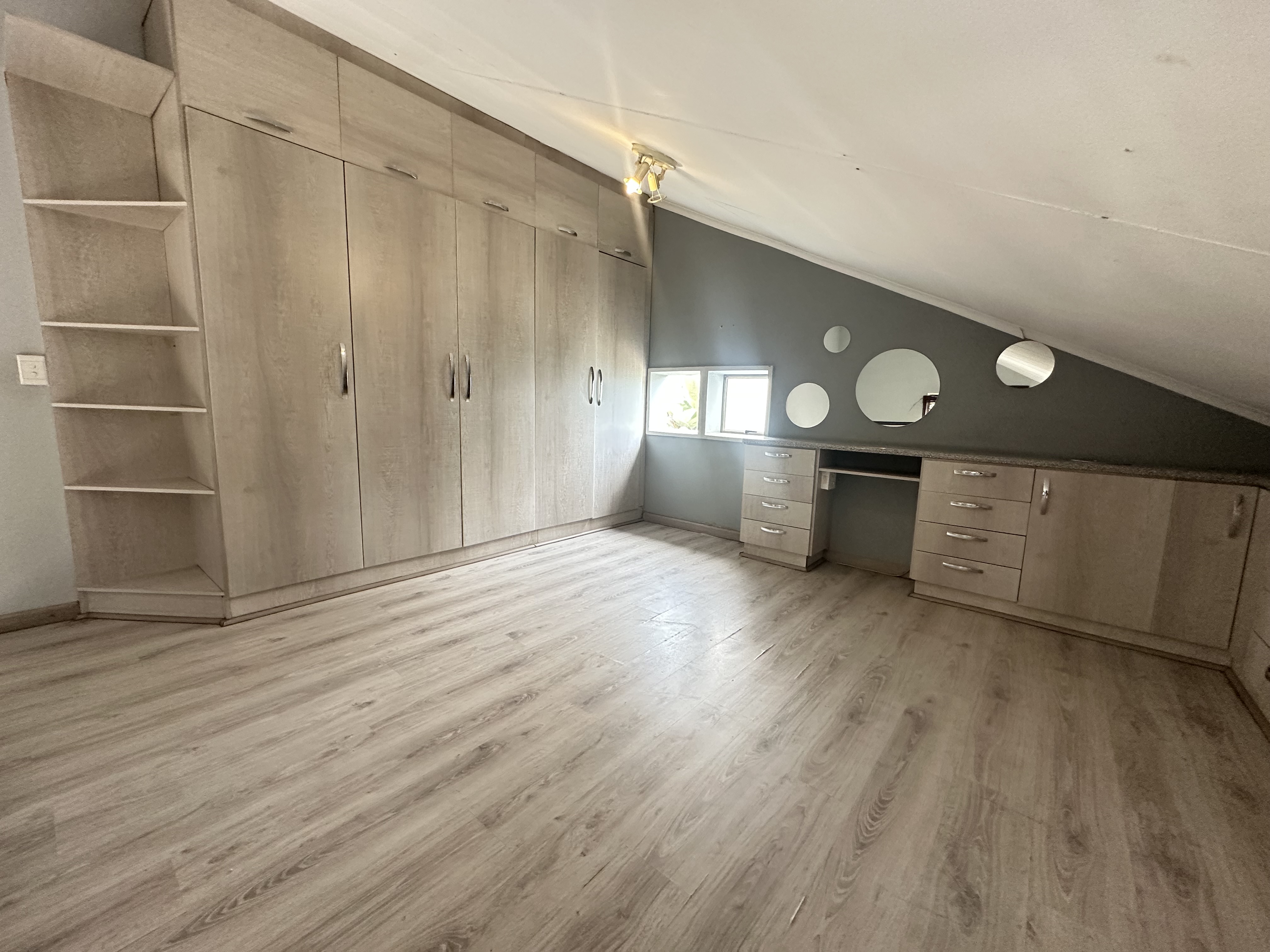 Upstairs bedroom is a loft with built in cupboards for a double or queen size bed, with built in cupboards.