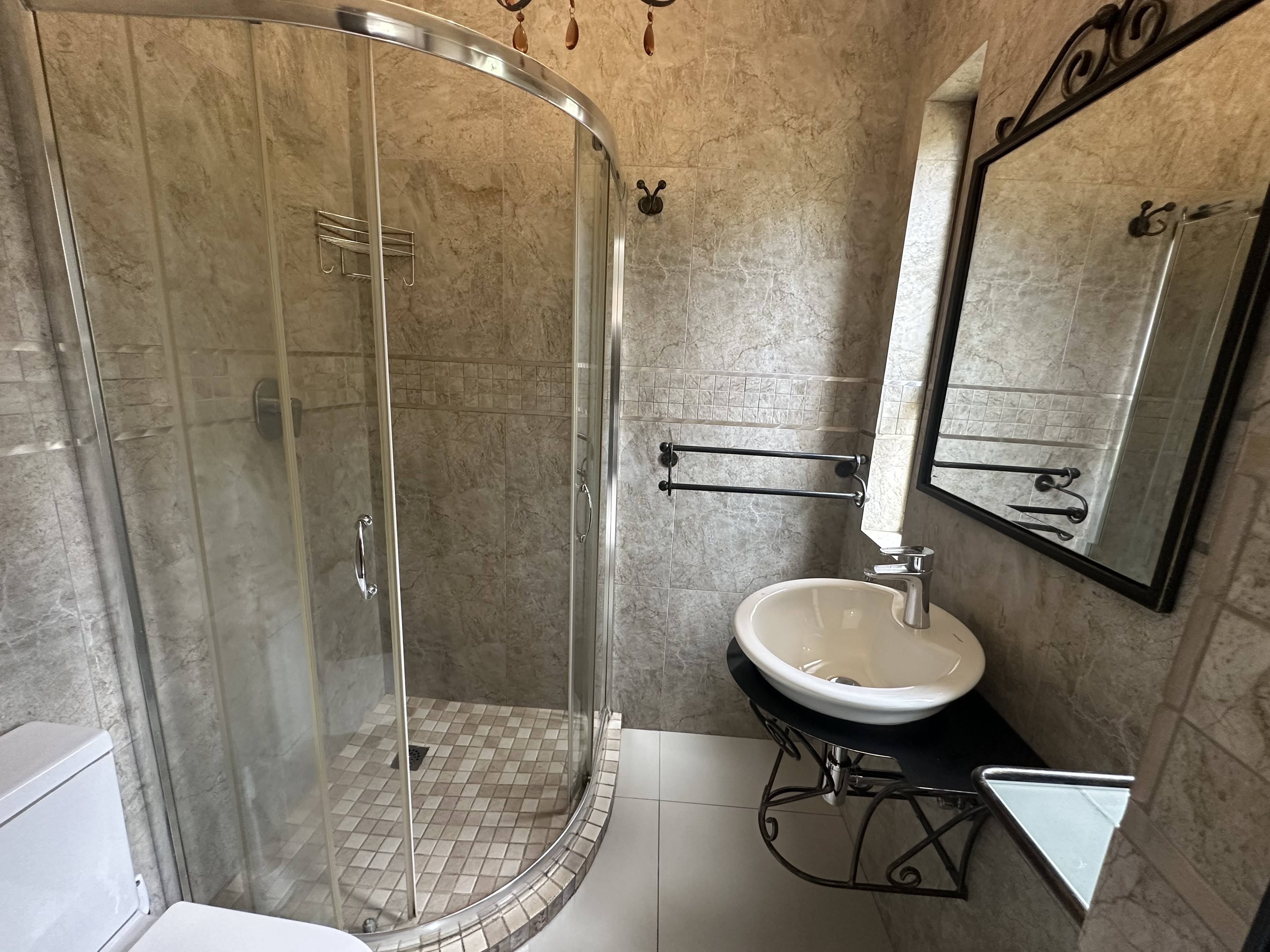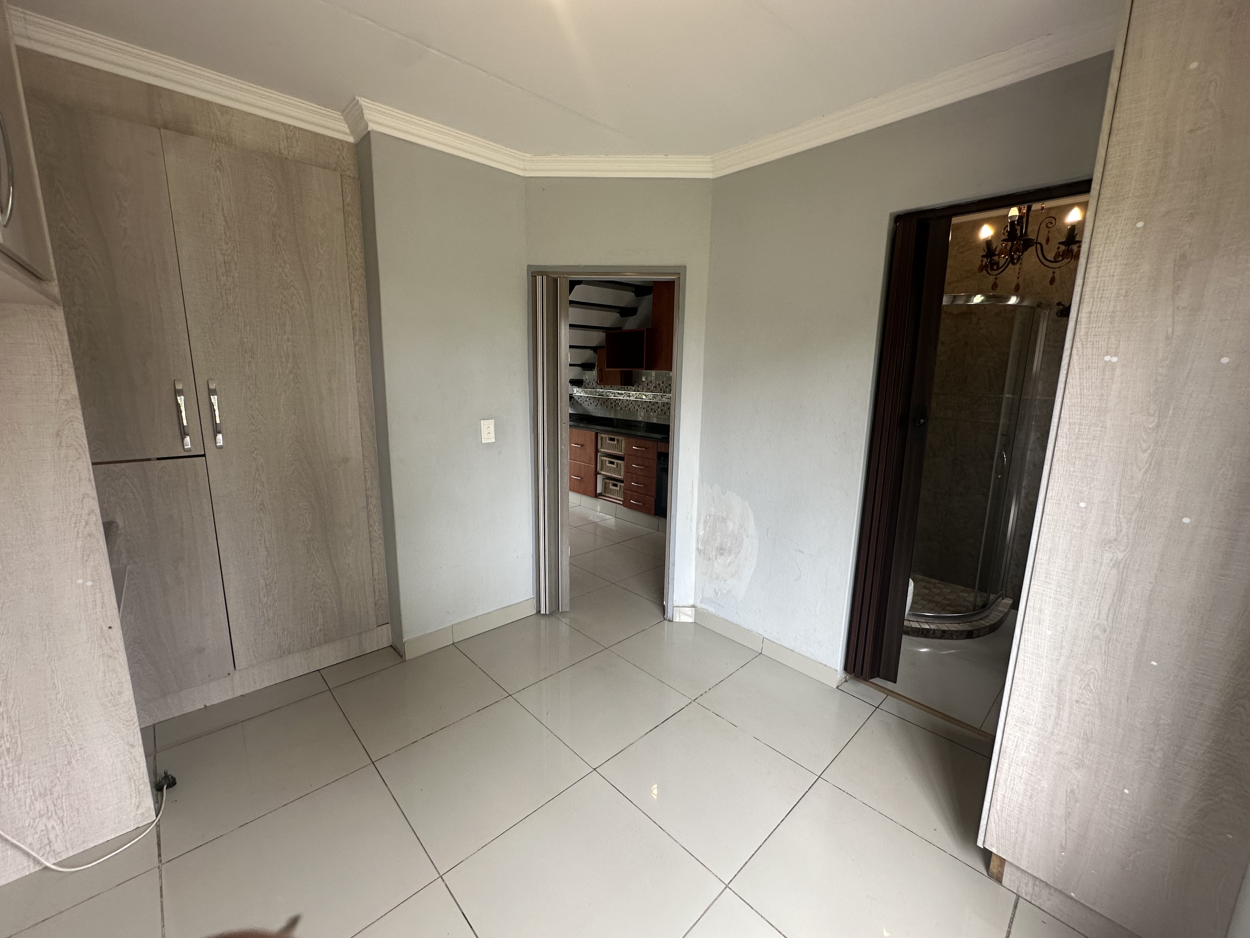 The main bedroom is downstairs with built in cupboards and en-suite bathroom is neat and features a shower and toilet.