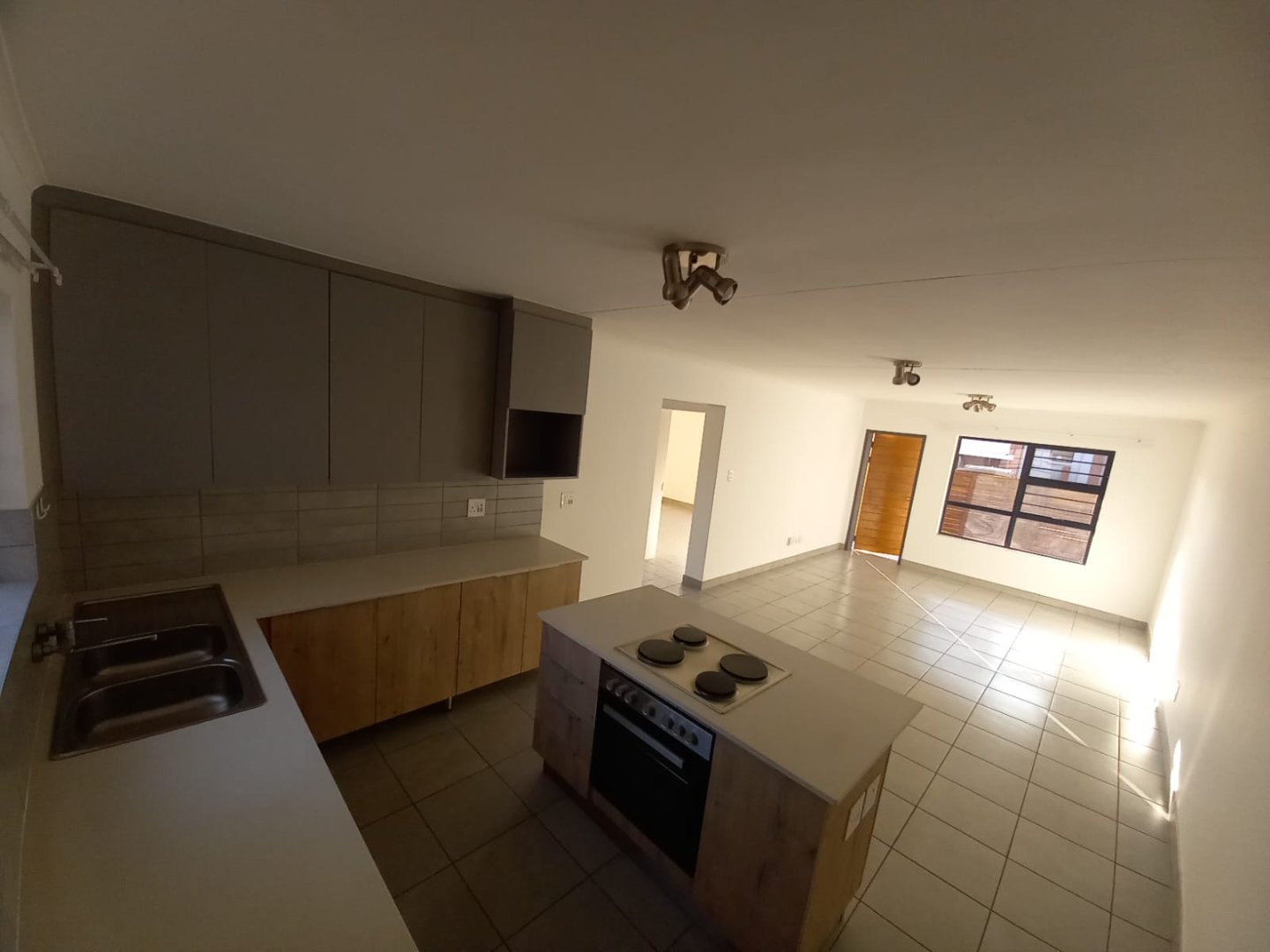 Open plan kitchen with an island and lounge area, lots of cupboards with hob and electrical stove