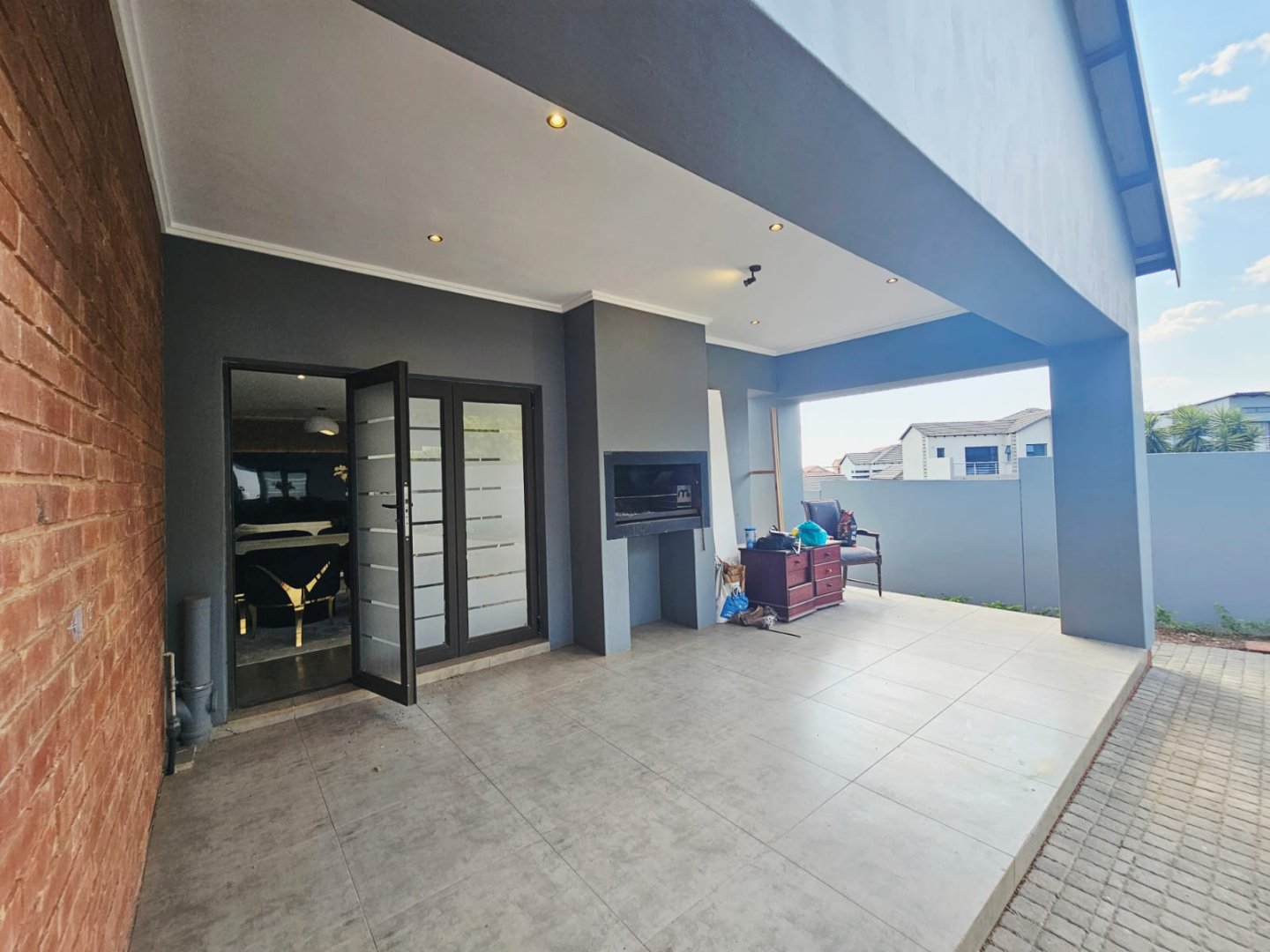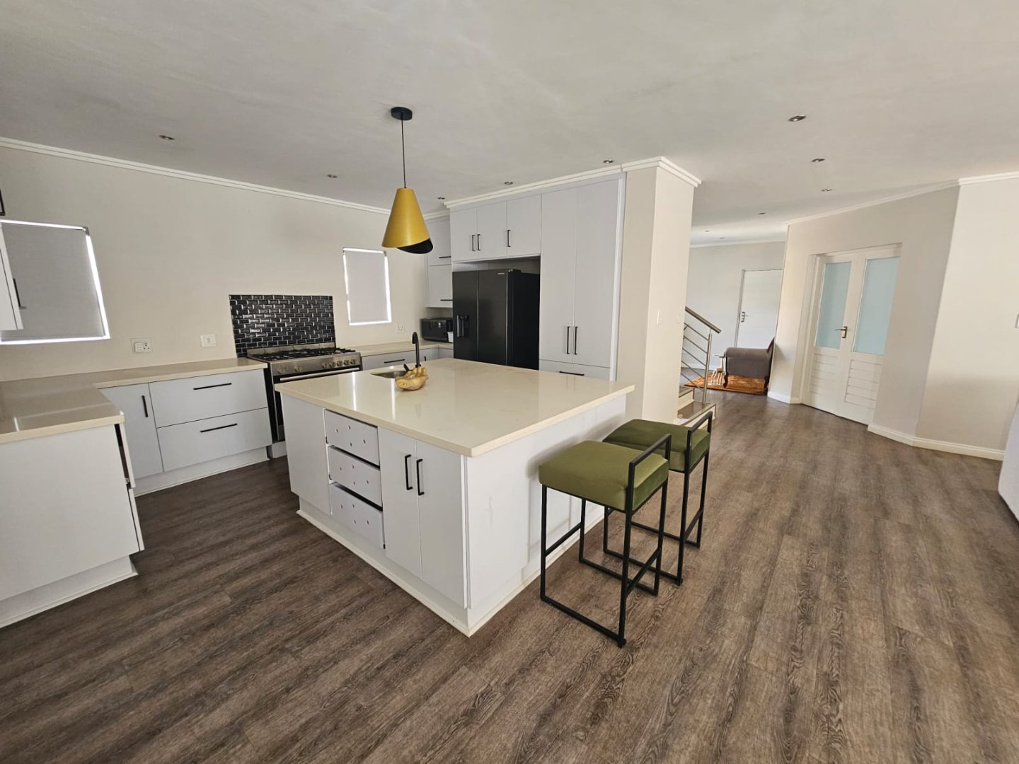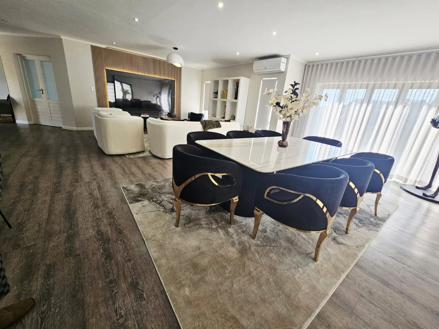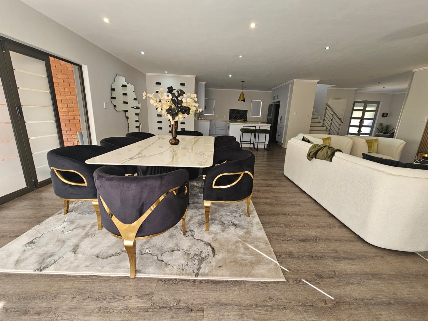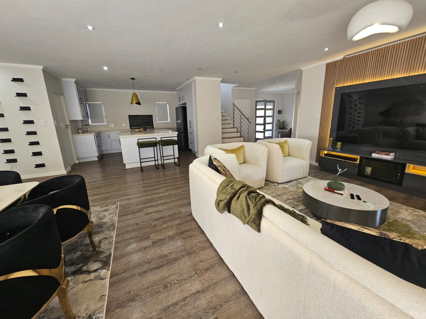 This breathtaking home offers a blend of modern design and luxury living with premium high gloss finishes throughout. The ground floor showcases an expansive open-plan kitchen, complete with a separate scullery, seamlessly connecting to the dining and living areas. These spaces flow effortlessly out to a covered patio, perfect for year-round entertaining, featuring a sparkling pool and a cozy boma area.