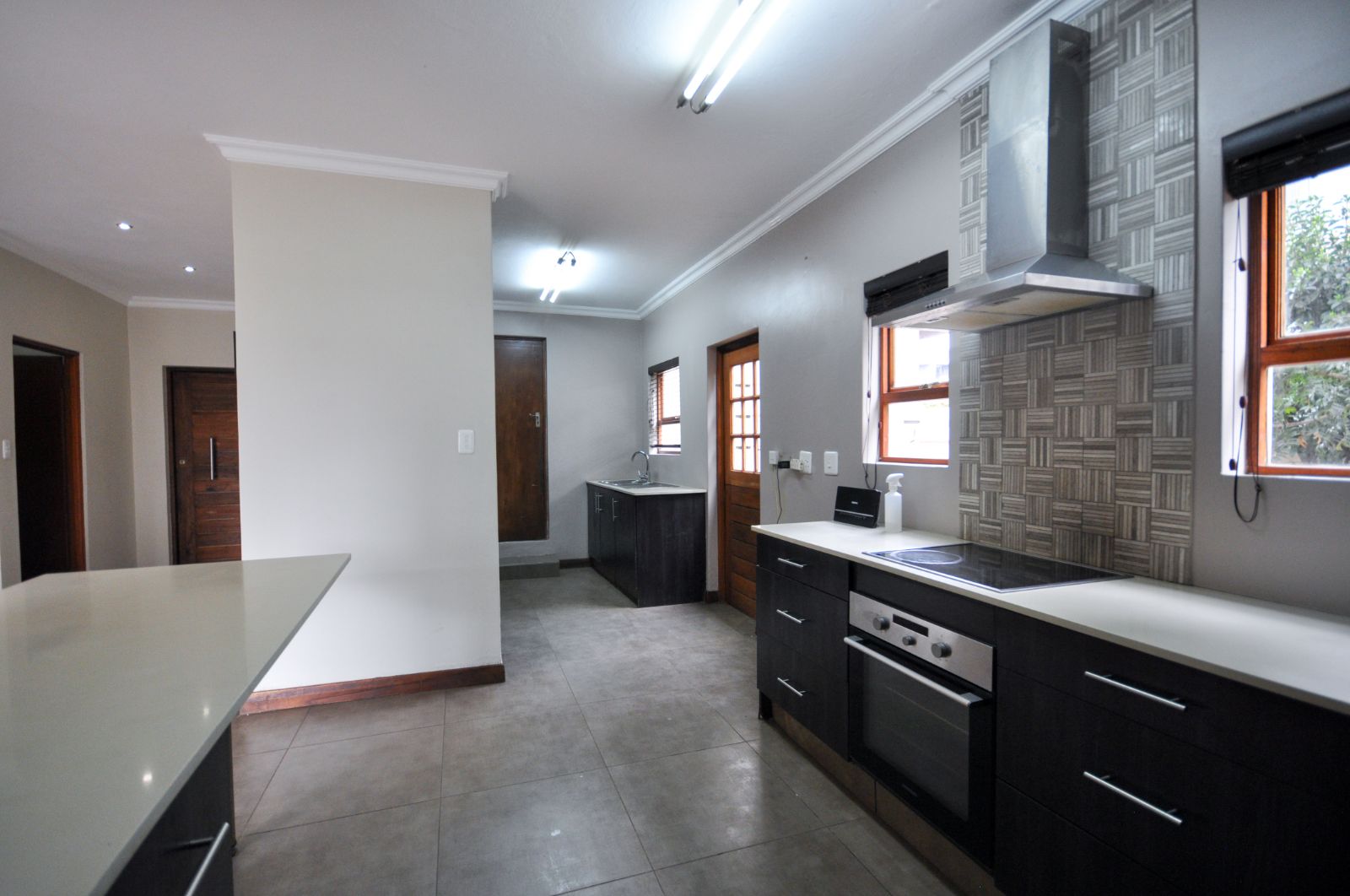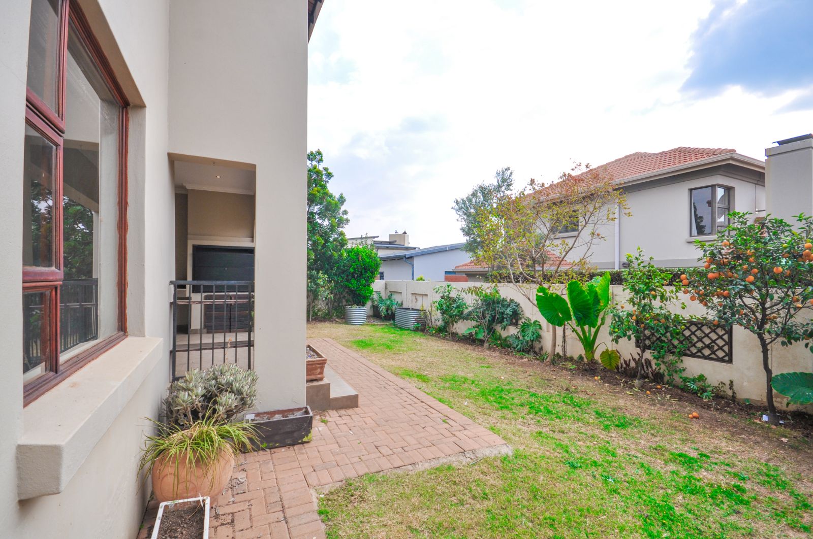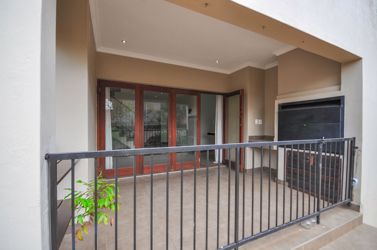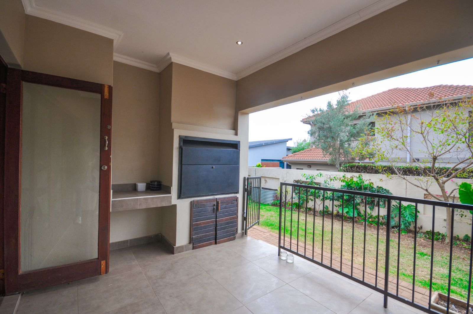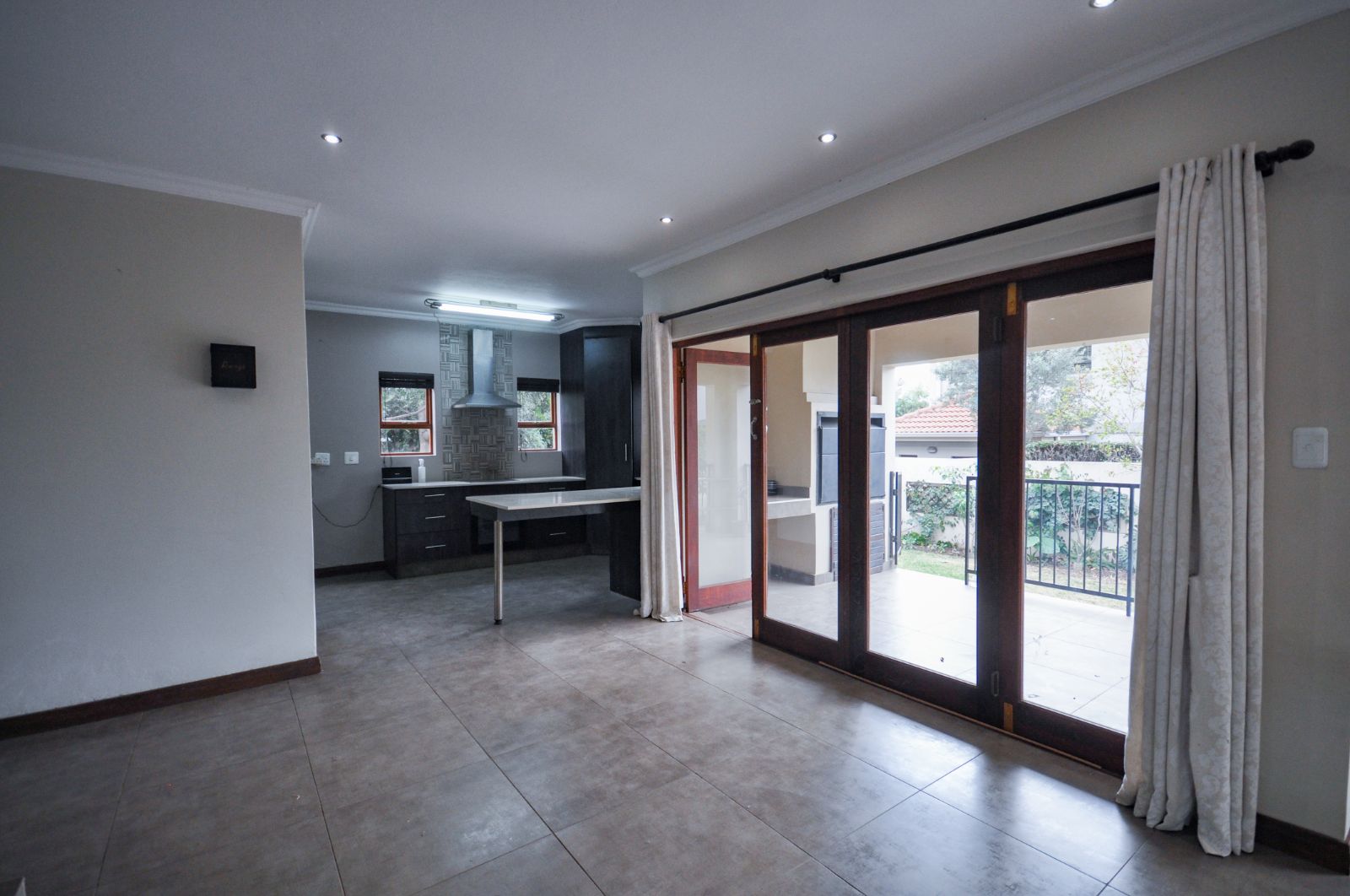Stacking doors from the lounge open onto a covered patio with a built-in braai, providing the perfect spot for year-round gatherings.