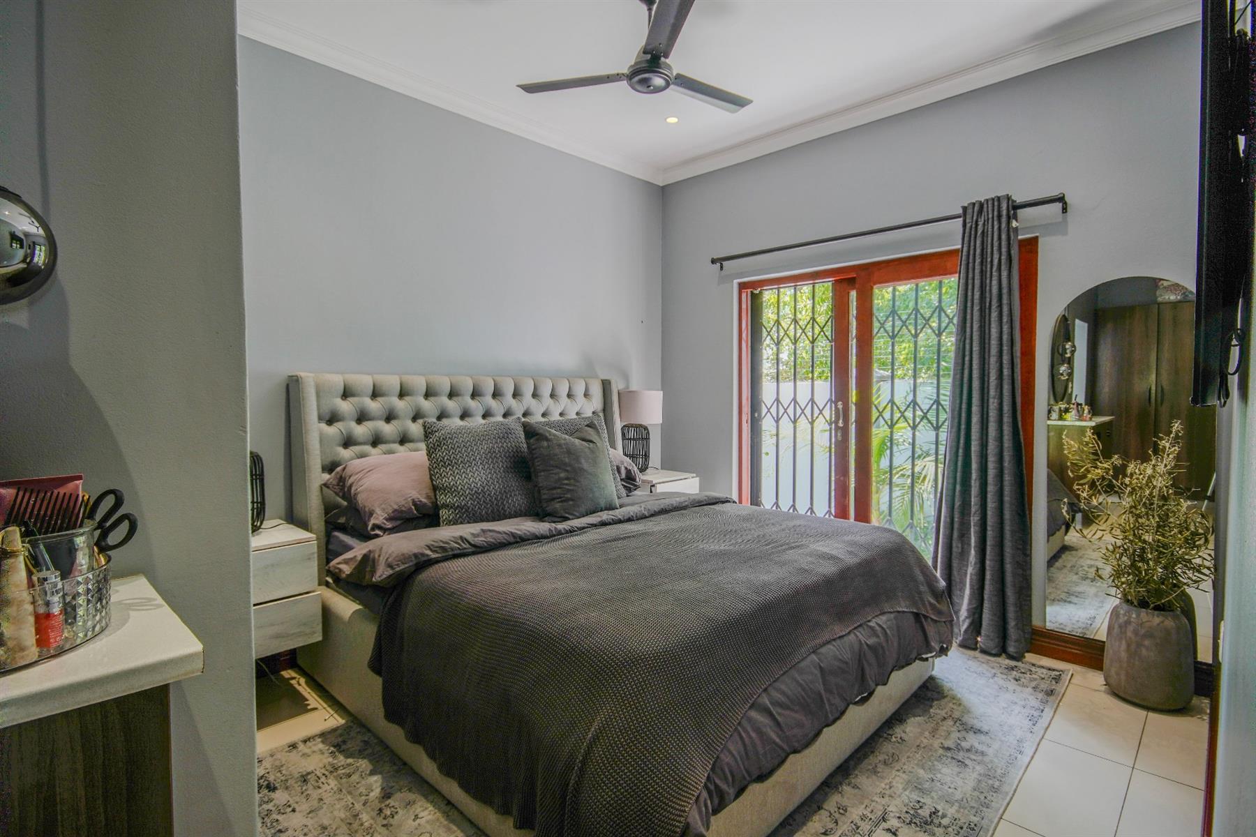 All three bedrooms are well proportioned and versatile, making them suitable for family living, a home office, or accommodating guests. The main bedroom is a private and comfortable retreat, featuring a ceiling fan, sliding glass doors opening onto the garden, a walk-in wardrobe, a built-in dressing table with mirror, and a modern en-suite bathroom. The remaining two bedrooms include built-in cupboards and share a family bathroom.