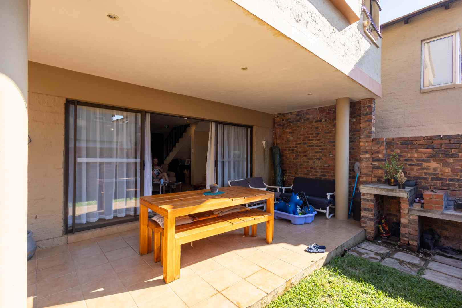 Sliding doors open onto a private garden, perfect for outdoor relaxation or family time.