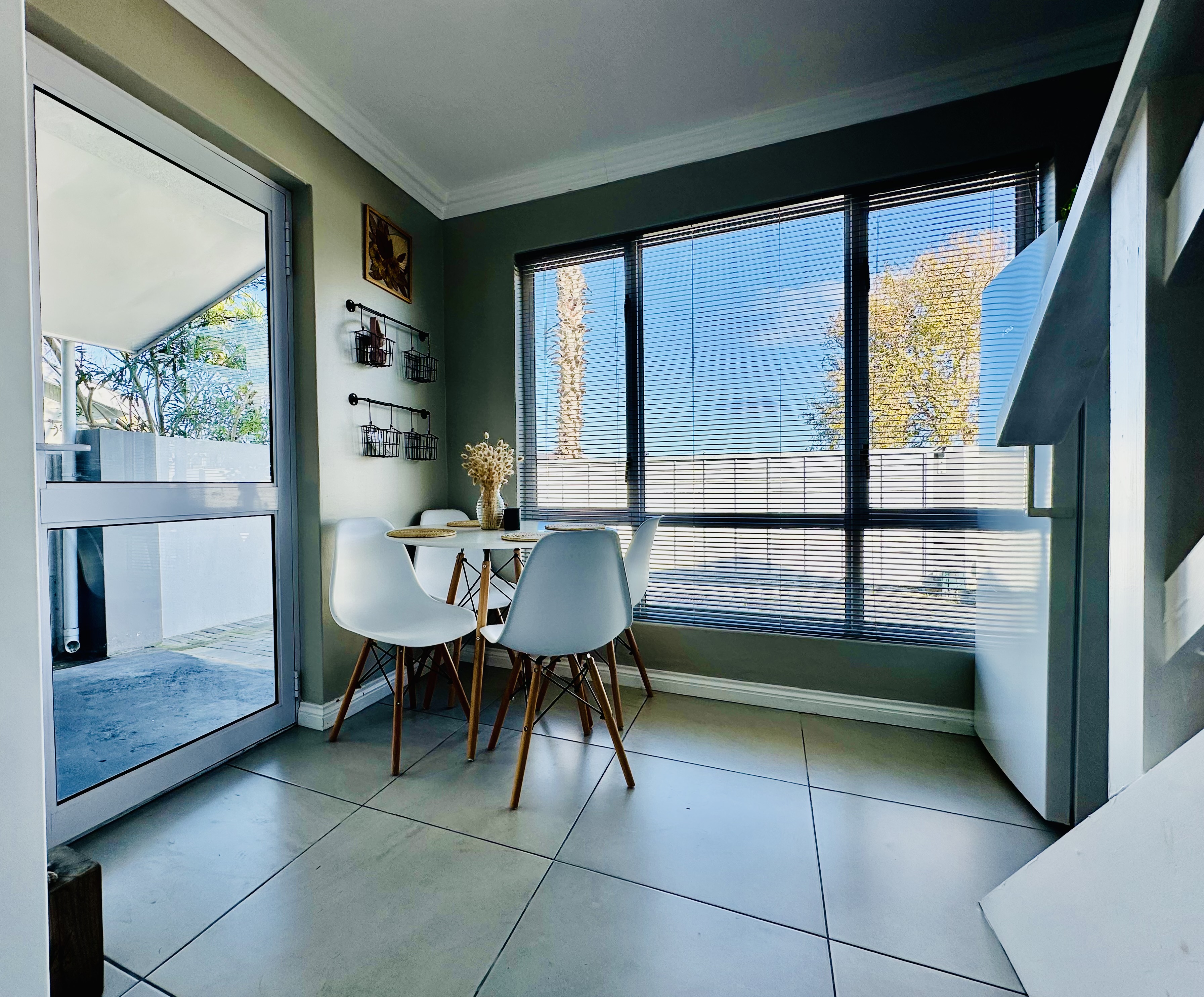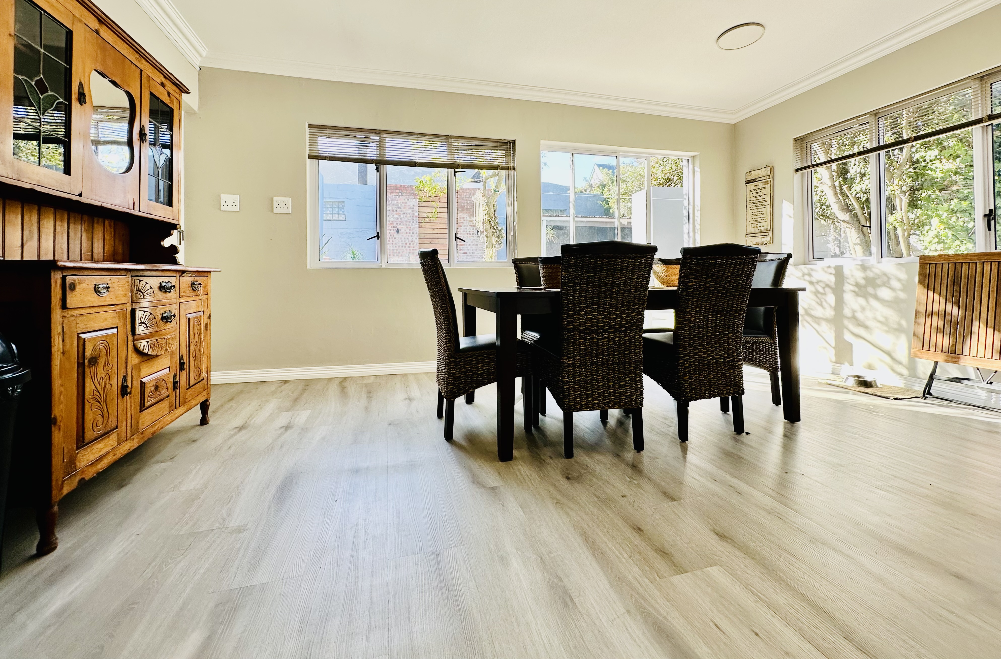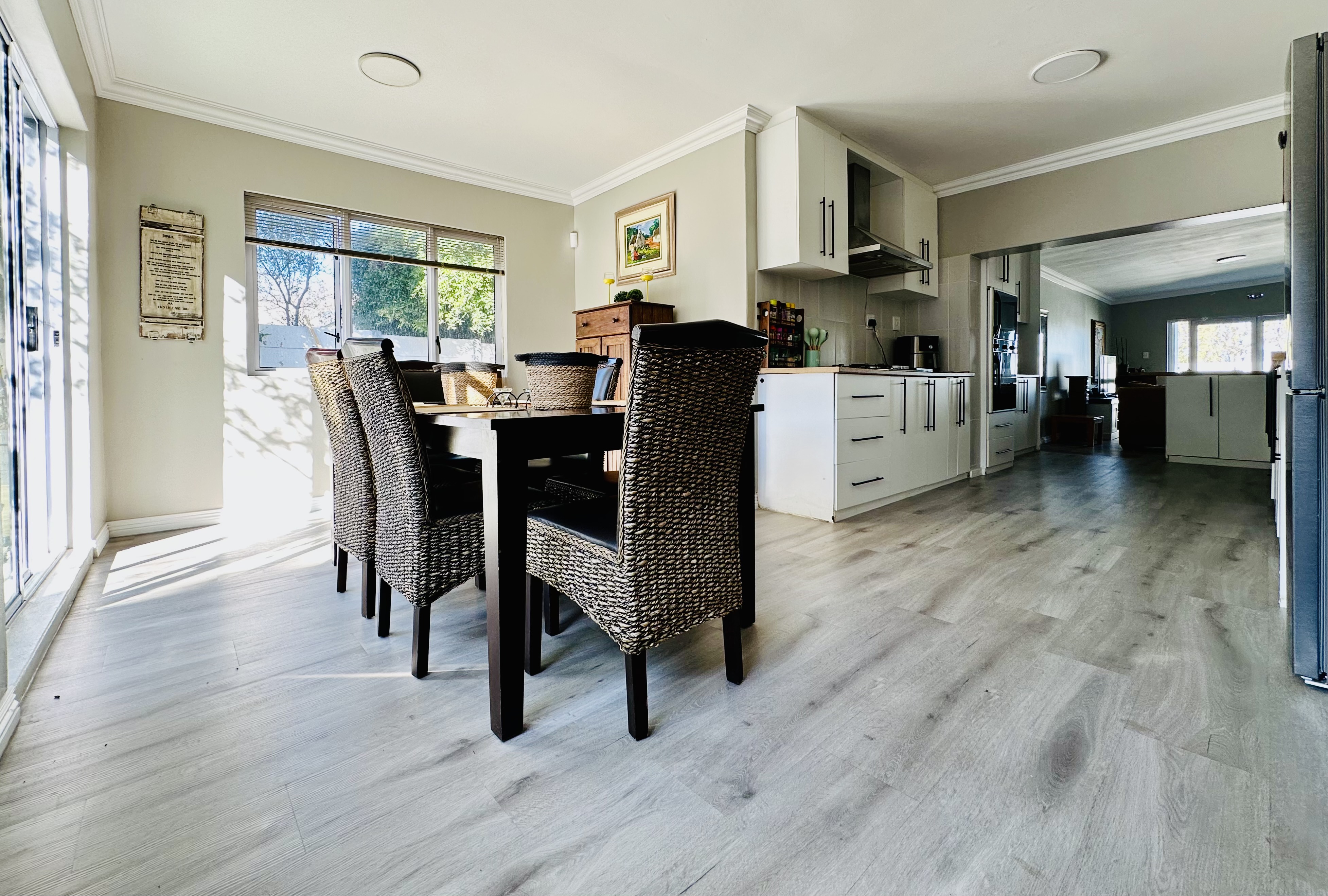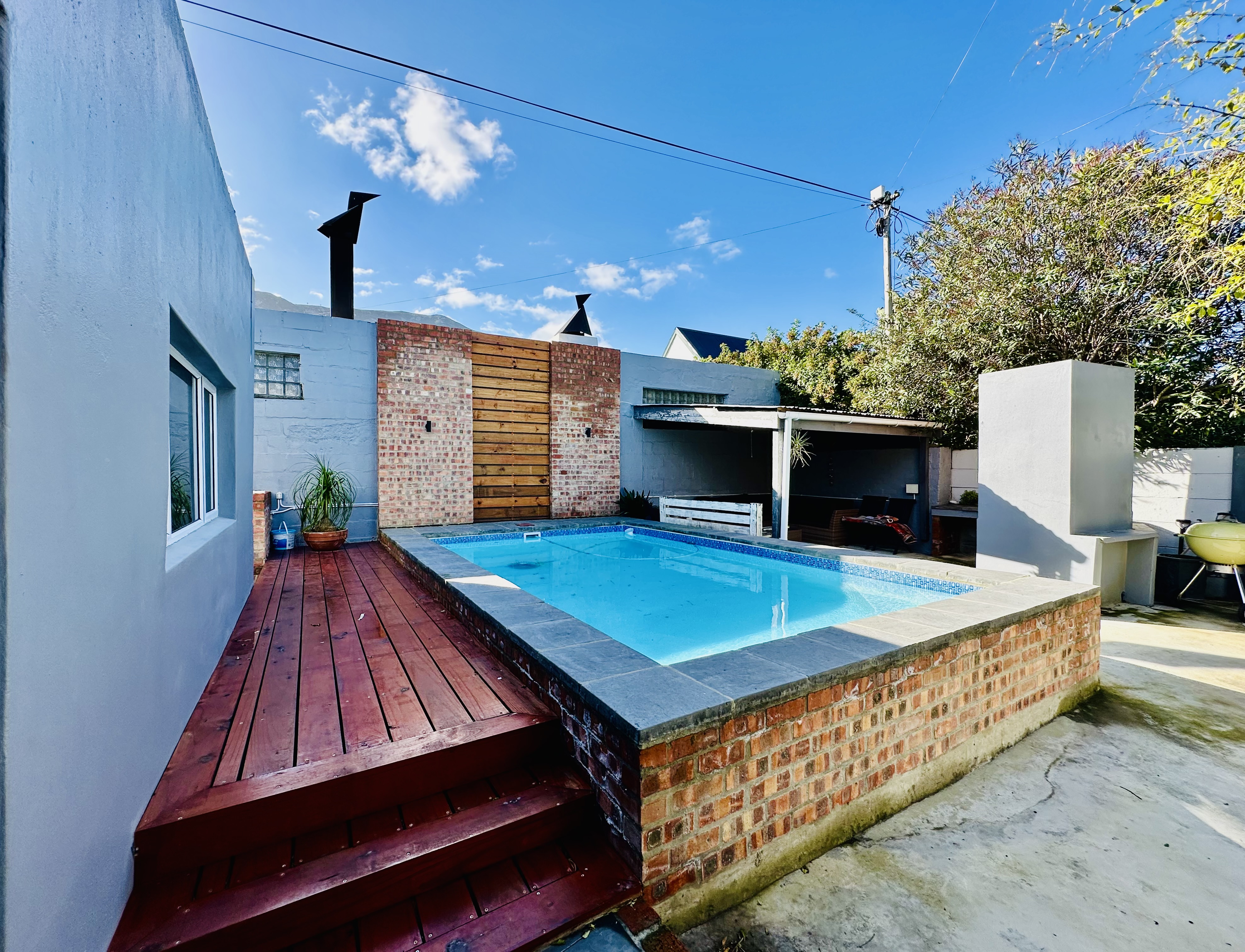 The dining area connects to a sheltered courtyard with a sparkling pool and covered braai area, creating a relaxed and private entertainment space.