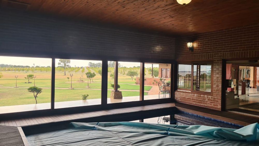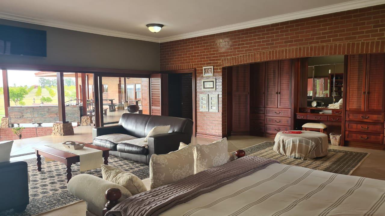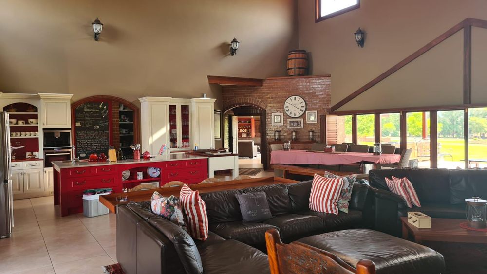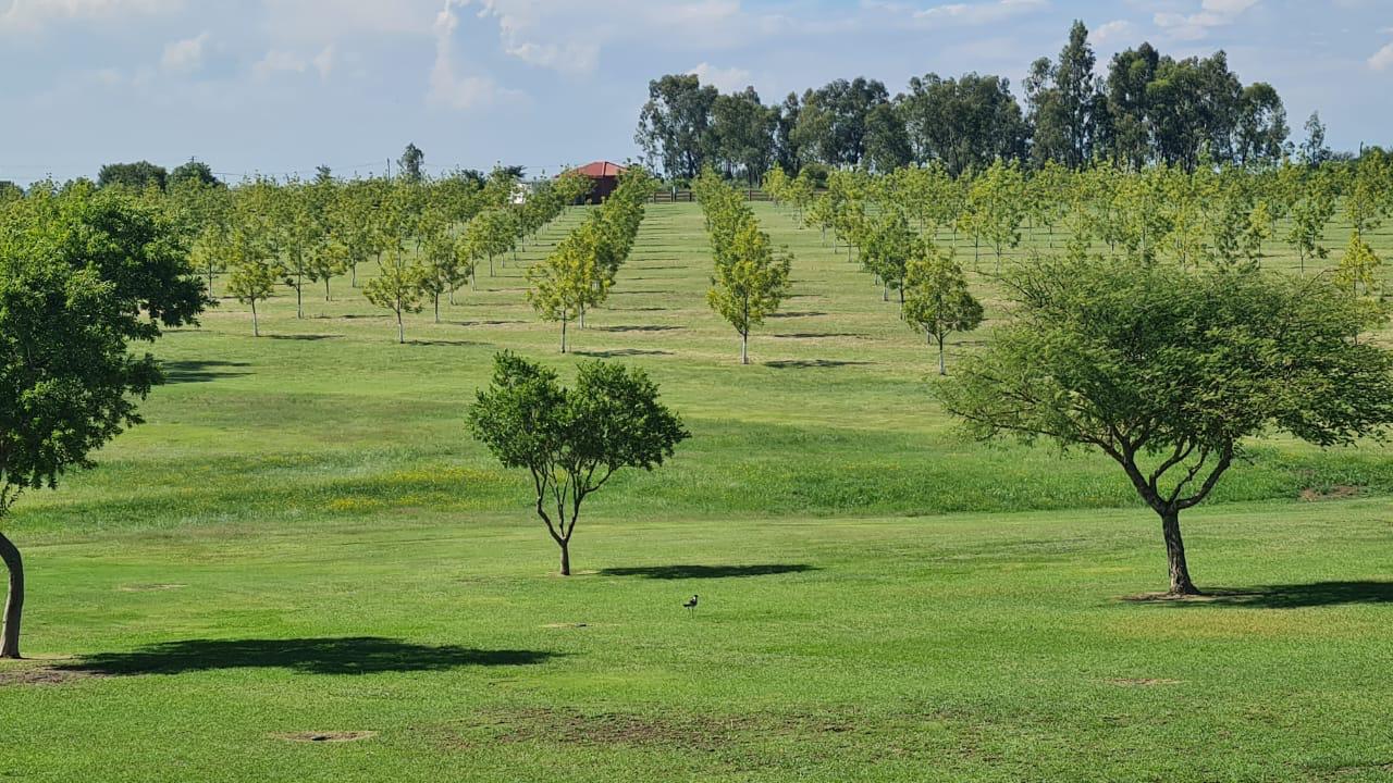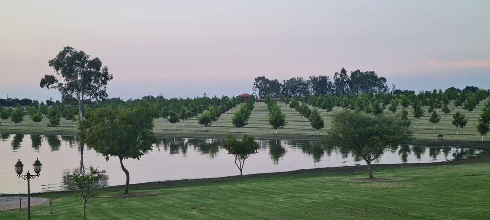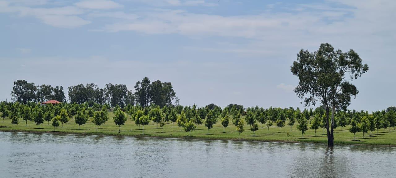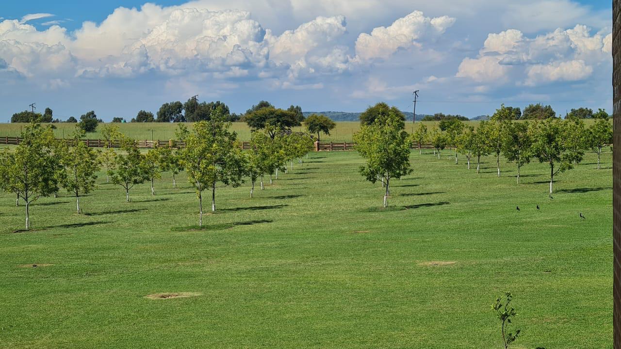 The main property is surrounded by a fence made of wooden posts, neat rows of Pecan groves and the Vaal Dam.