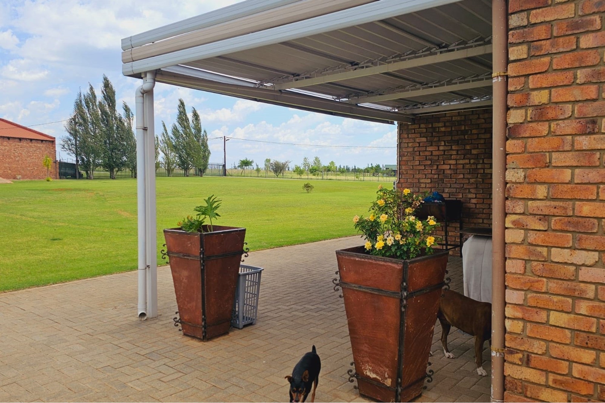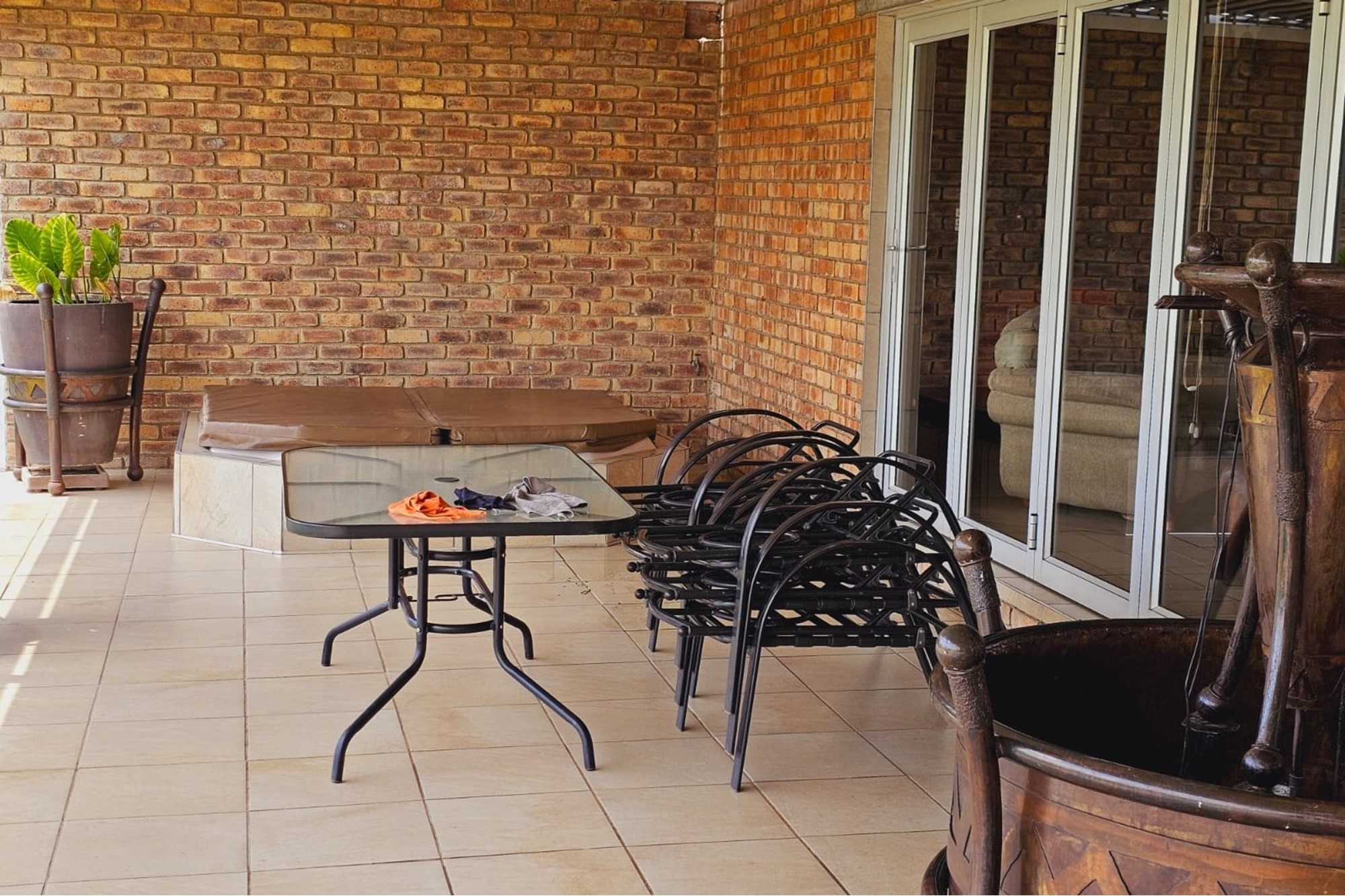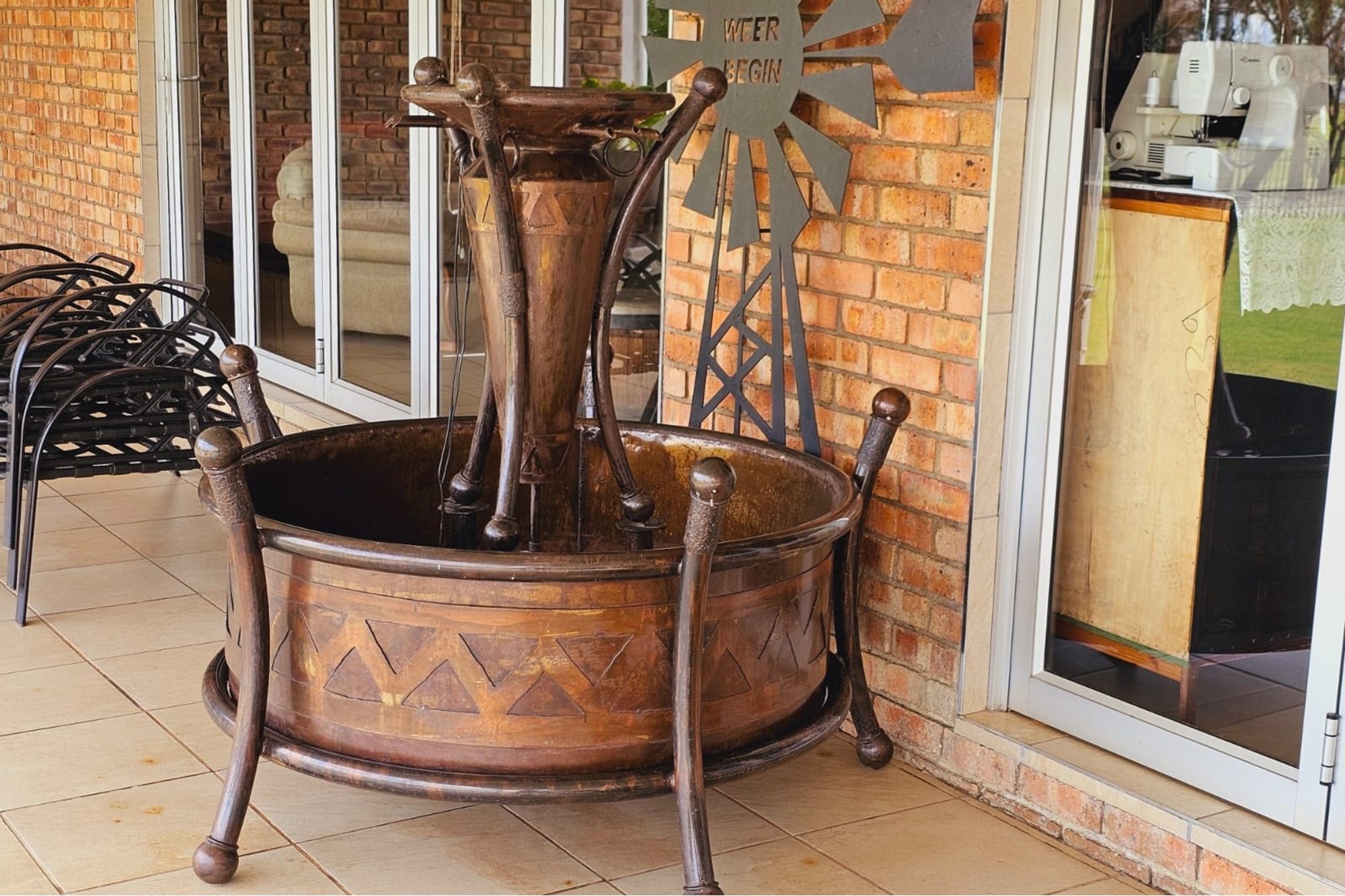 The estate’s beautifully manicured grounds are a verdant oasis, with lush, professionally maintained gardens and a comprehensive irrigation system sourced from a private borehole.