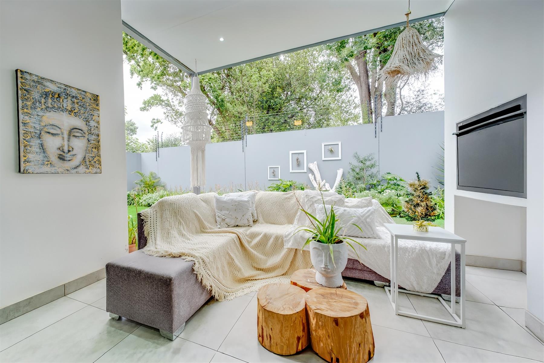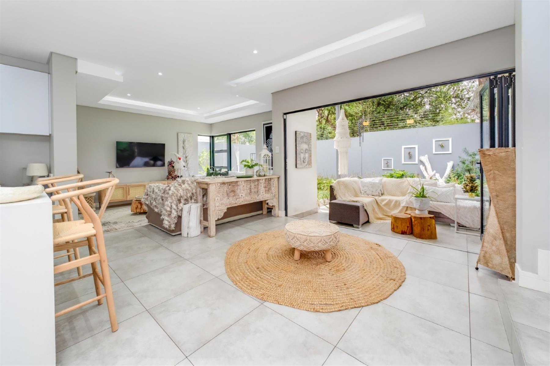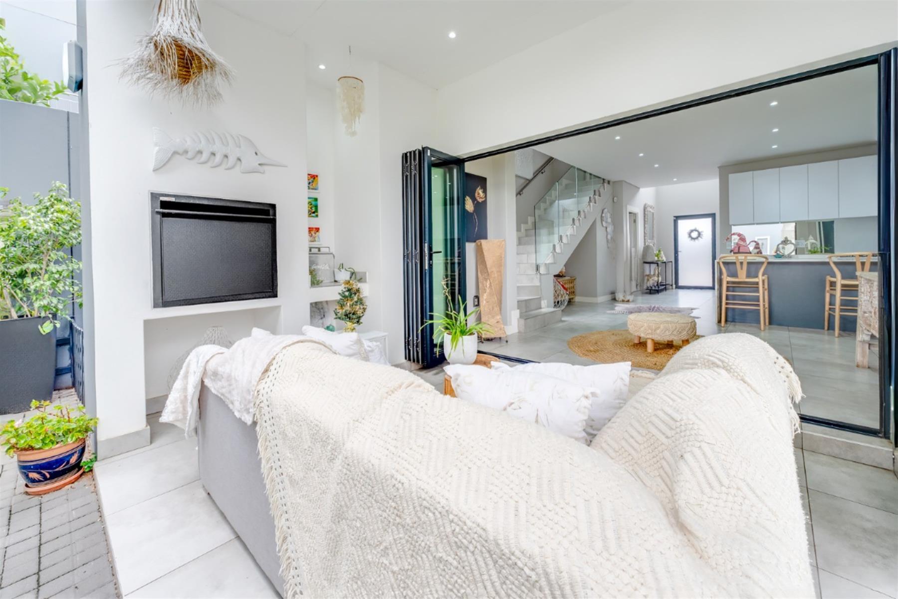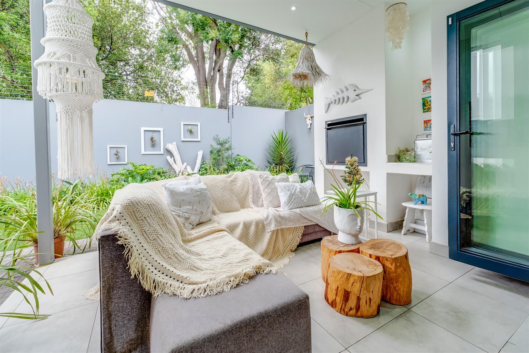 The enclosed patio offers a refined entertainment area, complete with elegant downlights and a built-in braai. A versatile space that seamlessly blends comfort and functionality for effortless indoor-outdoor living.