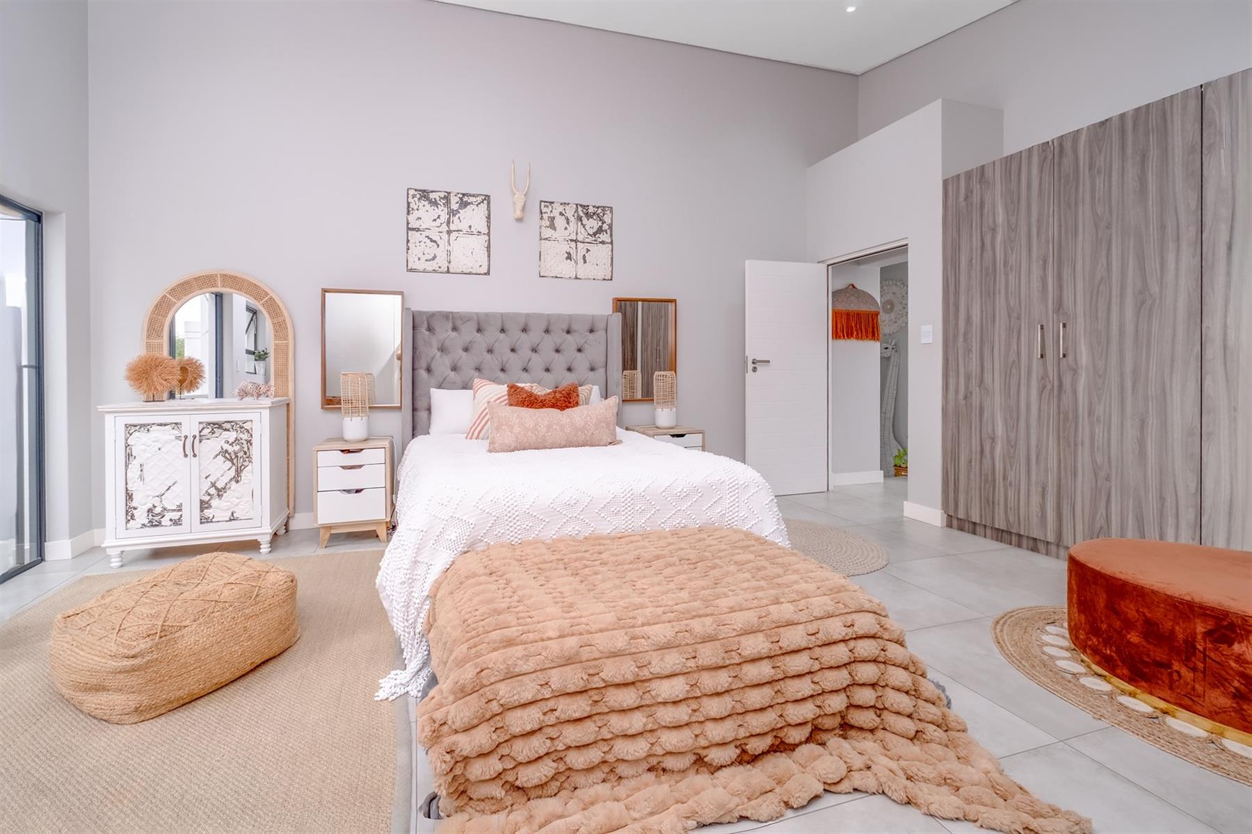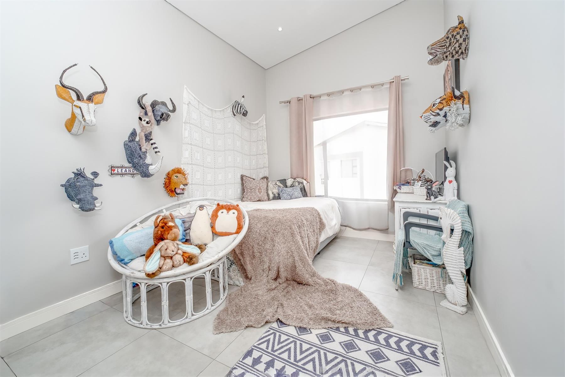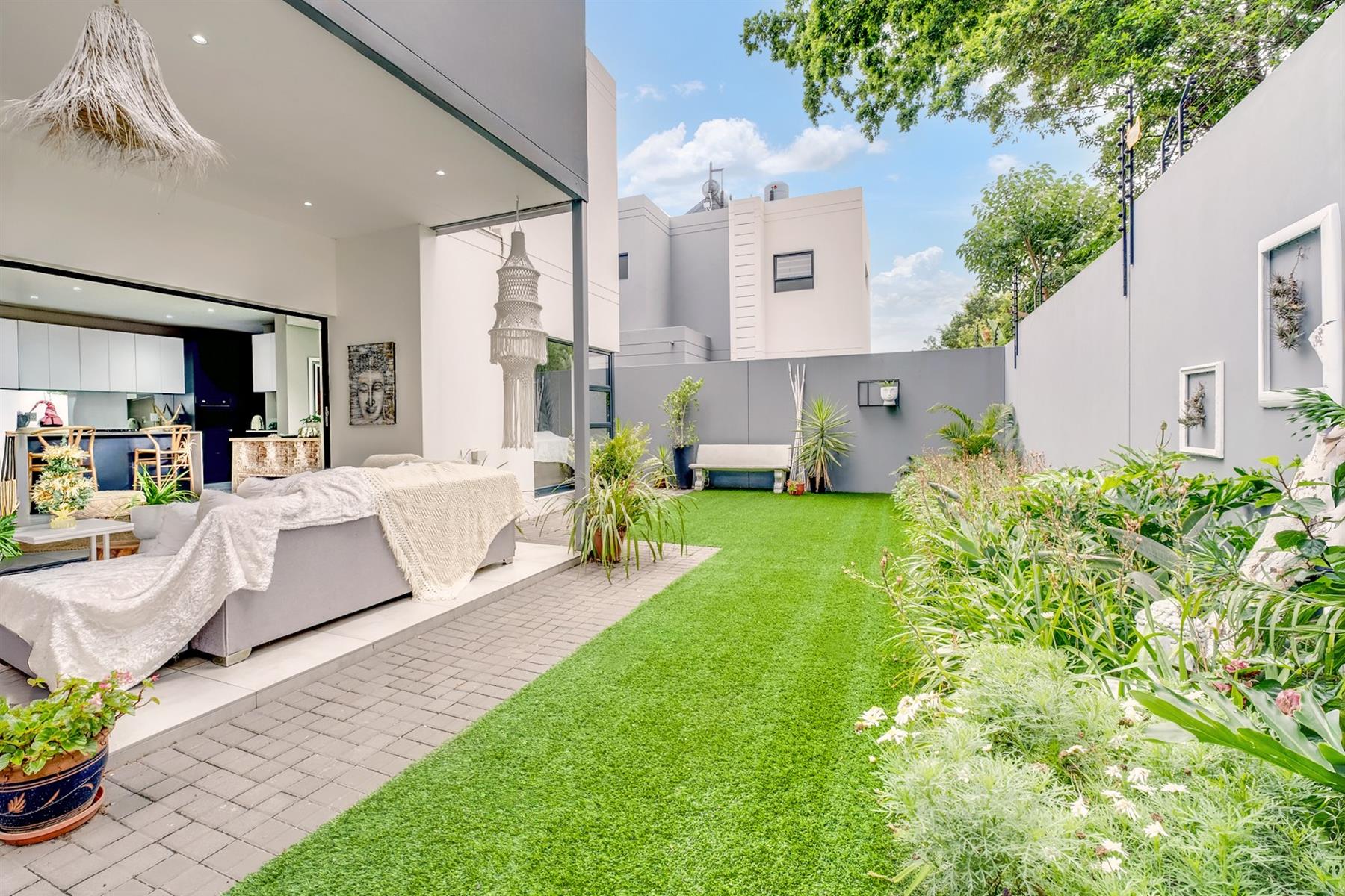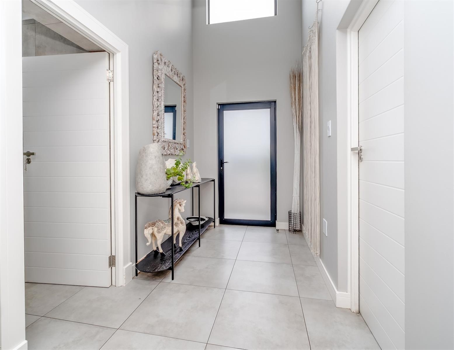 The enclosed patio offers a refined entertainment area, complete with elegant downlights and a built-in braai. A versatile space that seamlessly blends comfort and functionality for effortless indoor-outdoor living.