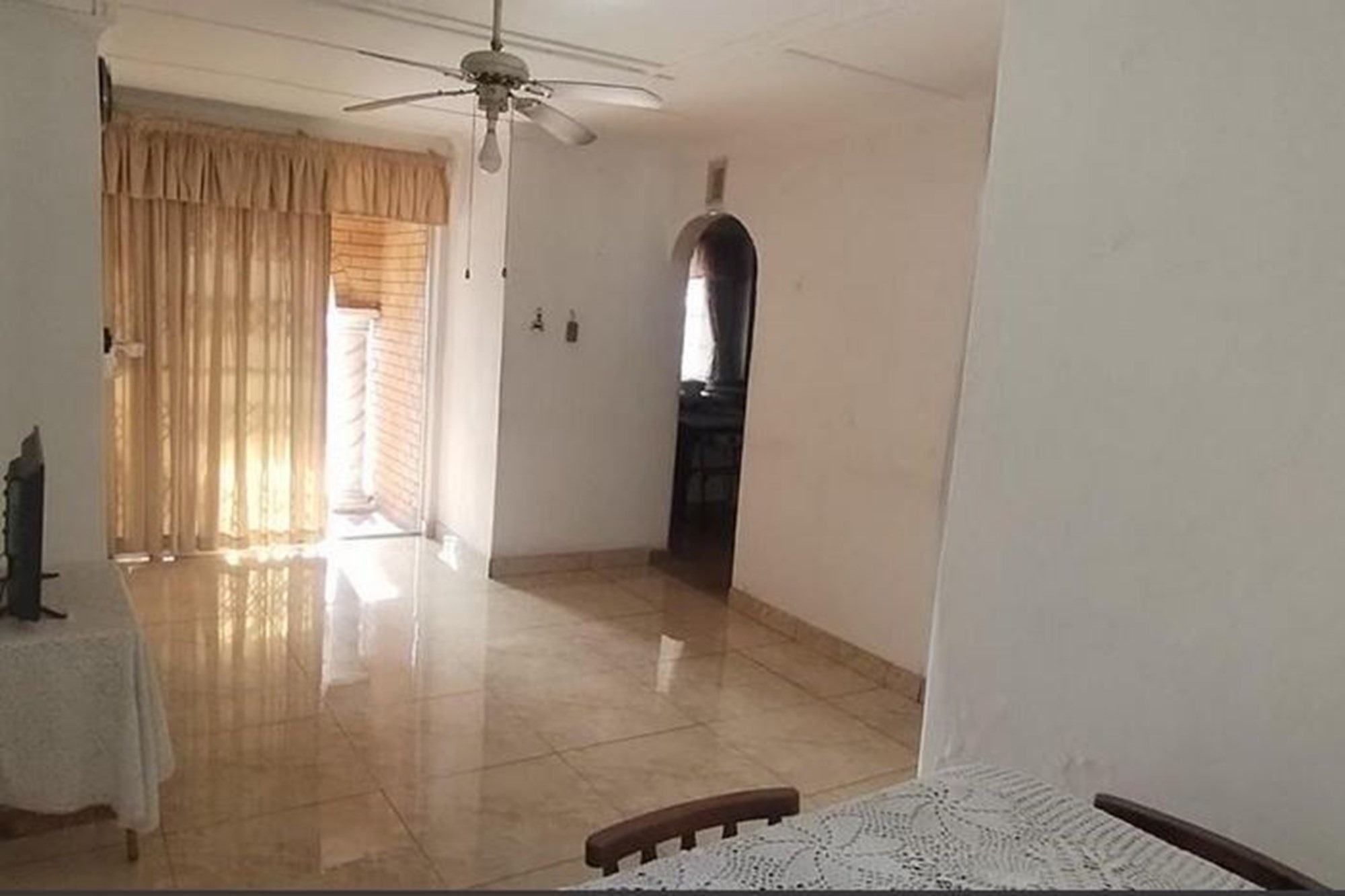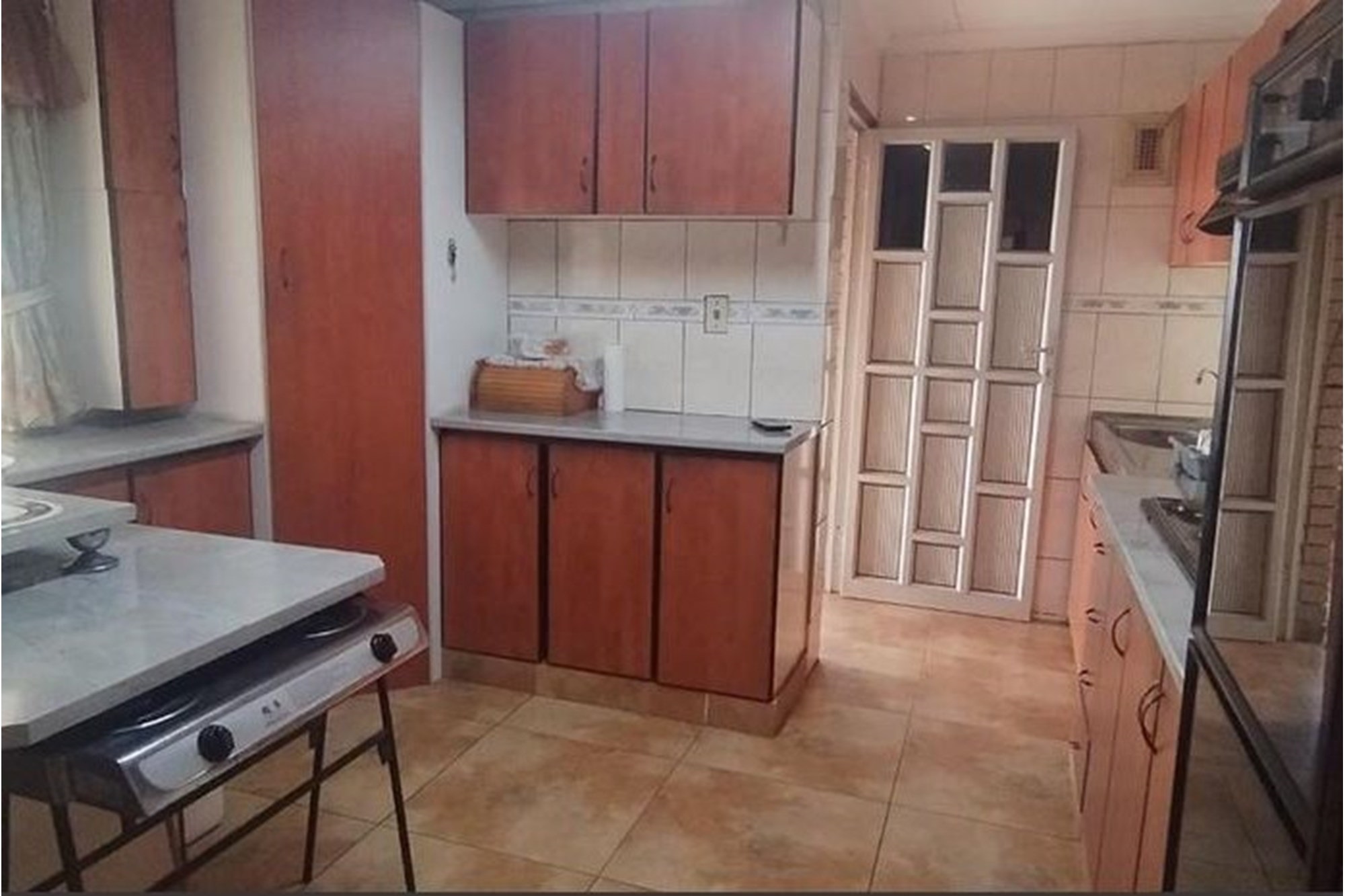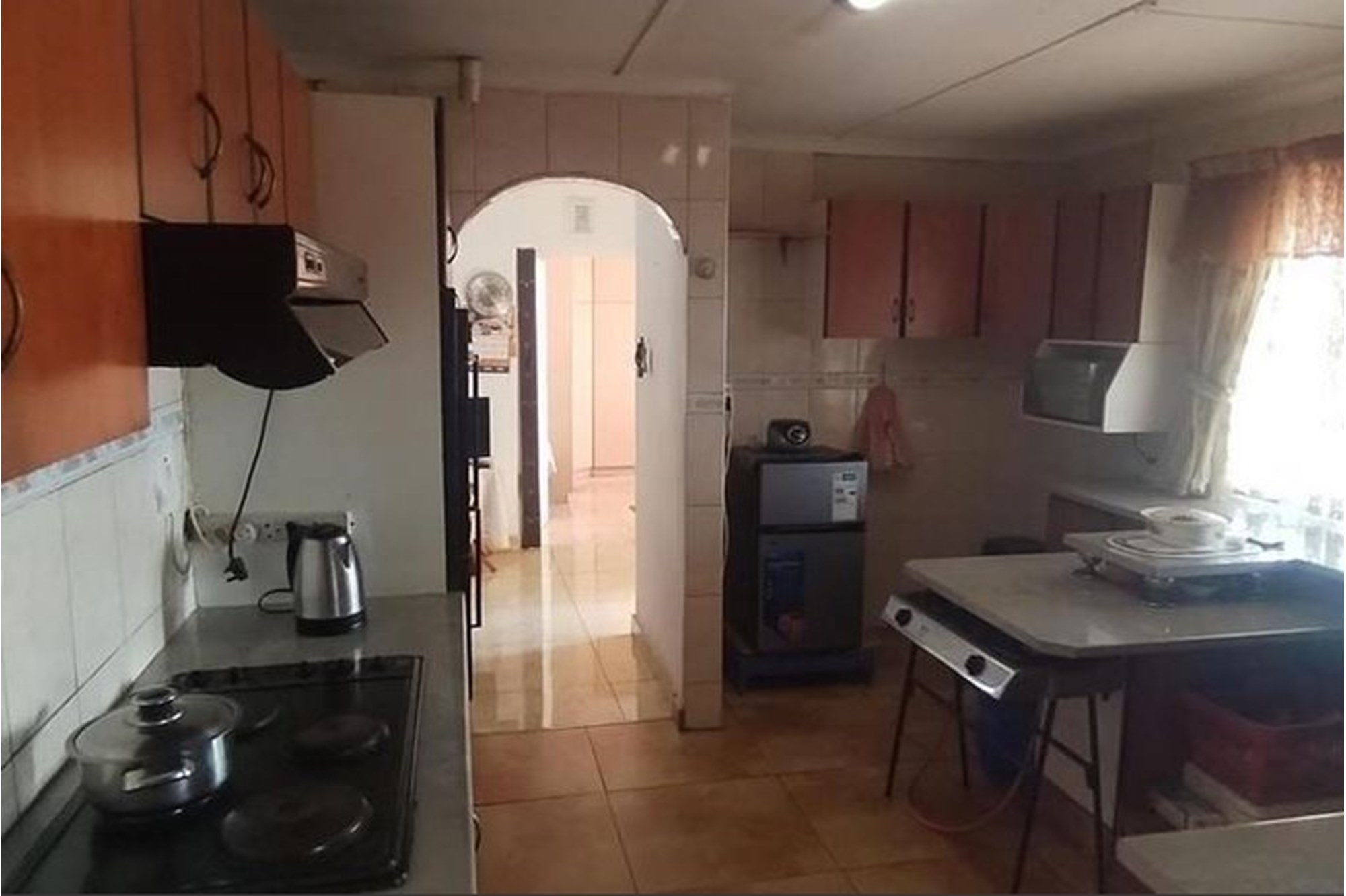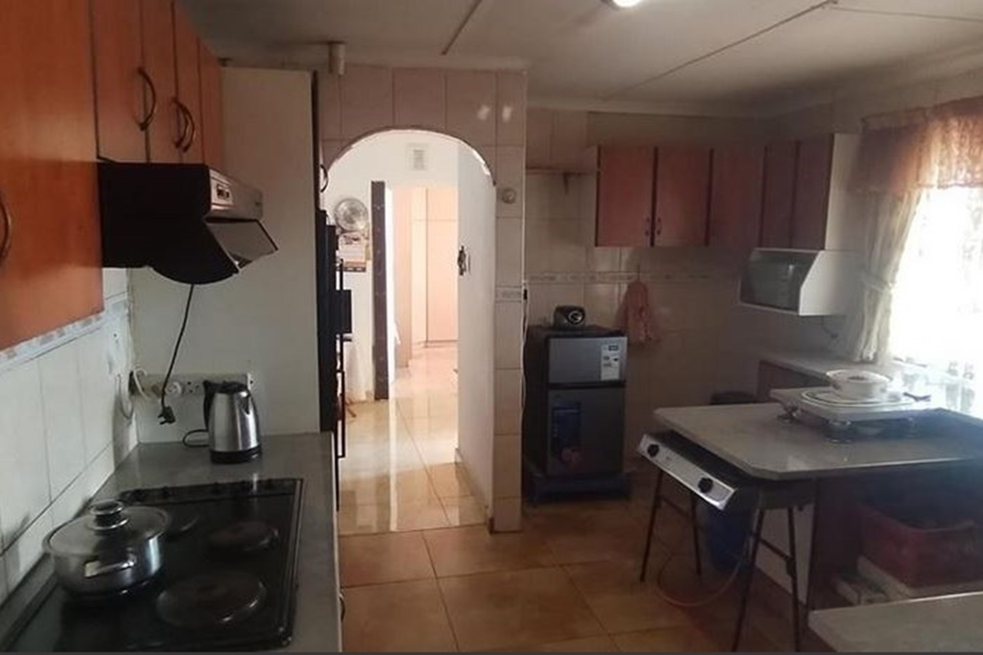 The spacious, well-appointed kitchen comes complete with built-in cupboards, an extractor fan, eye-level oven, and stove—perfect for those who love to cook. Flowing seamlessly from the kitchen, the dining area and inviting lounge create a warm setting for family gatherings, enhanced by curtain rails, tiled floors, and a ceiling fan.