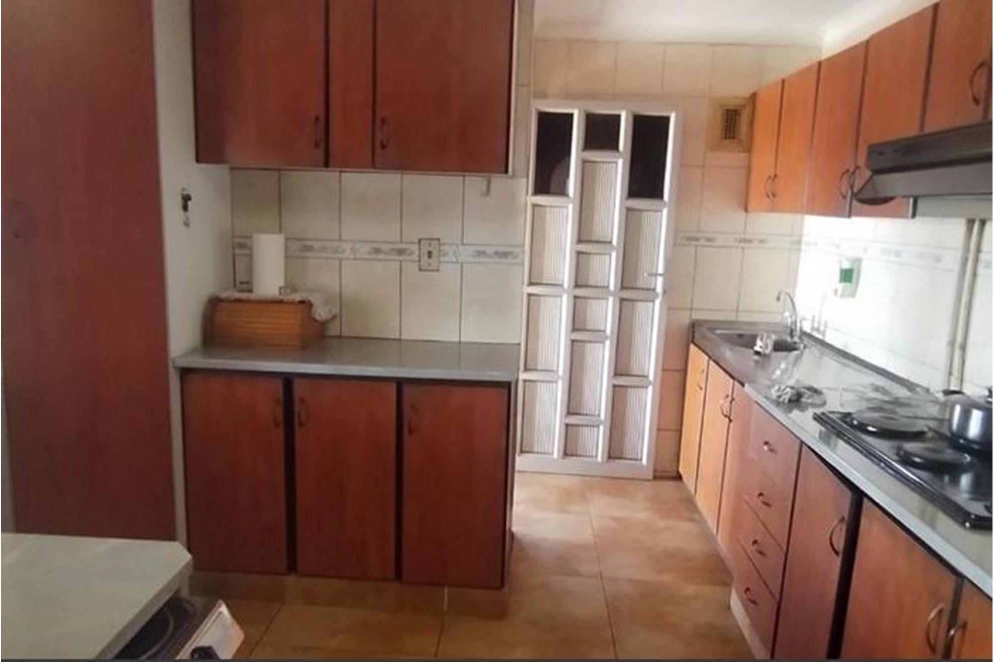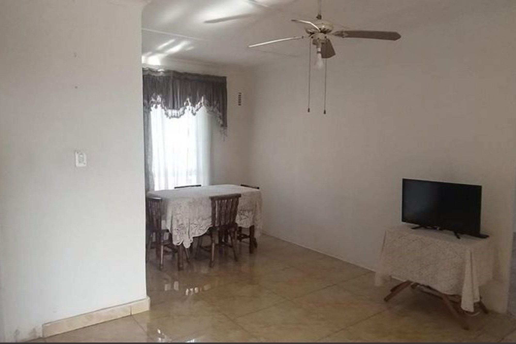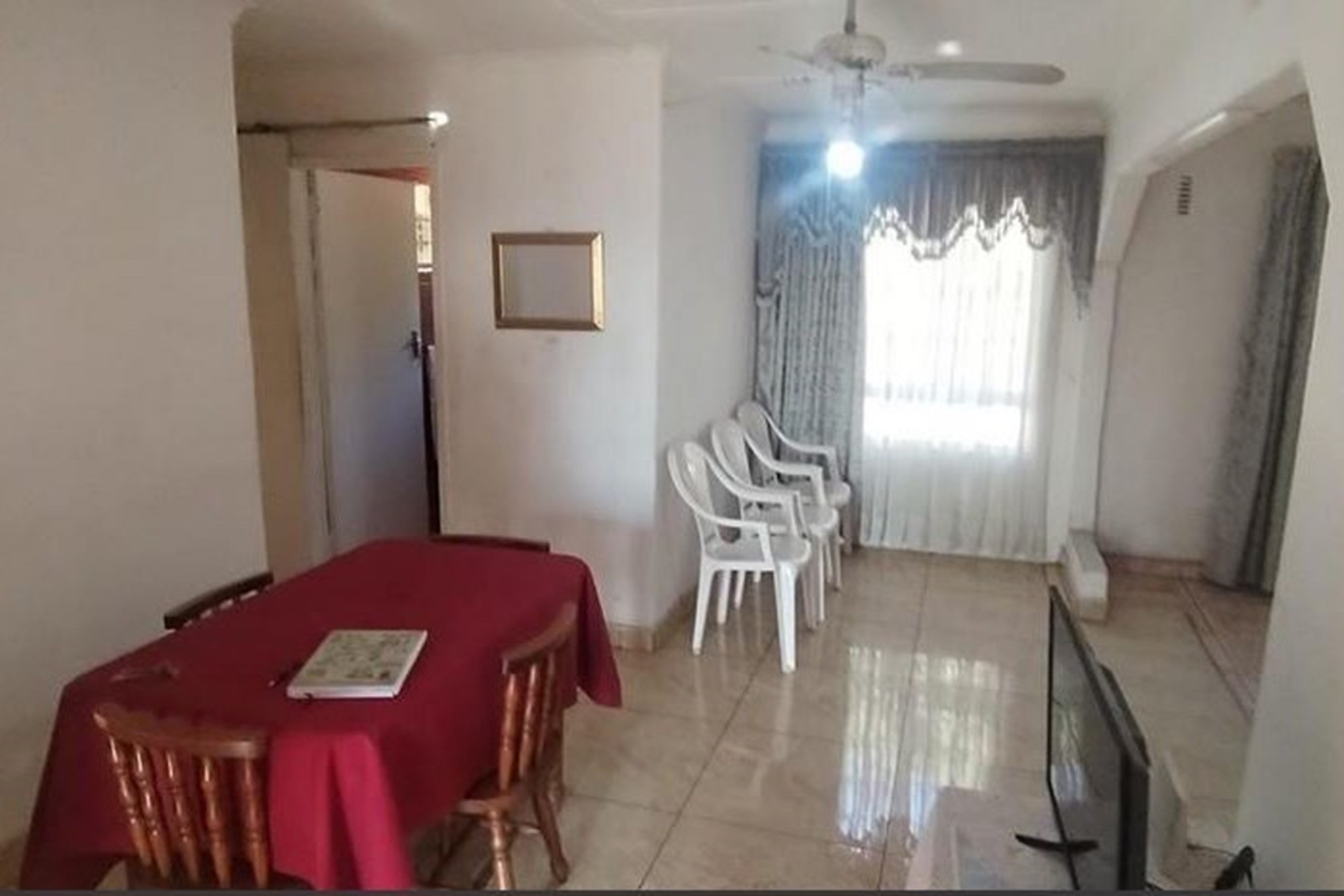 The spacious, well-appointed kitchen comes complete with built-in cupboards, an extractor fan, eye-level oven, and stove—perfect for those who love to cook. Flowing seamlessly from the kitchen, the dining area and inviting lounge create a warm setting for family gatherings, enhanced by curtain rails, tiled floors, and a ceiling fan.