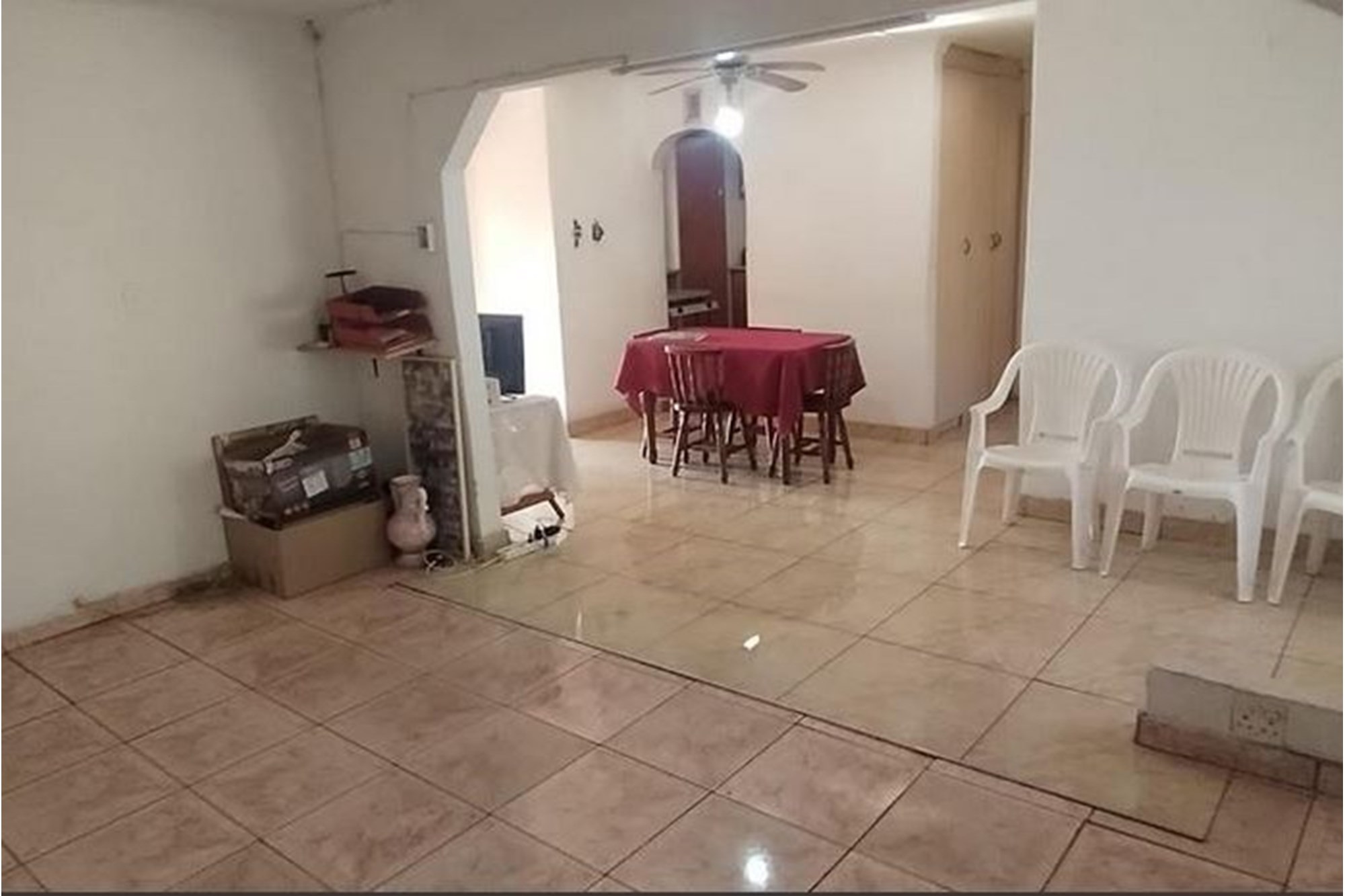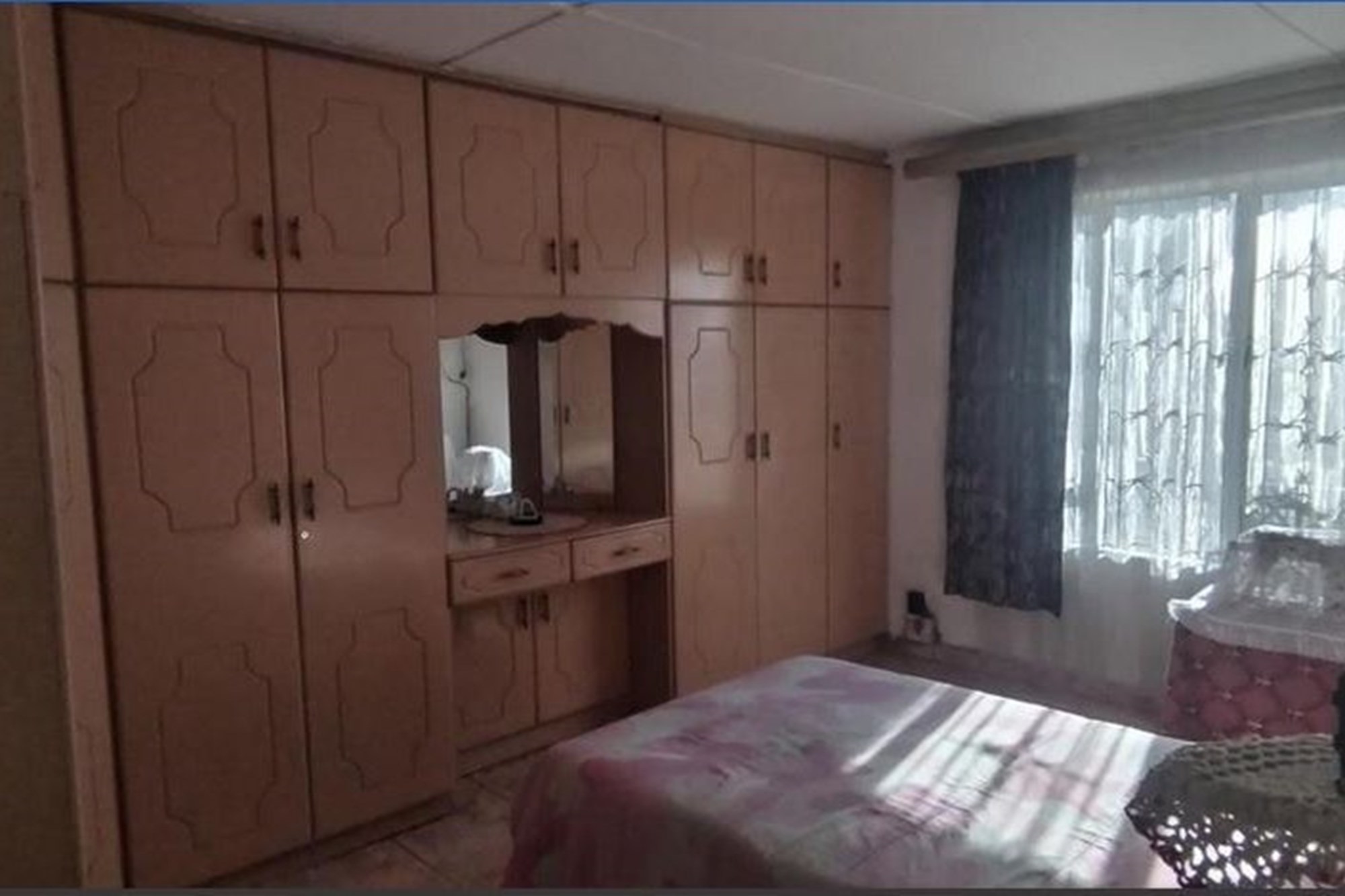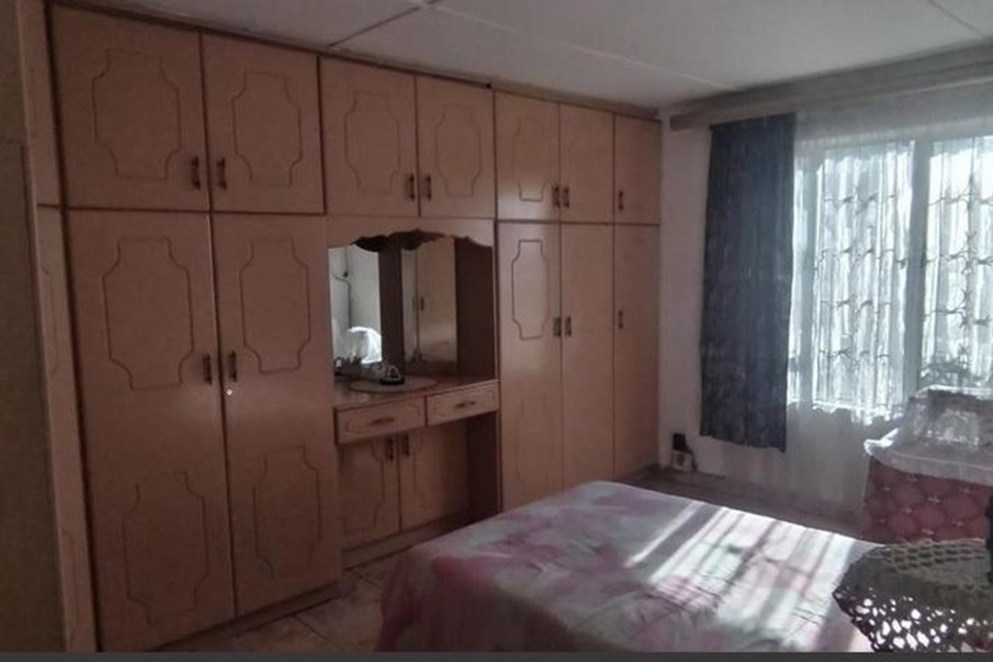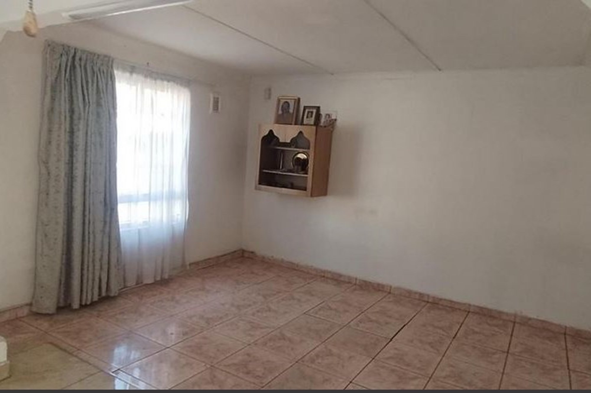 The spacious, well-appointed kitchen comes complete with built-in cupboards, an extractor fan, eye-level oven, and stove—perfect for those who love to cook. Flowing seamlessly from the kitchen, the dining area and inviting lounge create a warm setting for family gatherings, enhanced by curtain rails, tiled floors, and a ceiling fan.