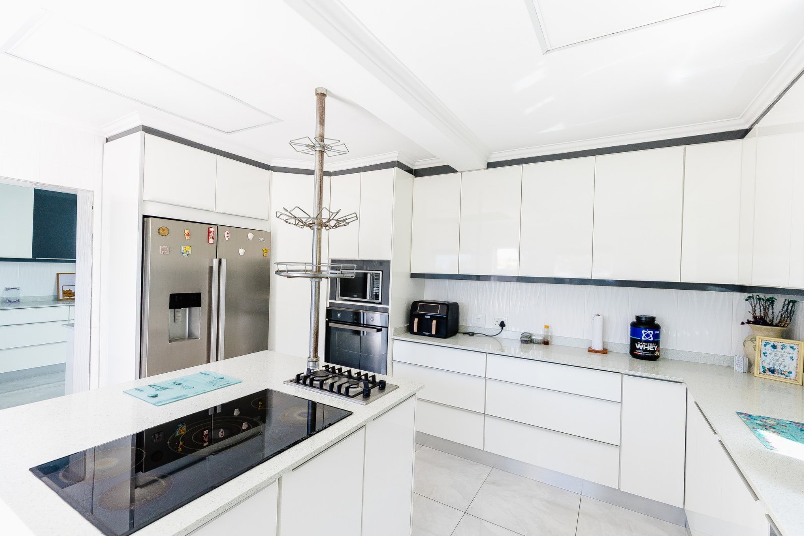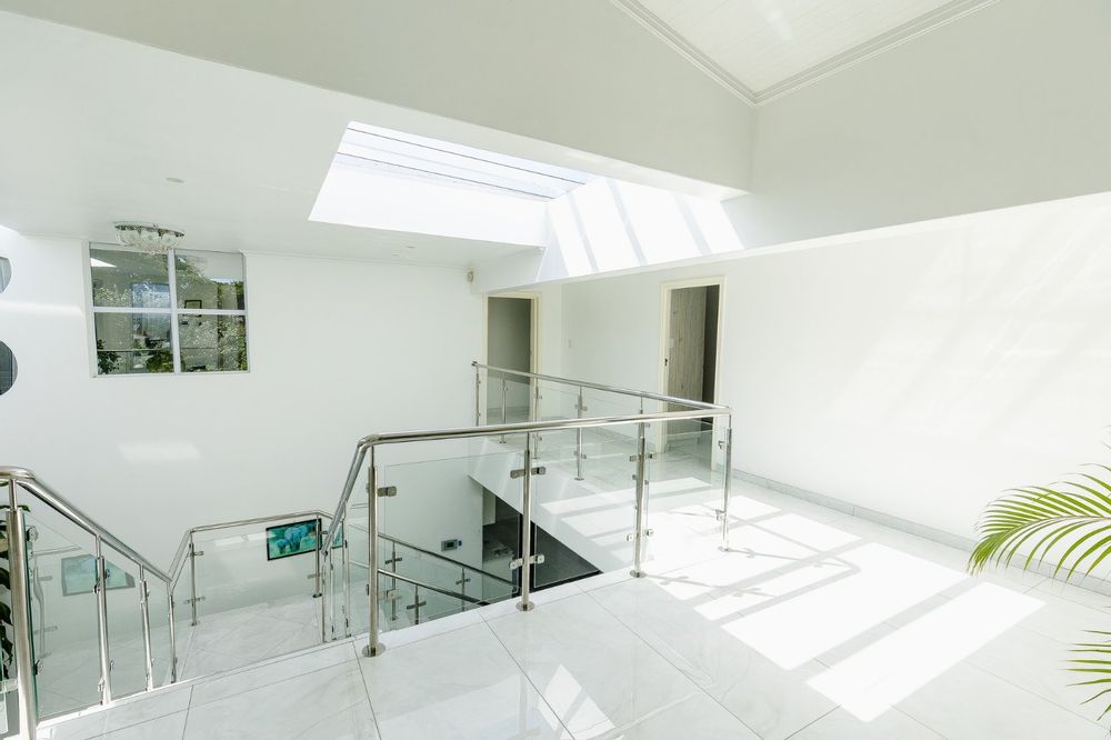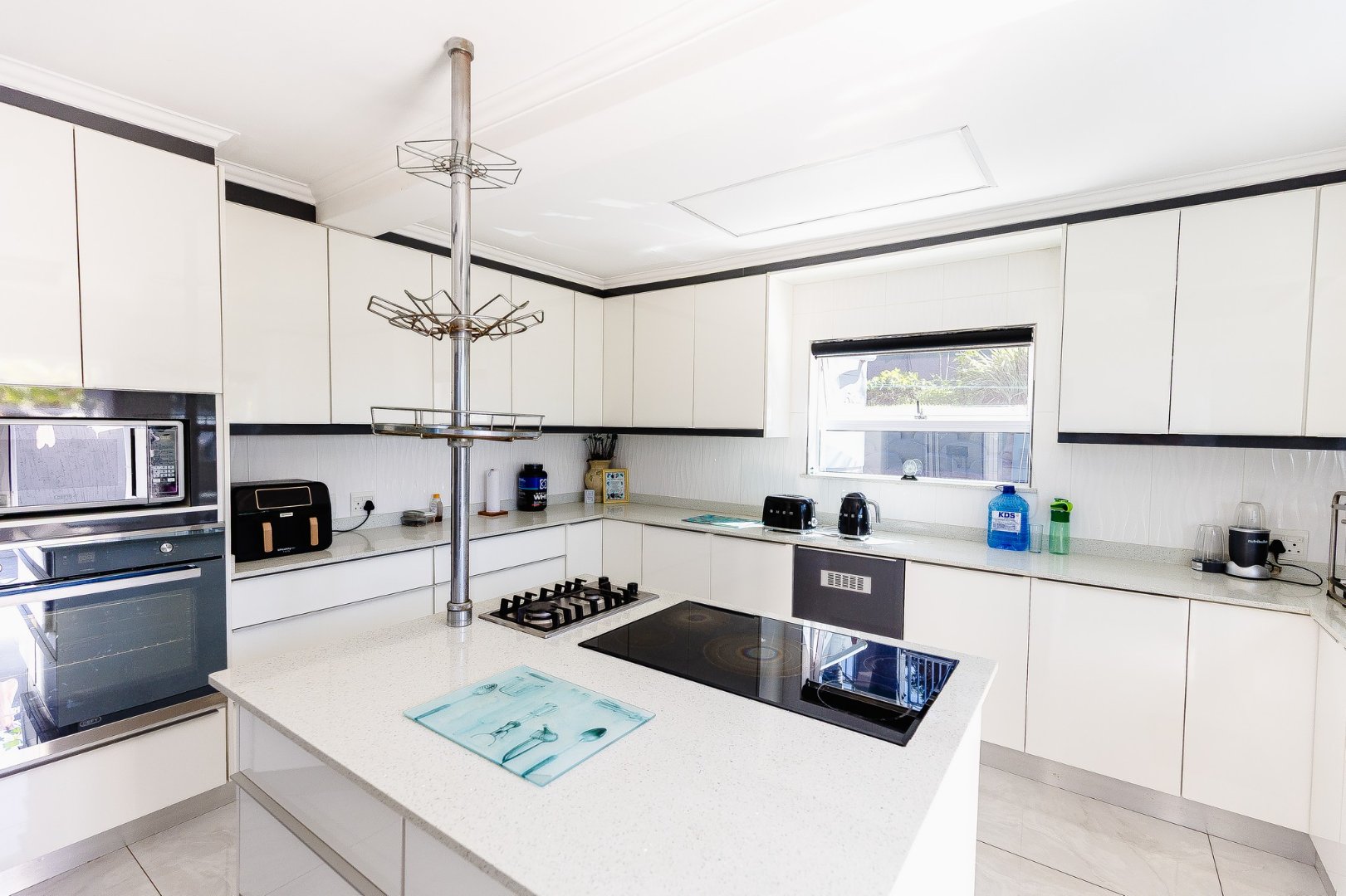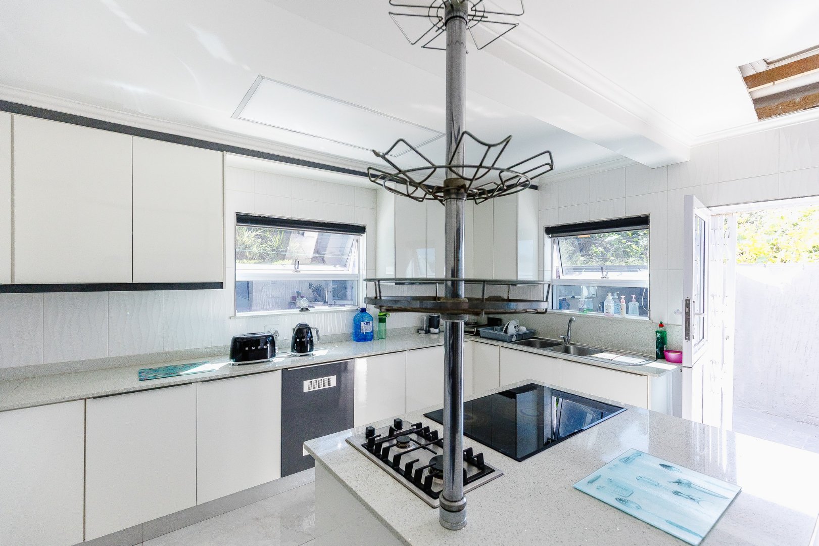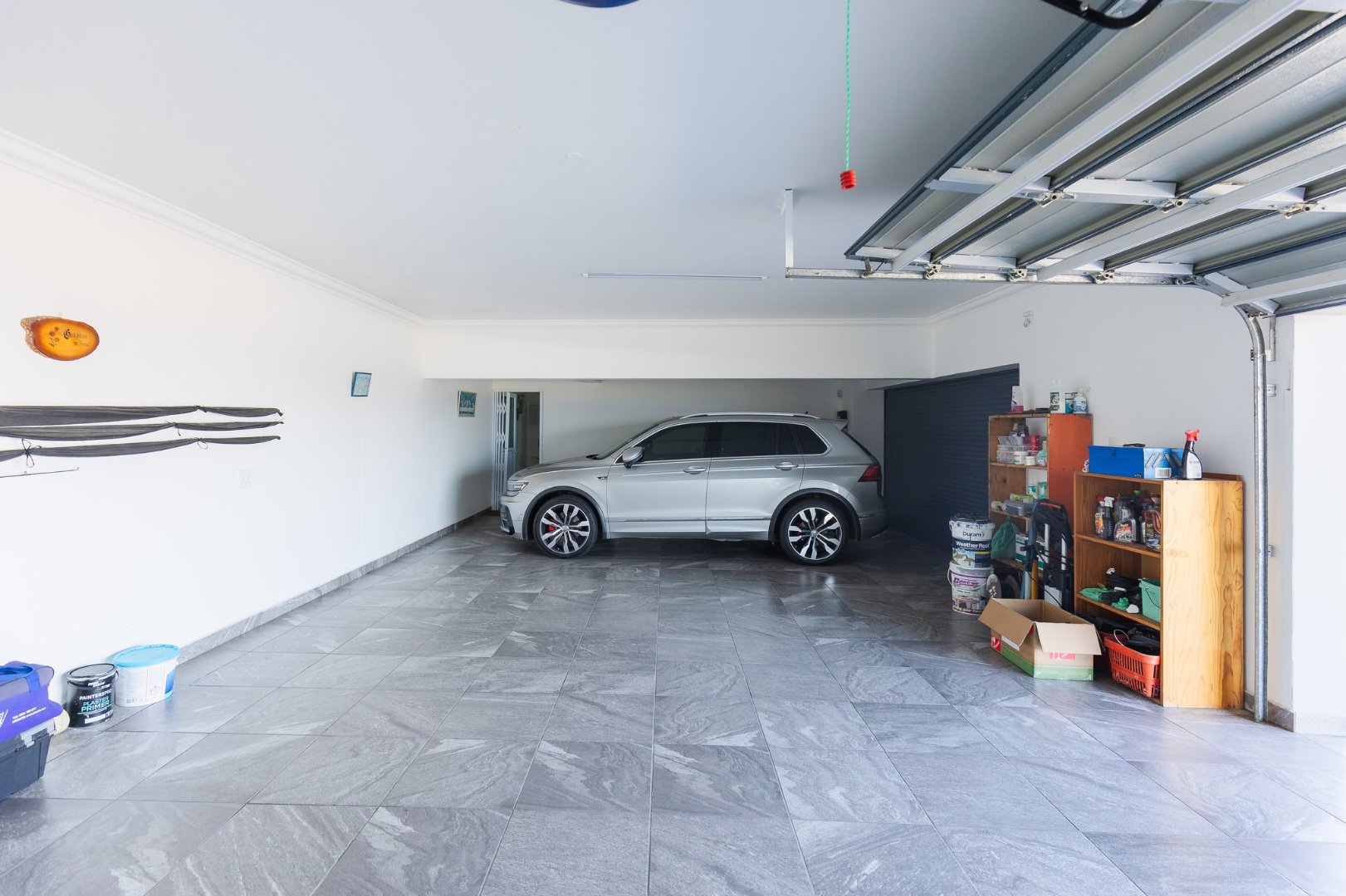 The bottom level features two double garages with direct access into the house, providing convenience and security. Ascend to the middle level, where an airy, open-plan living area awaits. This space is perfect for entertaining or relaxing, very light from the skylights and a striking high ceiling. The kitchen boasts granite countertops, a gas and electric hob, an eye-level oven, and a large scullery.