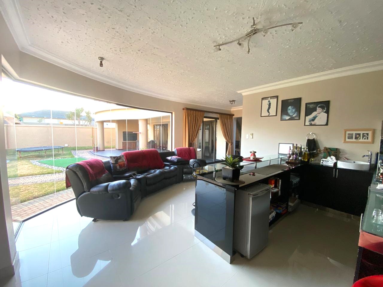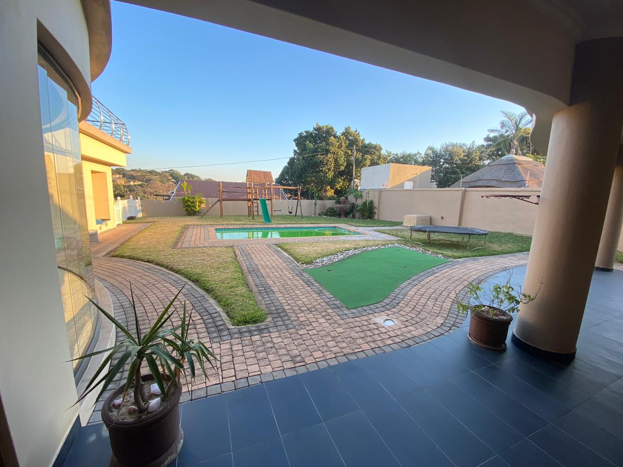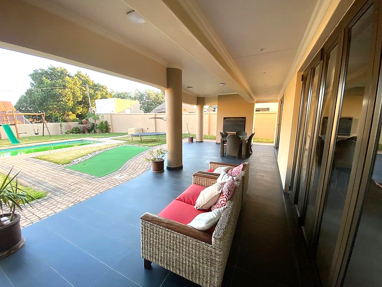 Lovely entertainment area with pool, small golf size area, play gym for the kids.. The garages interlink and offers wide space where you can store your toys. Borehole, Solar Panels and much more..