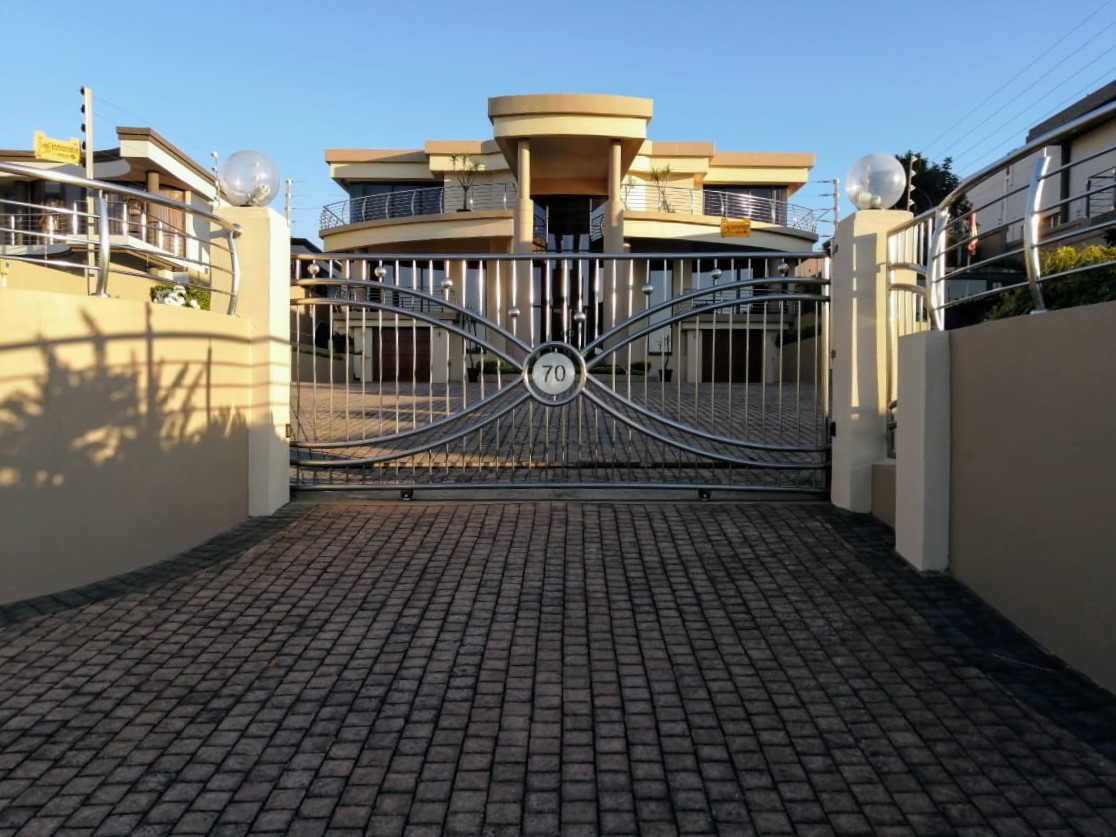 It features open plan spaces. 5 Spacious Bedrooms with walk in closets, 4 bathrooms , 2 x Lounge and Dining areas, Study, Beautiful Kitchen with scullery, Laundry,Gym, Staff Quarters and a outside shower..