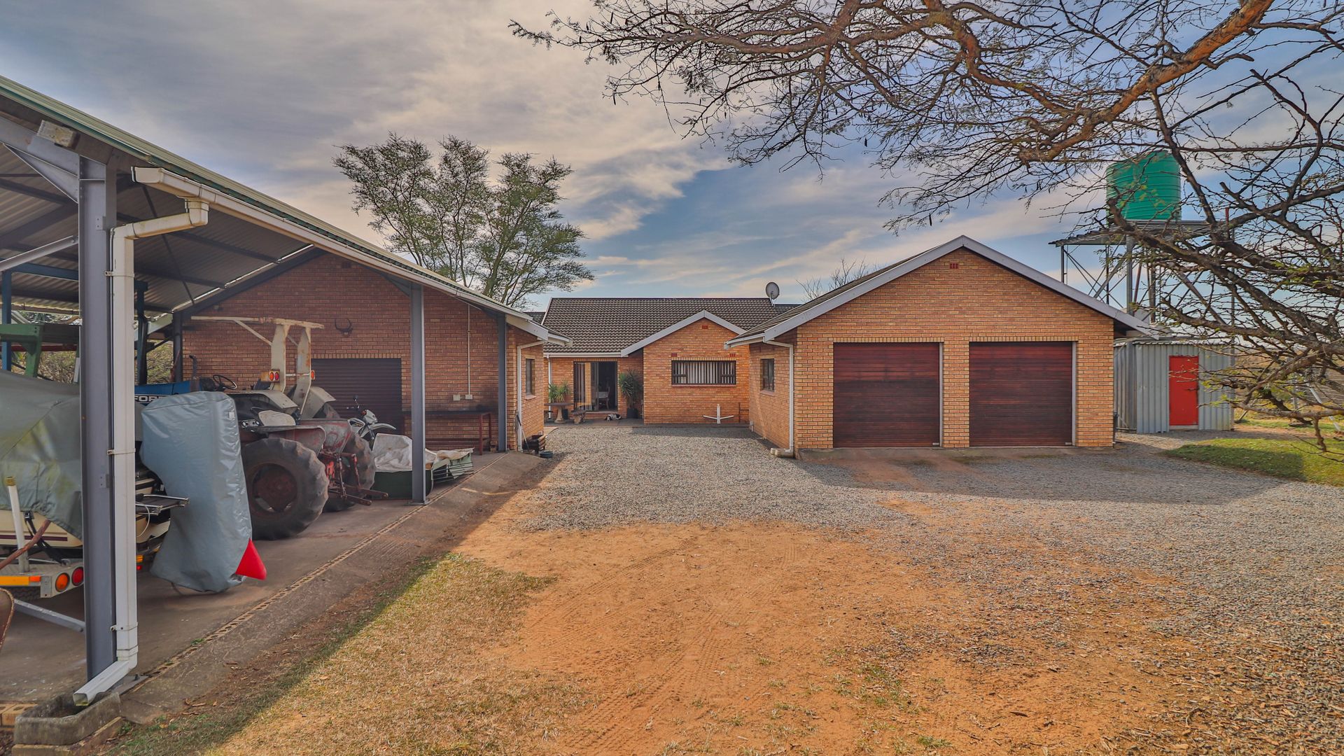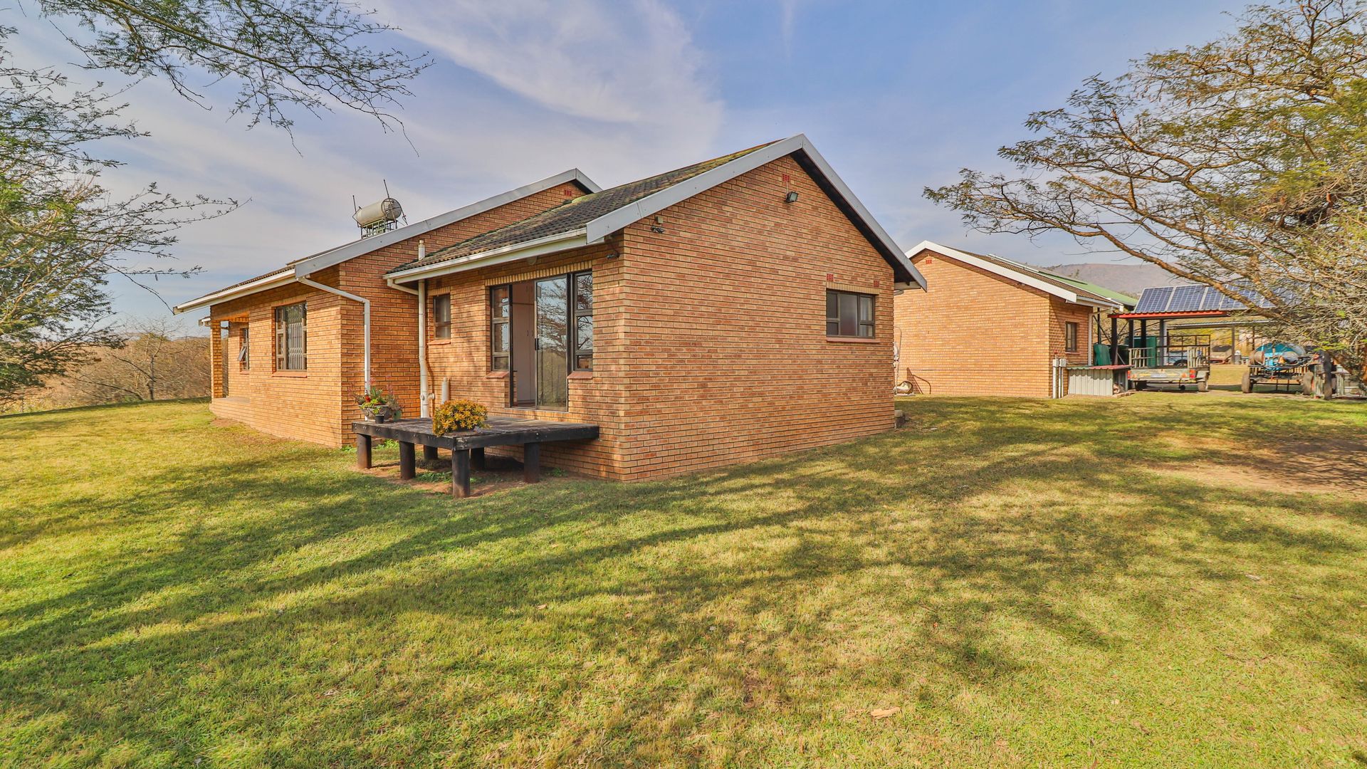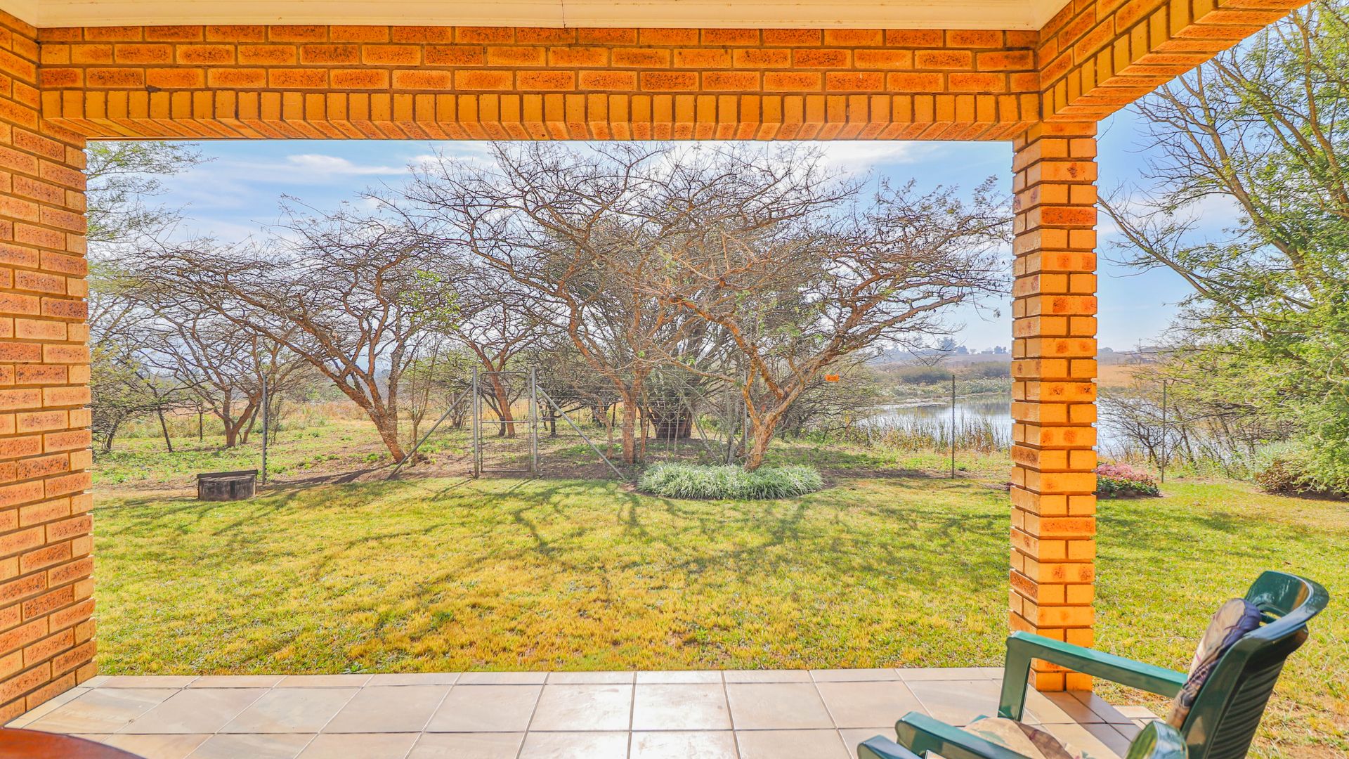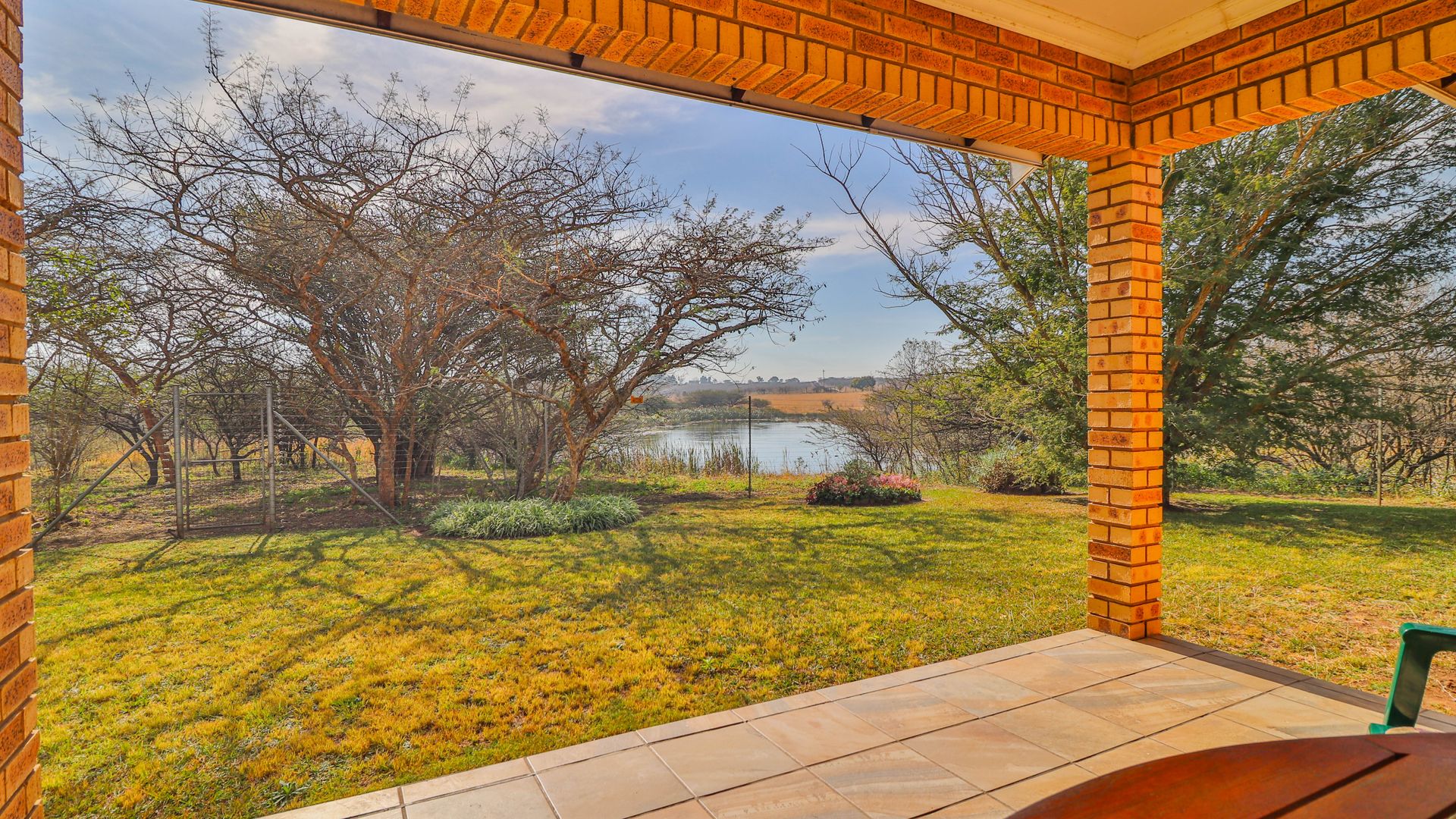 The facebrick farmhouse is spacious, contemporary, and designed to take full advantage of its idyllic surroundings. With 3 bedrooms and 2 en-suite bathrooms, the home is well-suited for comfortable family living or a peaceful country retreat. The main bedroom boasts a walk-in closet and a luxurious en-suite. A welcoming lounge with a gas fireplace opens onto a wide verandah, where panoramic views over the private dam create a picture-perfect setting.