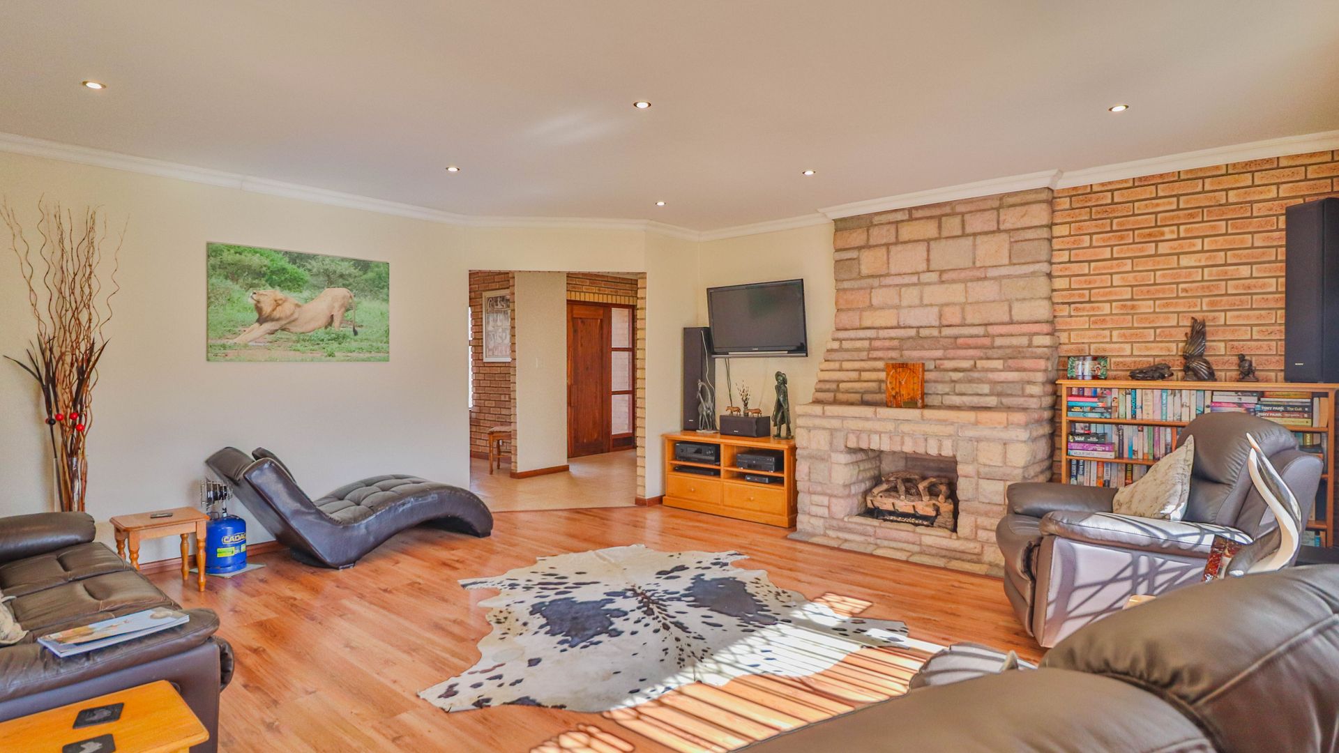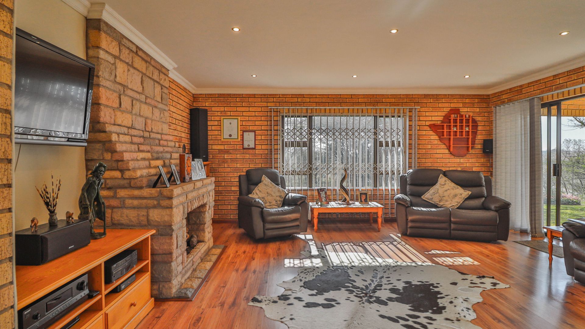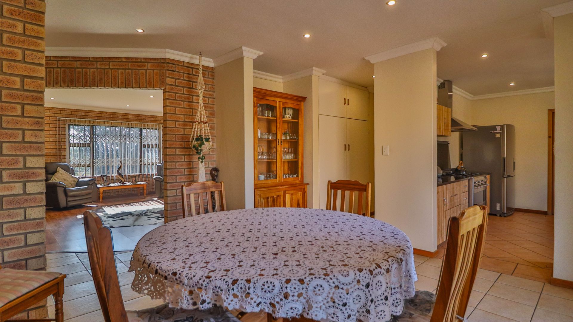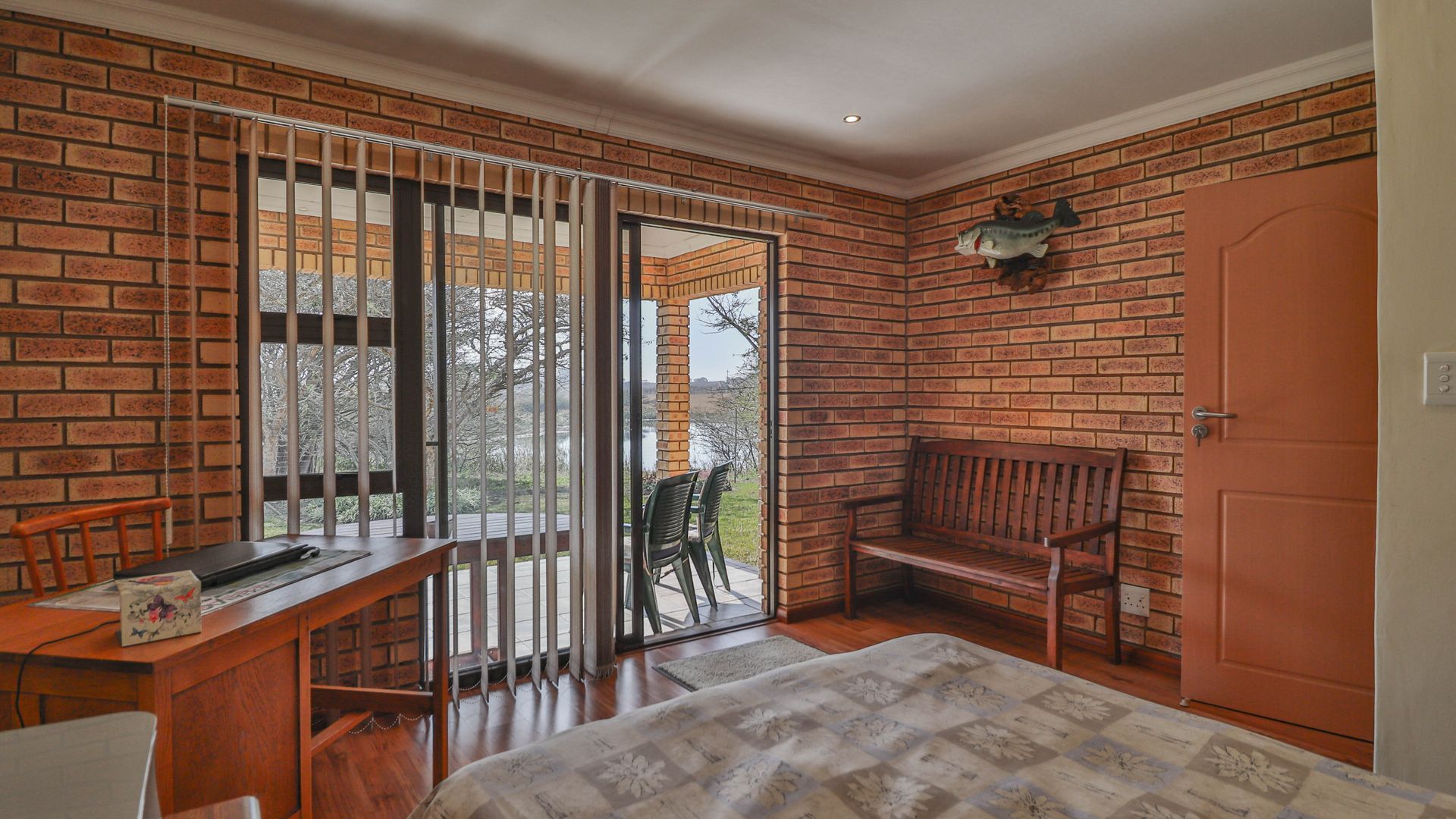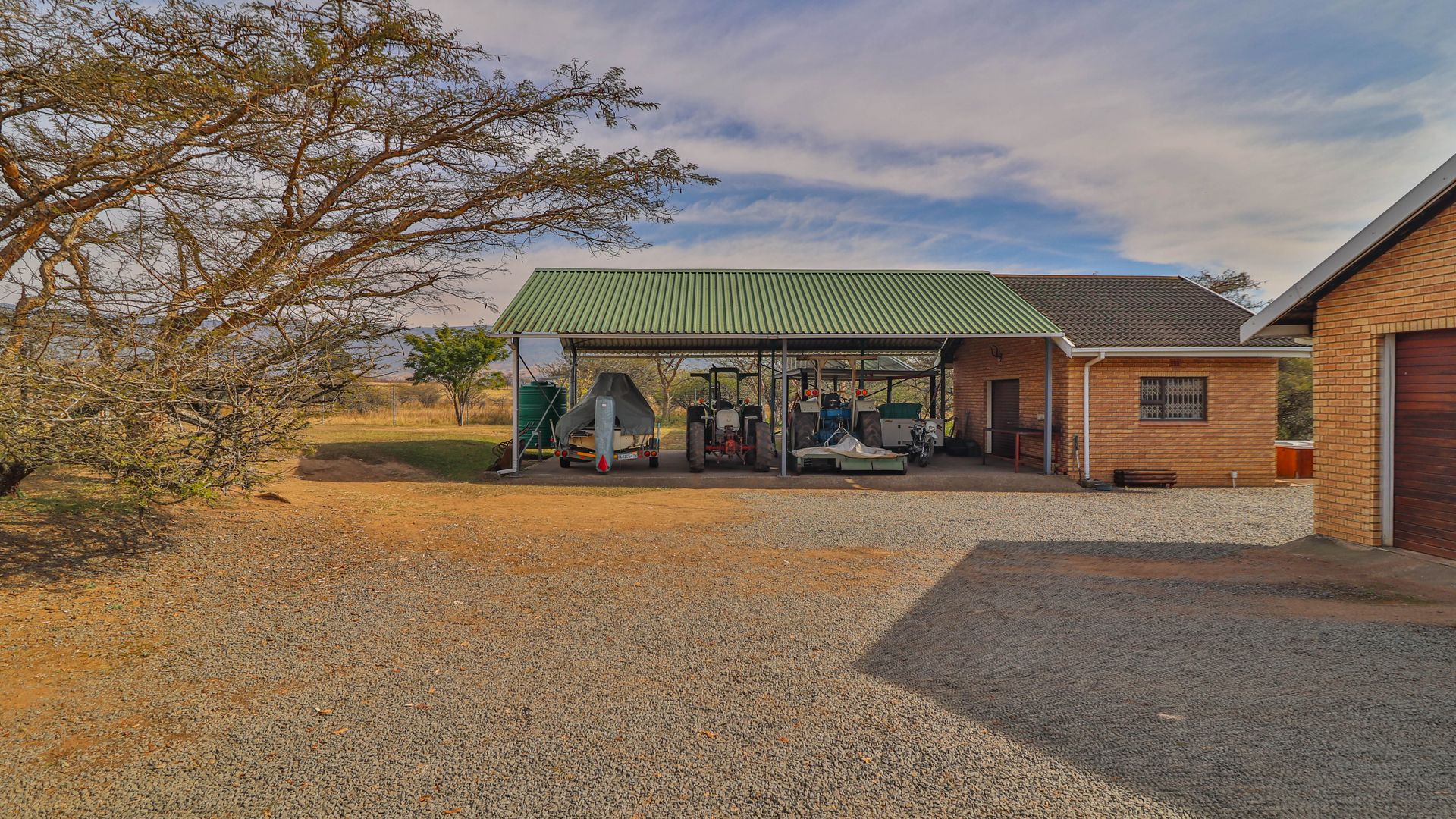 The facebrick farmhouse is spacious, contemporary, and designed to take full advantage of its idyllic surroundings. With 3 bedrooms and 2 en-suite bathrooms, the home is well-suited for comfortable family living or a peaceful country retreat. The main bedroom boasts a walk-in closet and a luxurious en-suite. A welcoming lounge with a gas fireplace opens onto a wide verandah, where panoramic views over the private dam create a picture-perfect setting.