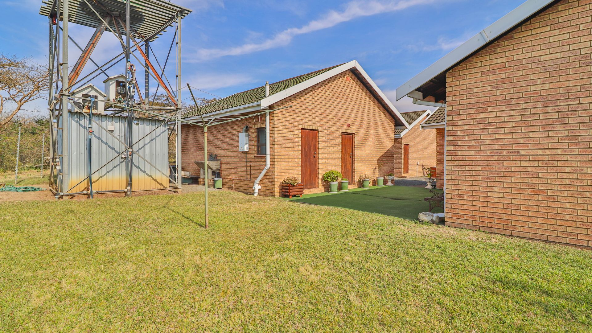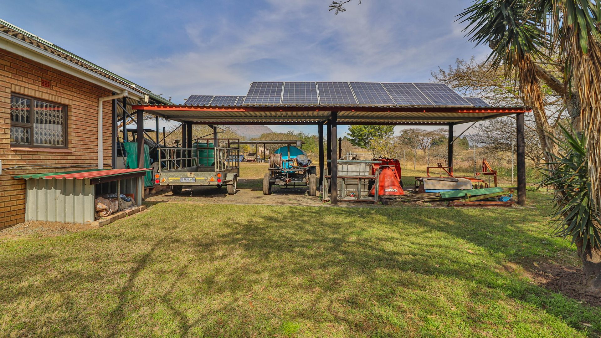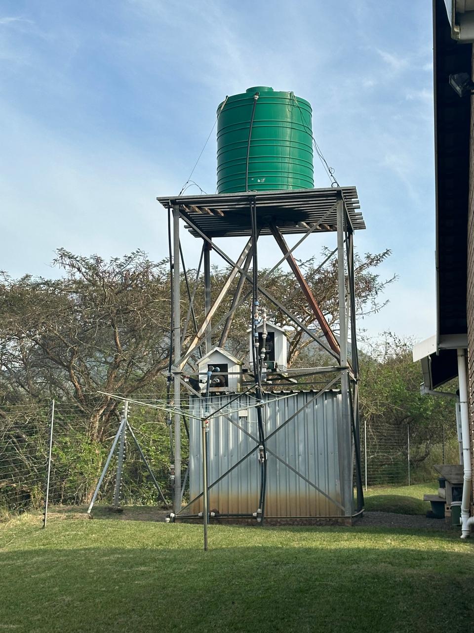 The home is supported by a fully off-grid energy solution: 24 solar panels, an 8kVA inverter, a 15kW lithium battery bank, and a backup generator. Water is supplied via a 3,500-litre borehole feeding into a storage tank, ensuring self-sufficiency. Should grid connectivity be desired, an Eskom transformer is already installed on the property.