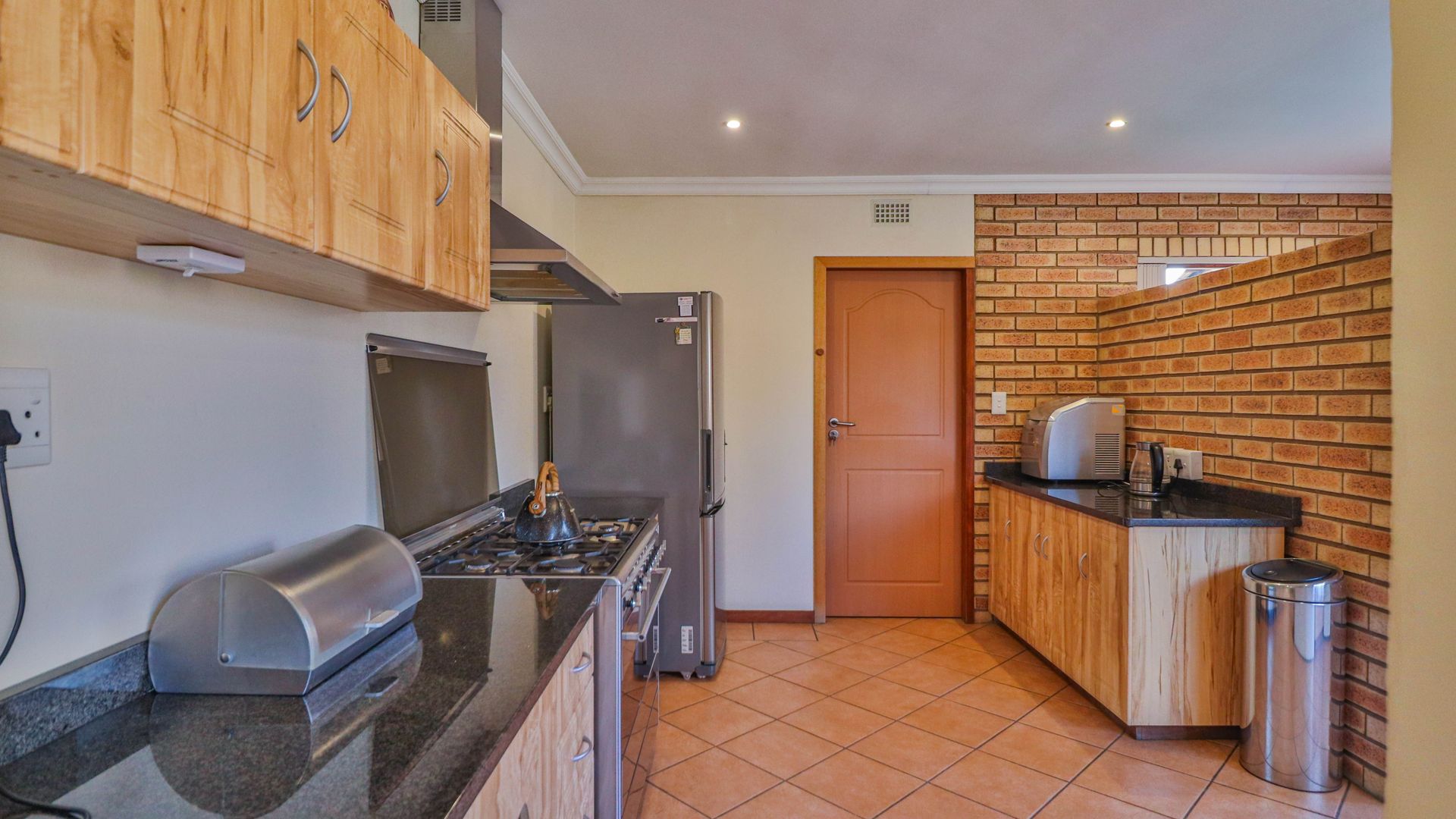 The well-appointed kitchen features granite countertops, solid wooden cabinetry, and both gas and electric hob/oven options. A separate scullery includes a double sink and fittings for both a dishwasher and washing machine.