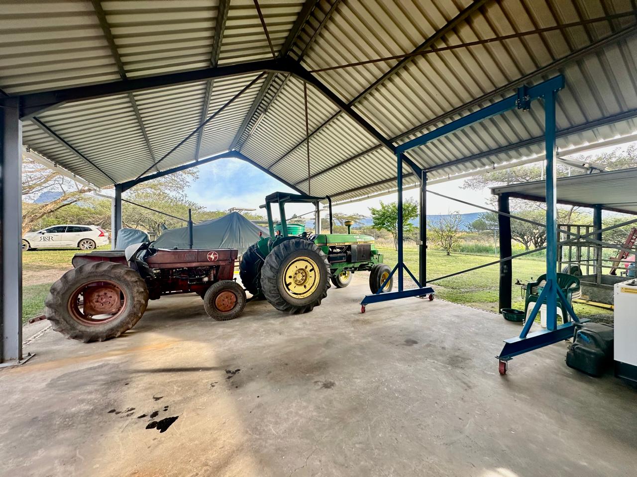 Security is a top priority, with the home and outbuildings secured by a perimeter electric fence, security cameras, and a 24/7 response service. The property includes 280m2 of outbuildings including a workshop and shed, in addition to garages for vehicle and equipment storage.