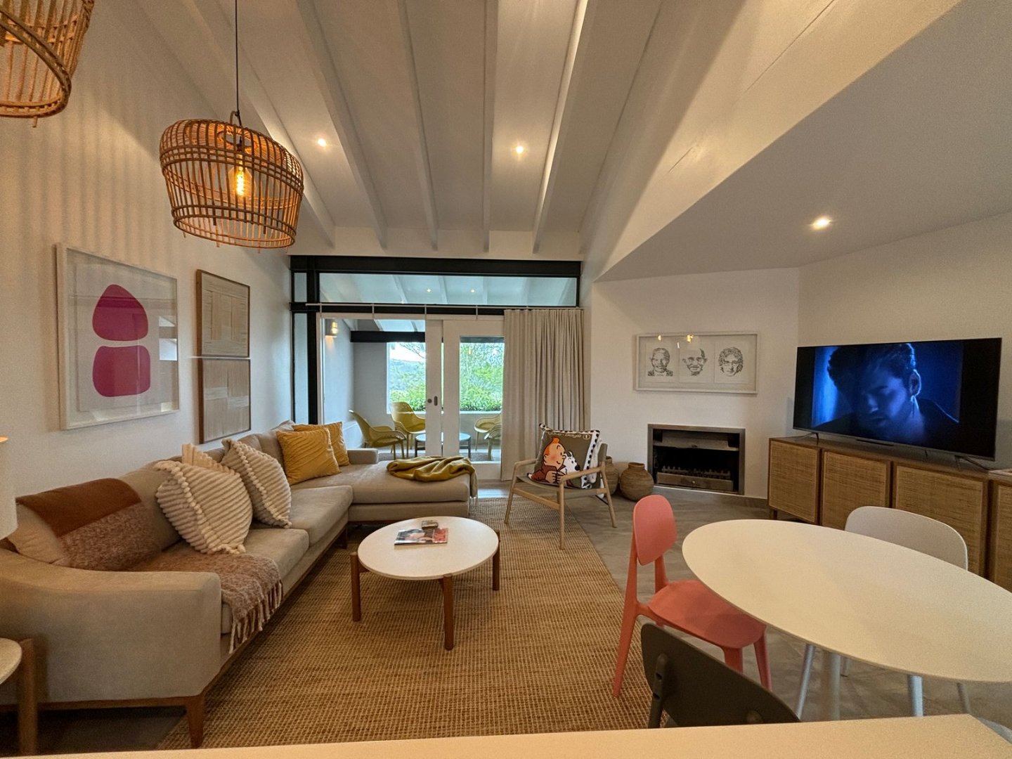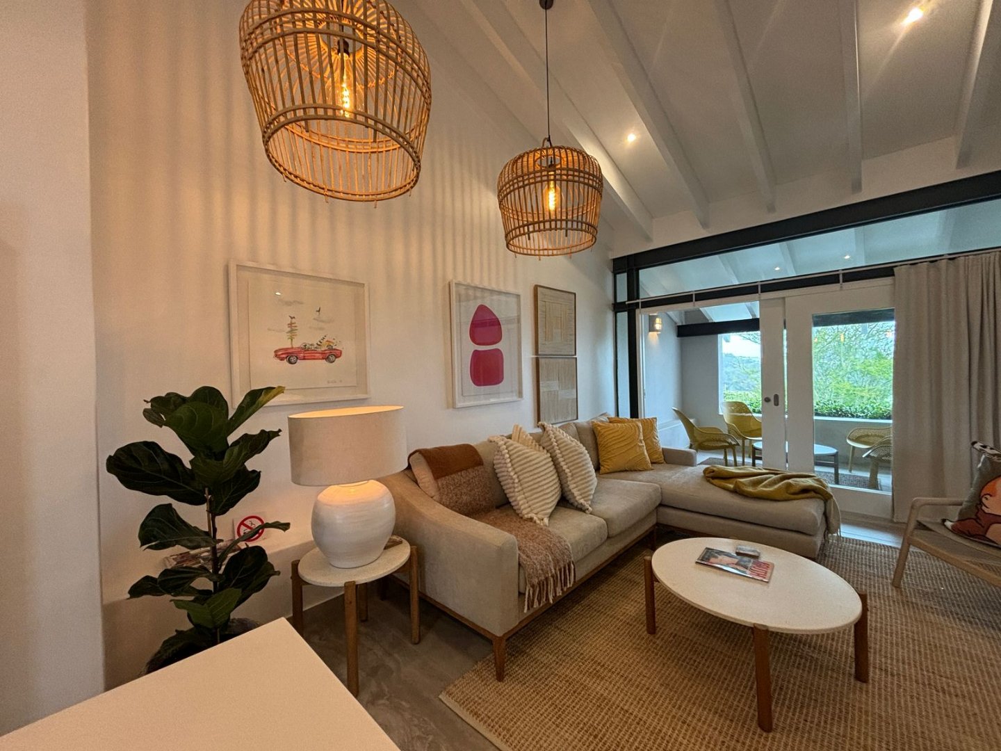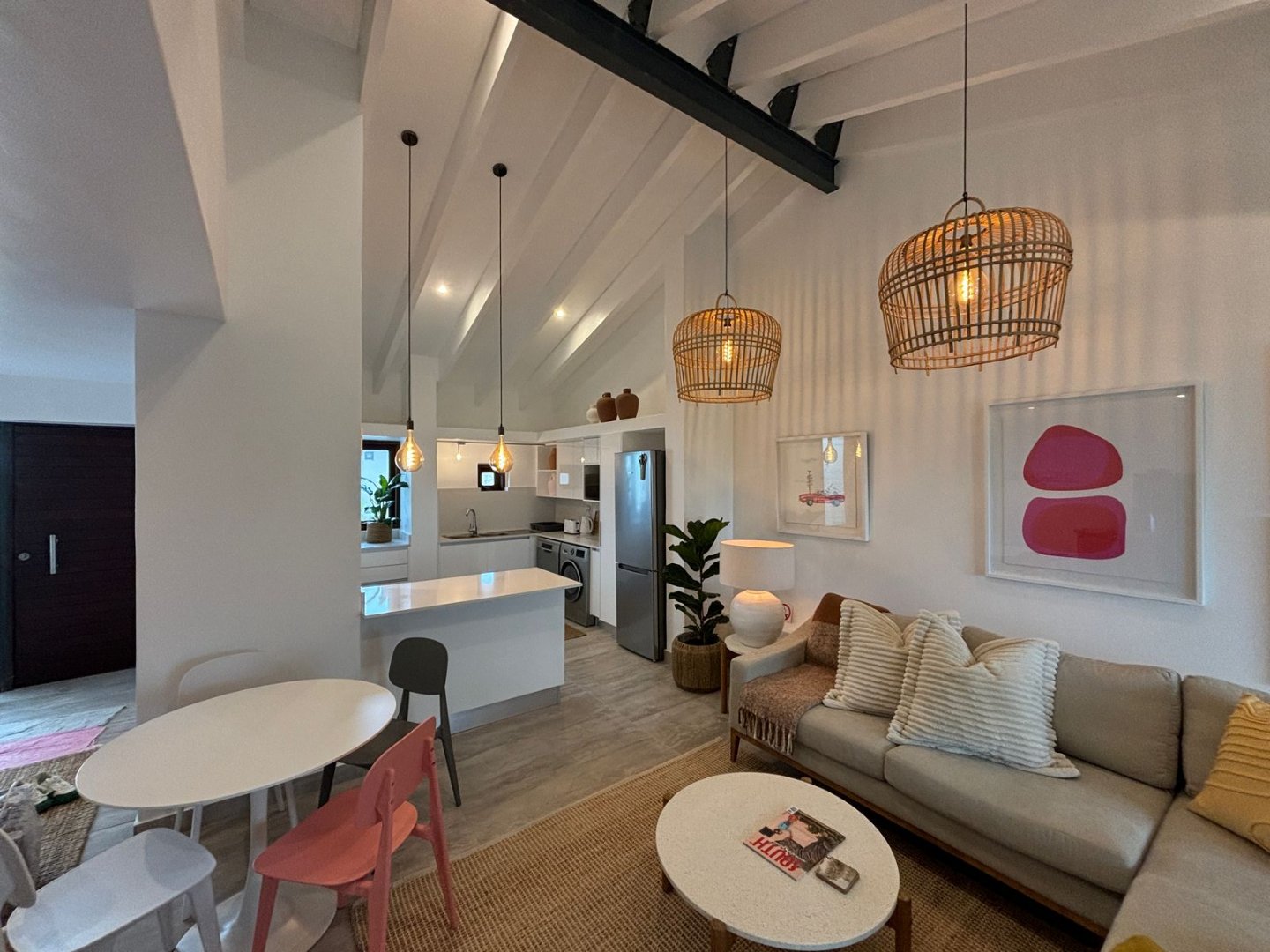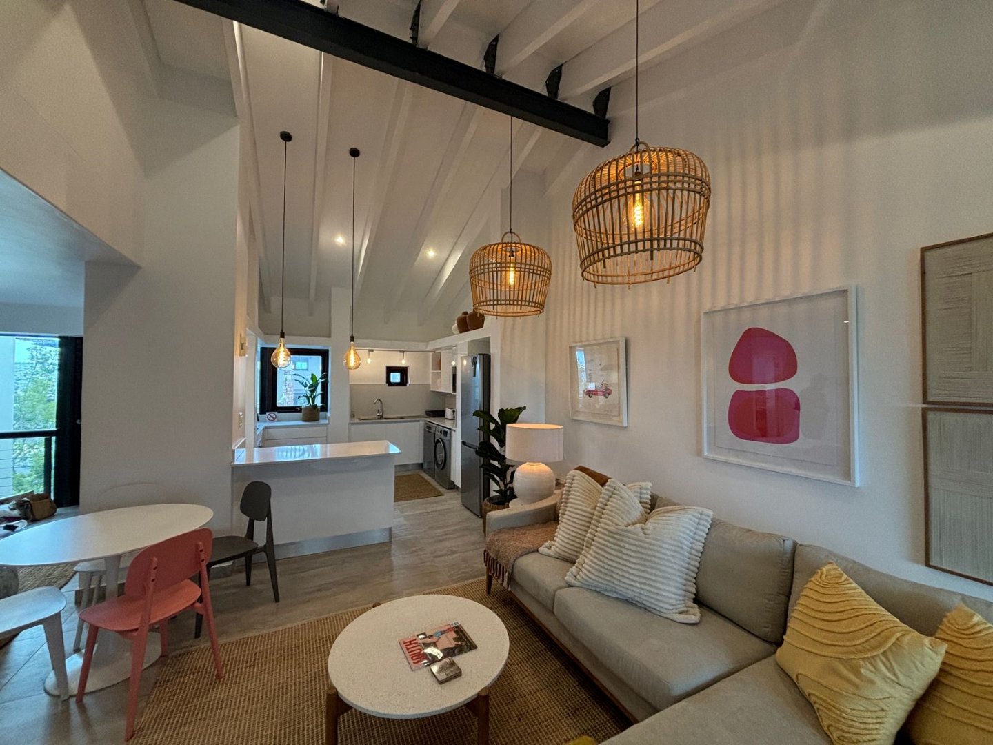 Step into a stylish, open-plan living area with exposed rafters that create a sense of space and character. The unit has