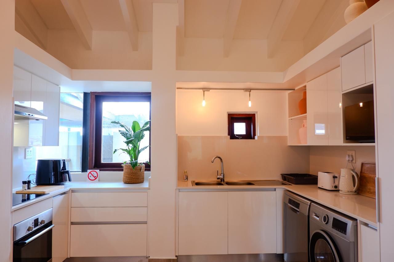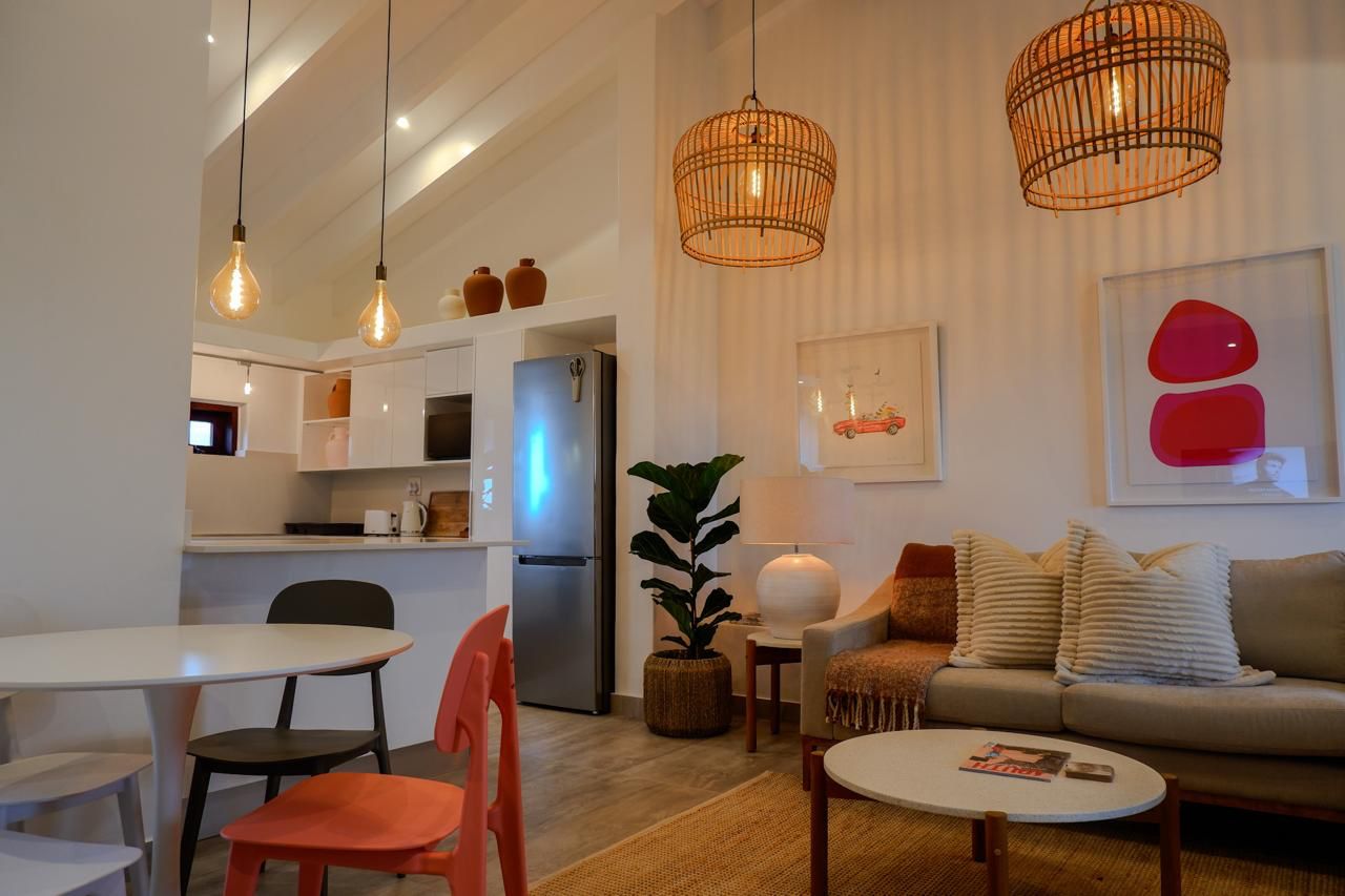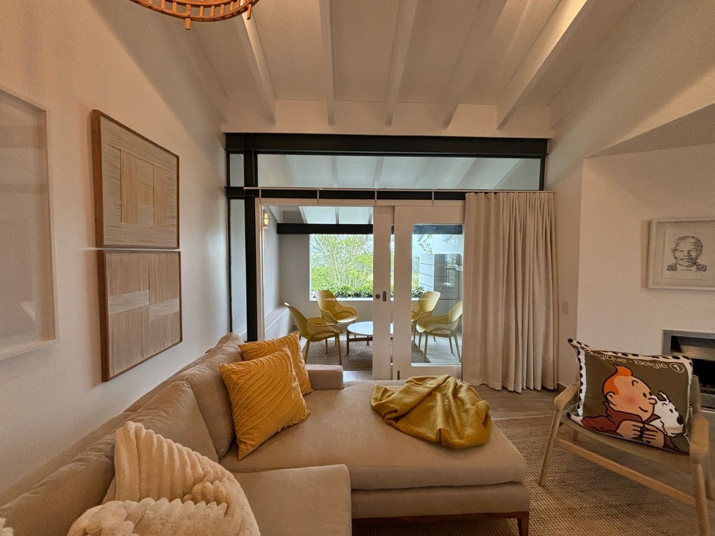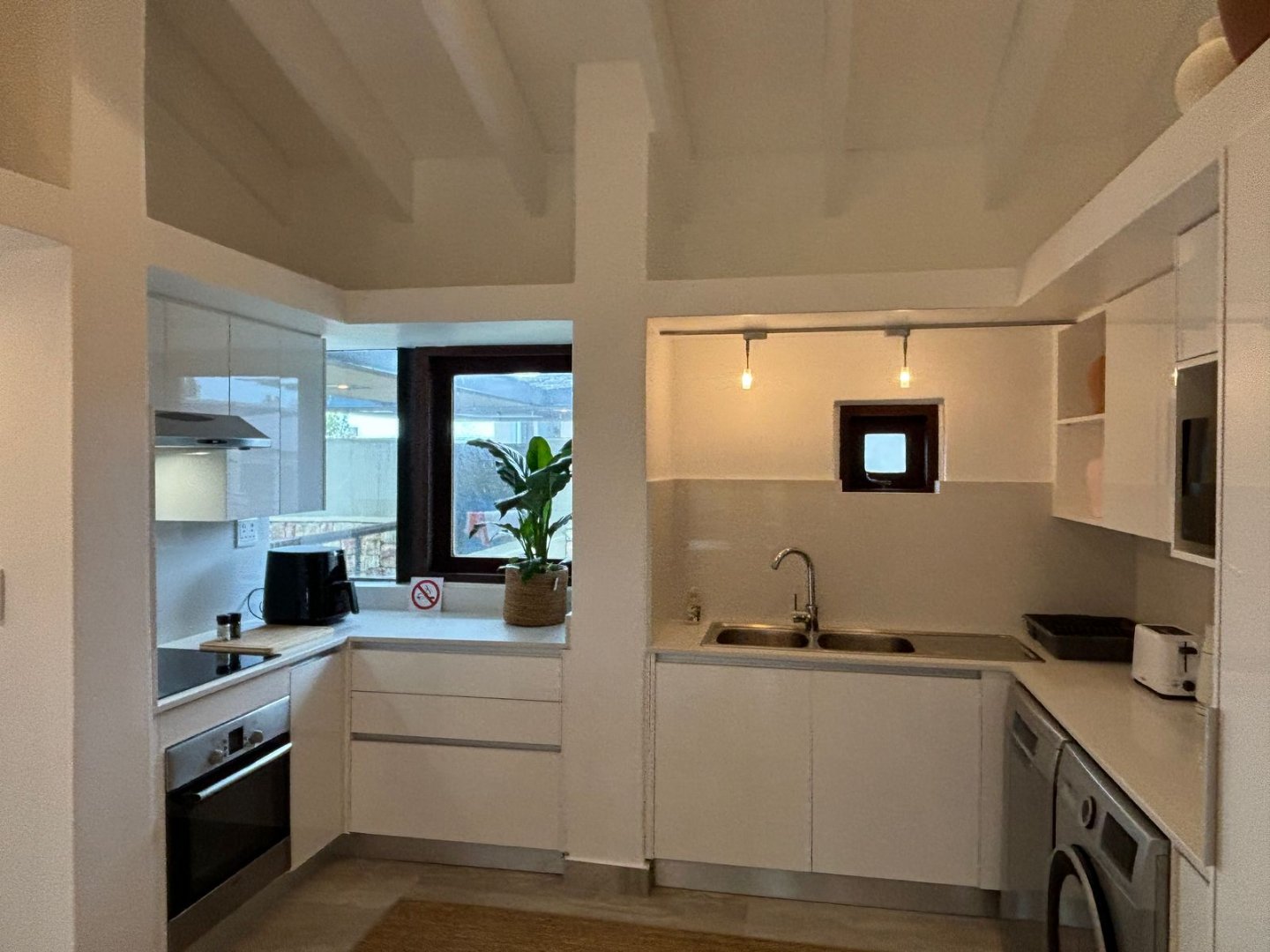 Step into a stylish, open-plan living area with exposed rafters that create a sense of space and character. The unit has