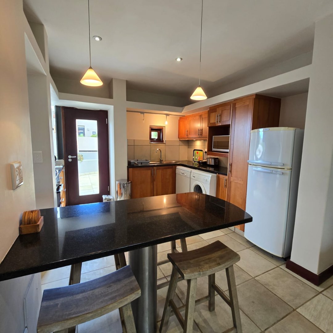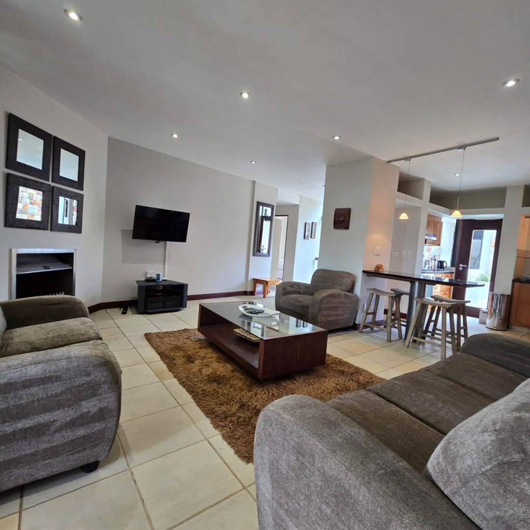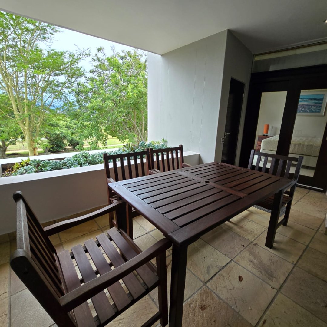 Sunny, private, and well-located 2-bedroom, 2-bathroom first-floor apartment in Oubaai Golf Estate. North-facing patio with peaceful mountain views and an open-plan living area with a wood-burning fireplace. Fully Furnished.