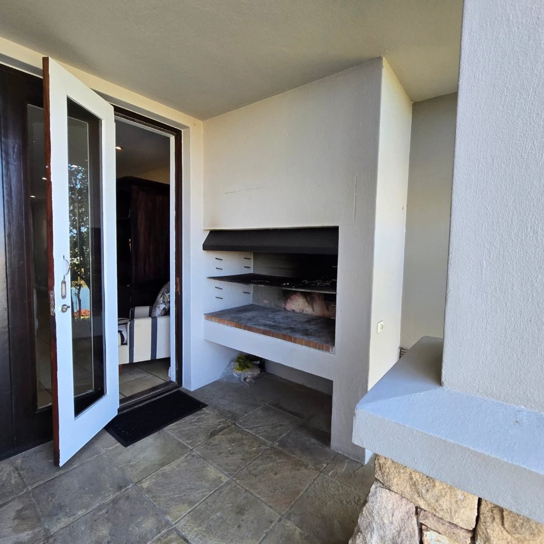 The home opens into light-filled, open-plan living areas that flow effortlessly between the lounge, dining room, and kitchen. A wood-burning fireplace warms the dining space in winter, while the large built-in braai extends your living outdoors, spilling into a private garden framed by manicured estate landscaping.