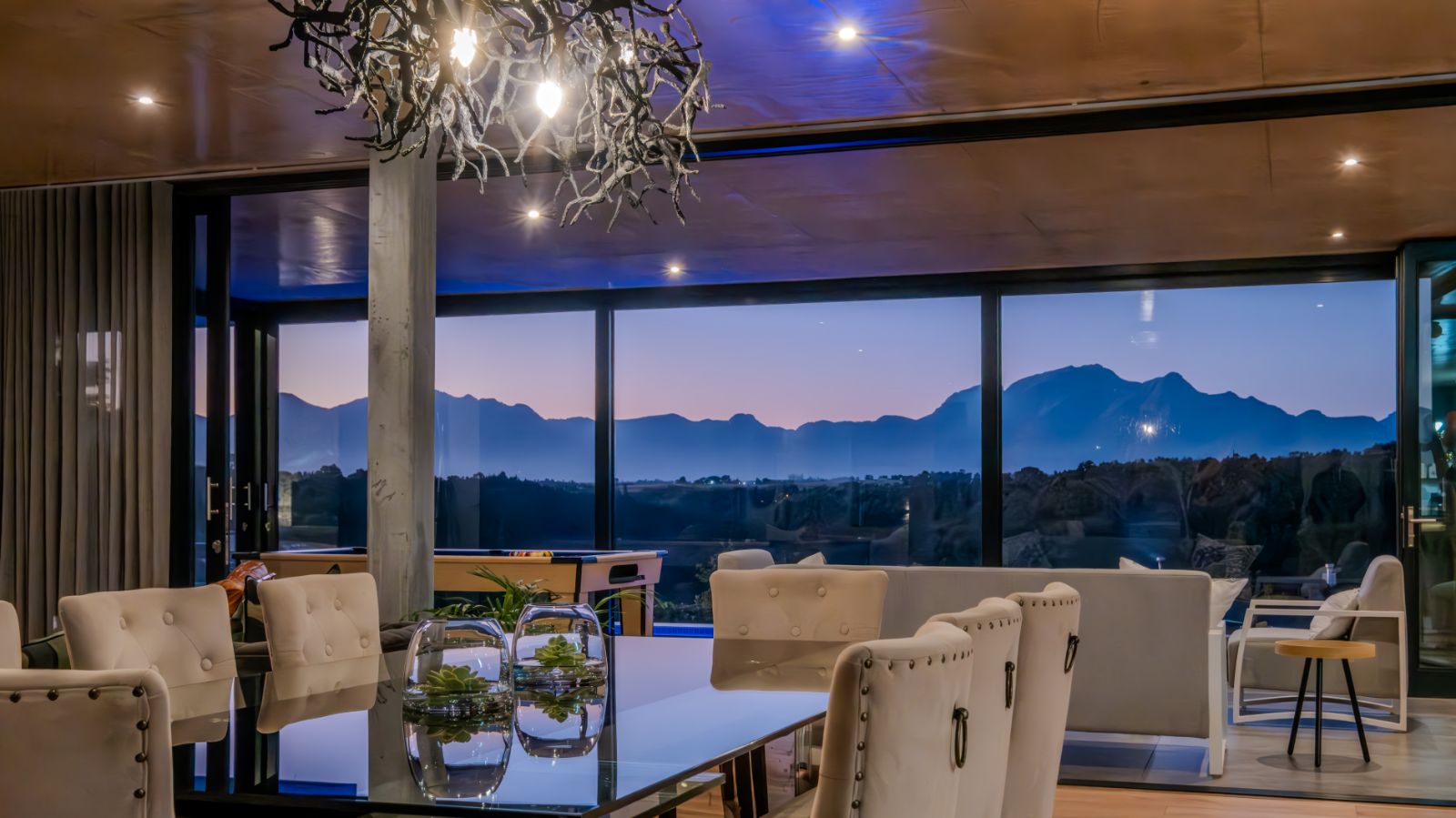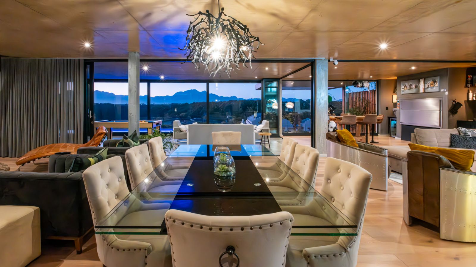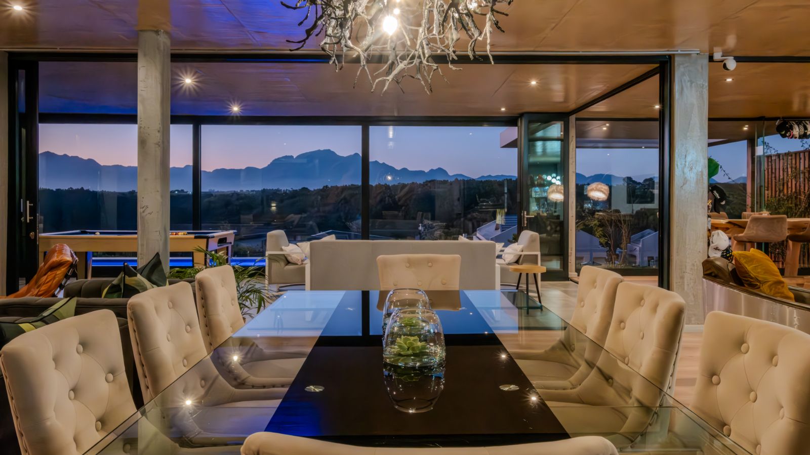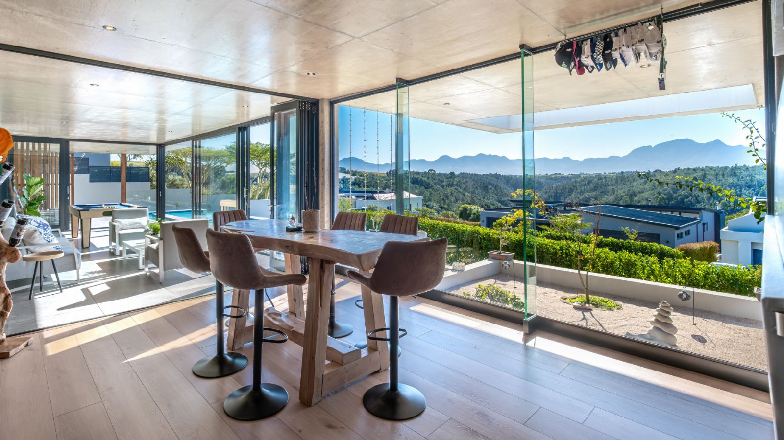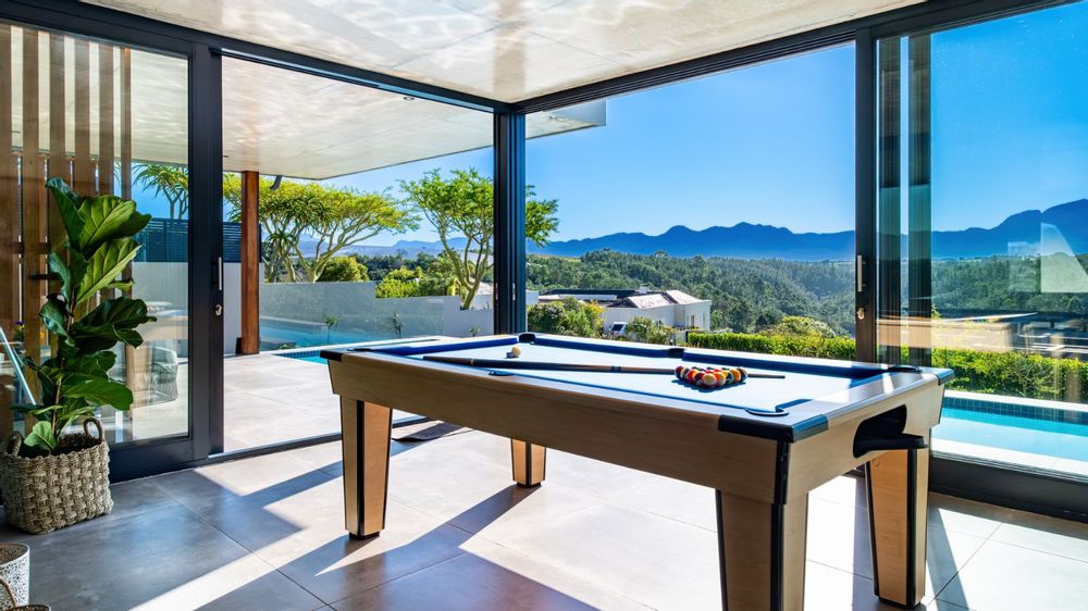 The entertainment journey continues through a spacious lounge that leads to a sophisticated braai room, complete with built-in braai and floor-to-ceiling glass windows framing a tranquil zen garden. To the left, a luxurious entertainment wing includes a lounge area and pool table space, with large stackable glass doors opening onto the sun-drenched pool deck. Outside, a contemporary boma fire pit and modern swimming pool create the perfect setting for evening relaxation — all north-facing to take in breathtaking mountain vistas.