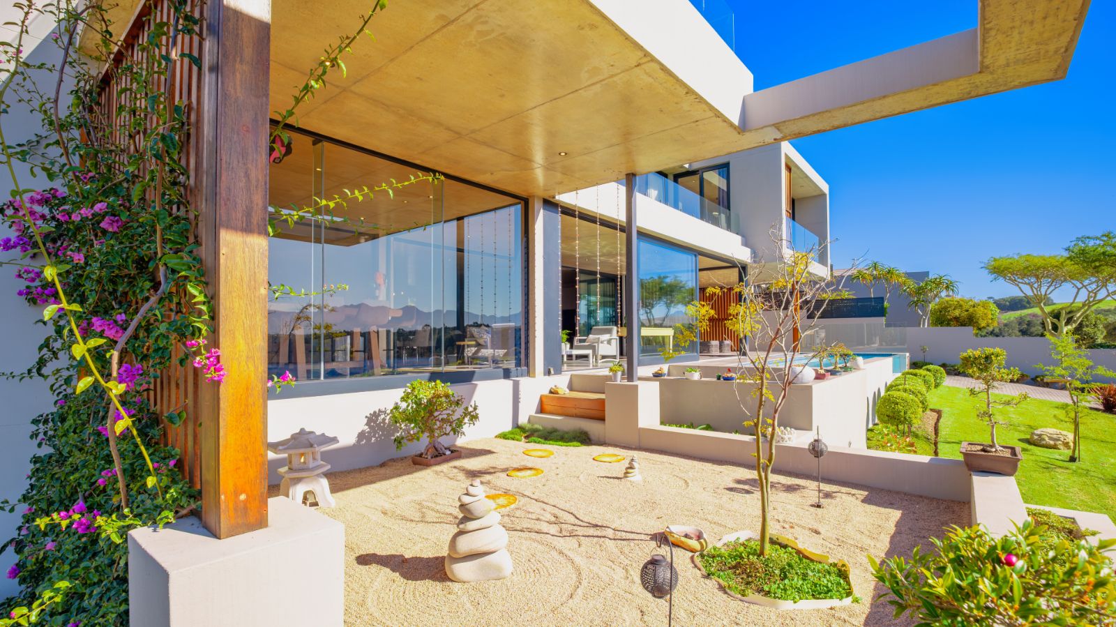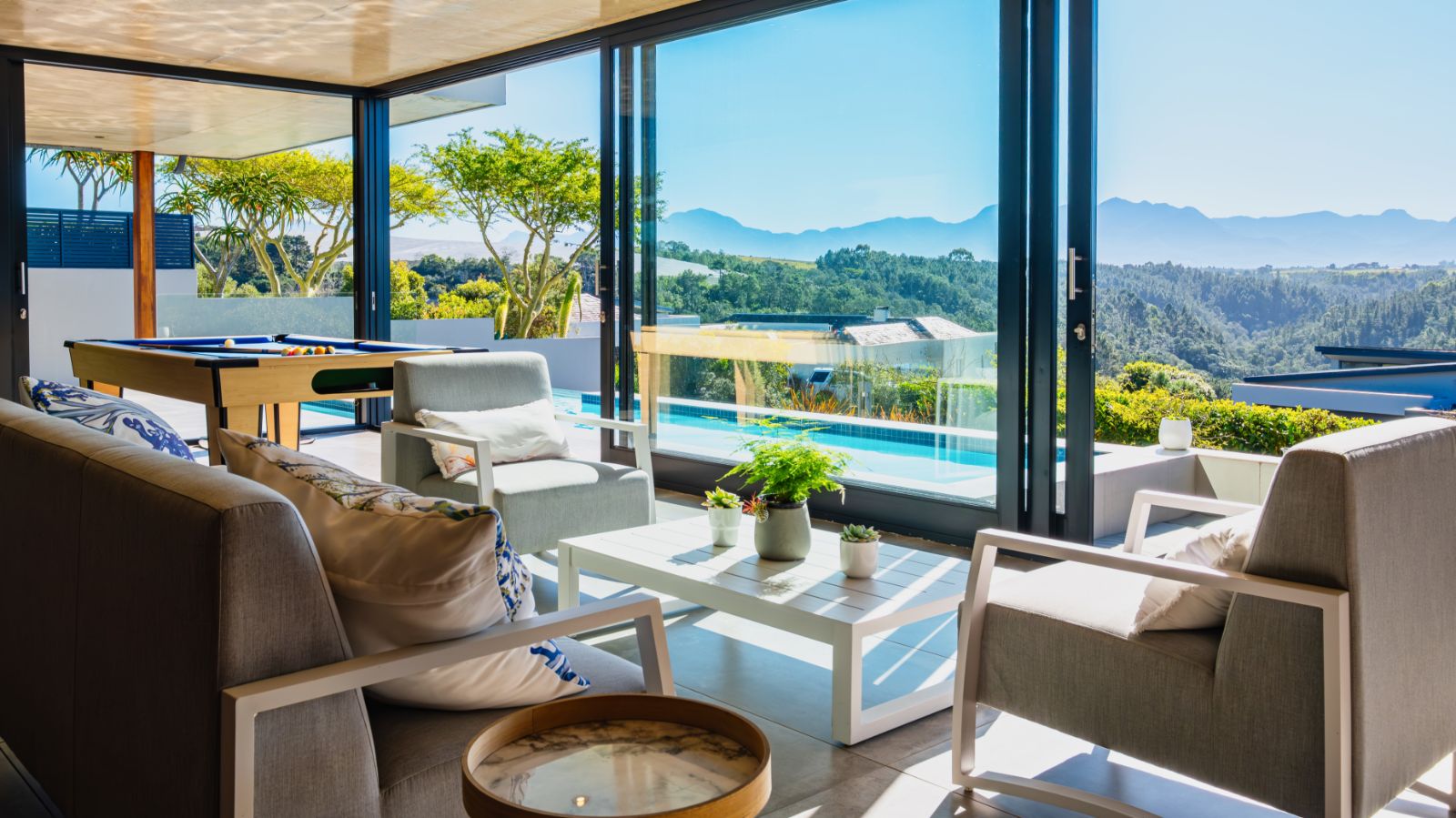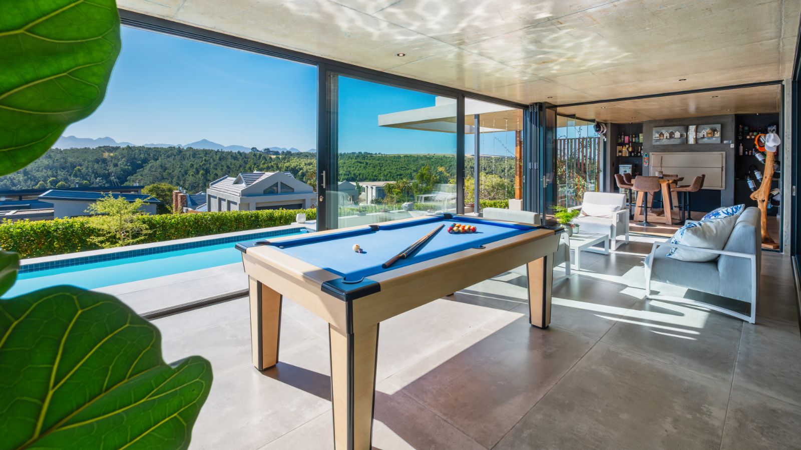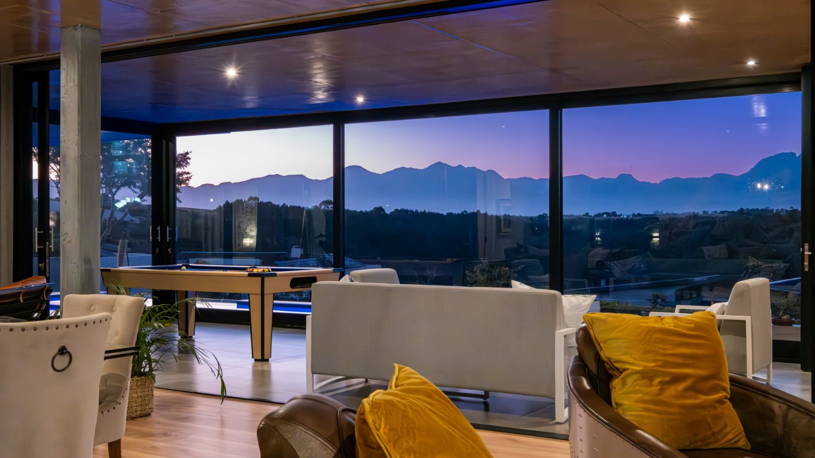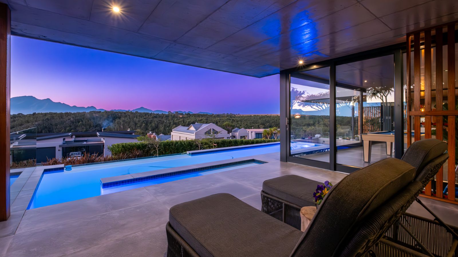 The entertainment journey continues through a spacious lounge that leads to a sophisticated braai room, complete with built-in braai and floor-to-ceiling glass windows framing a tranquil zen garden. To the left, a luxurious entertainment wing includes a lounge area and pool table space, with large stackable glass doors opening onto the sun-drenched pool deck. Outside, a contemporary boma fire pit and modern swimming pool create the perfect setting for evening relaxation — all north-facing to take in breathtaking mountain vistas.