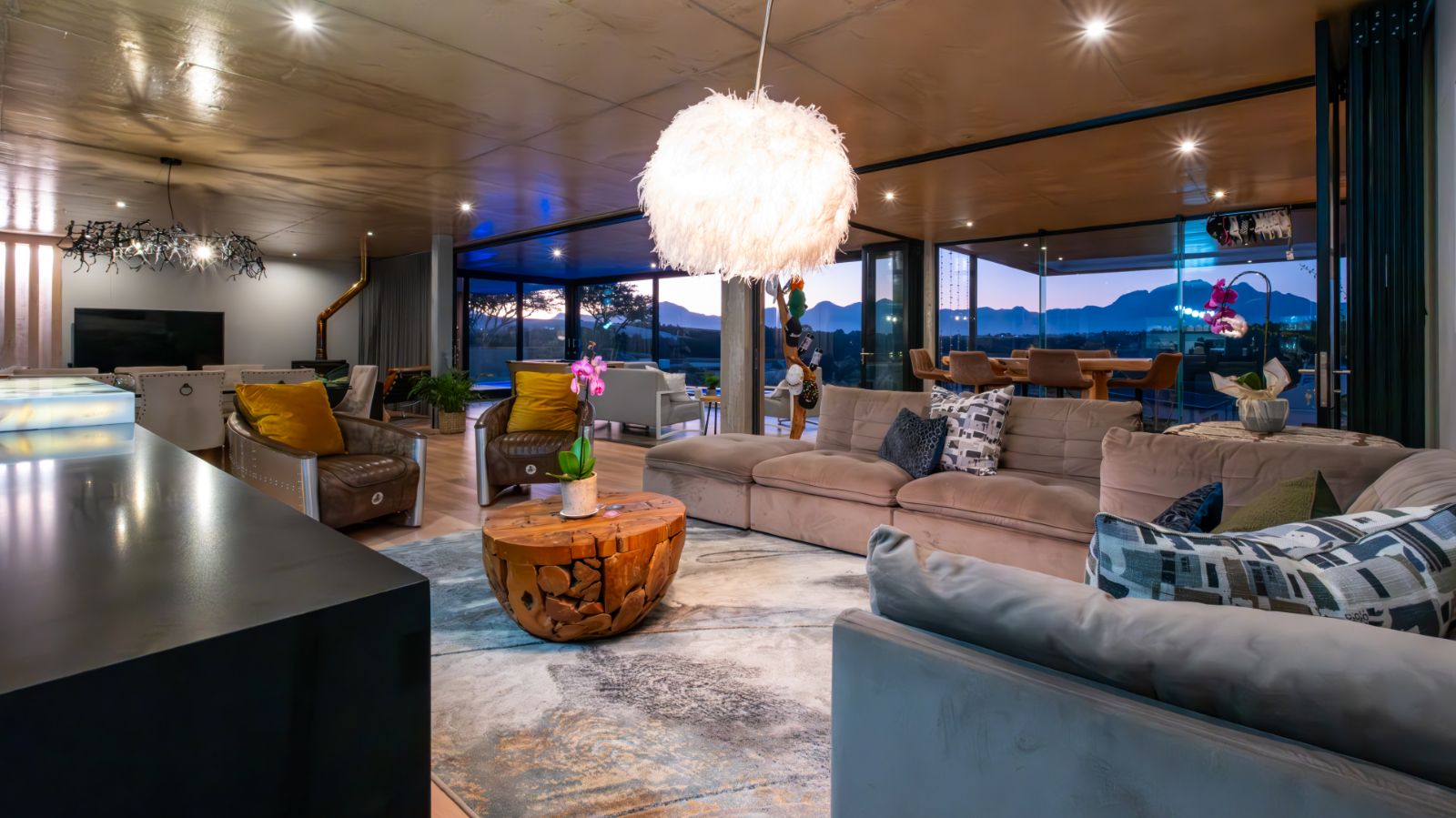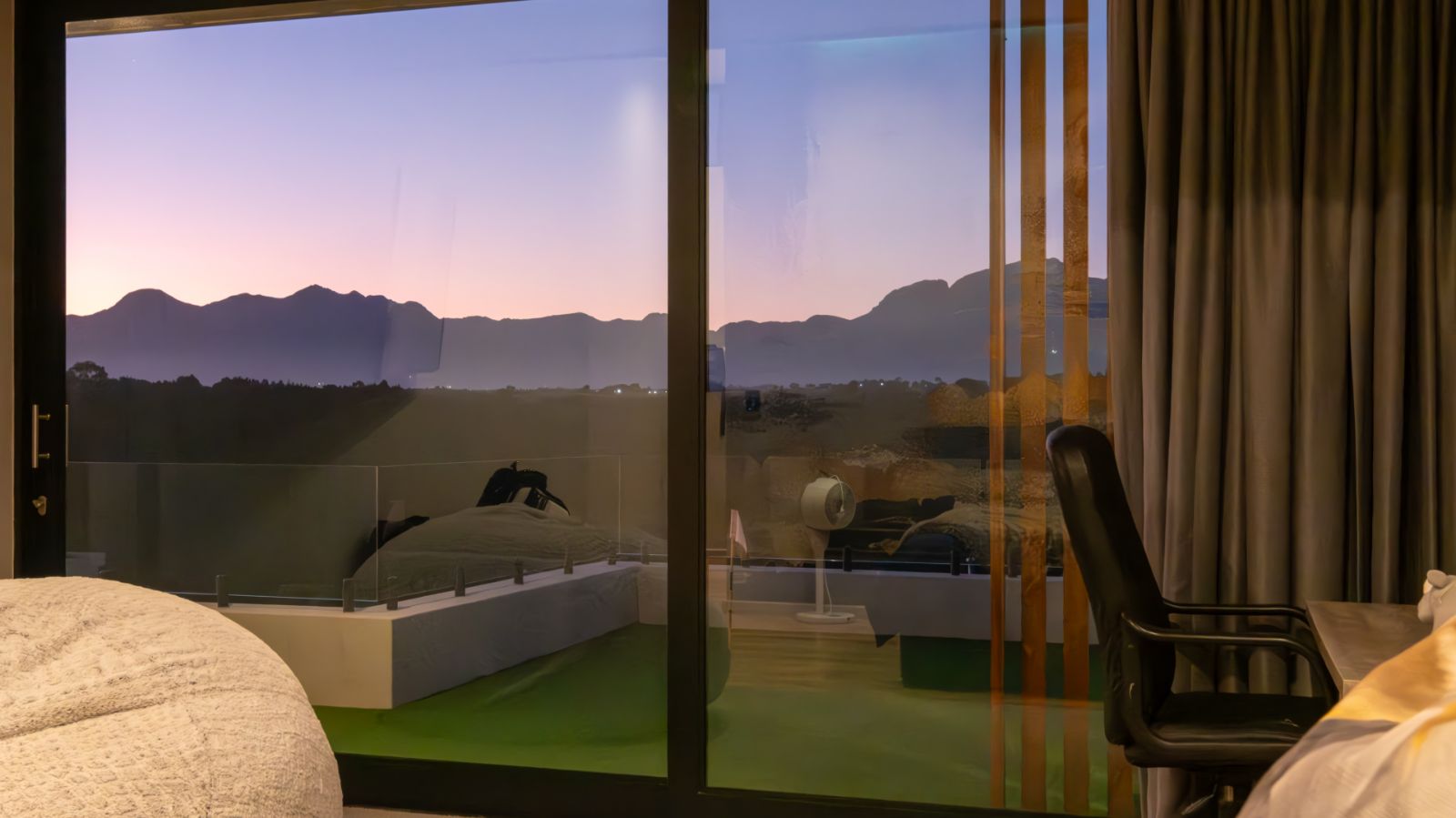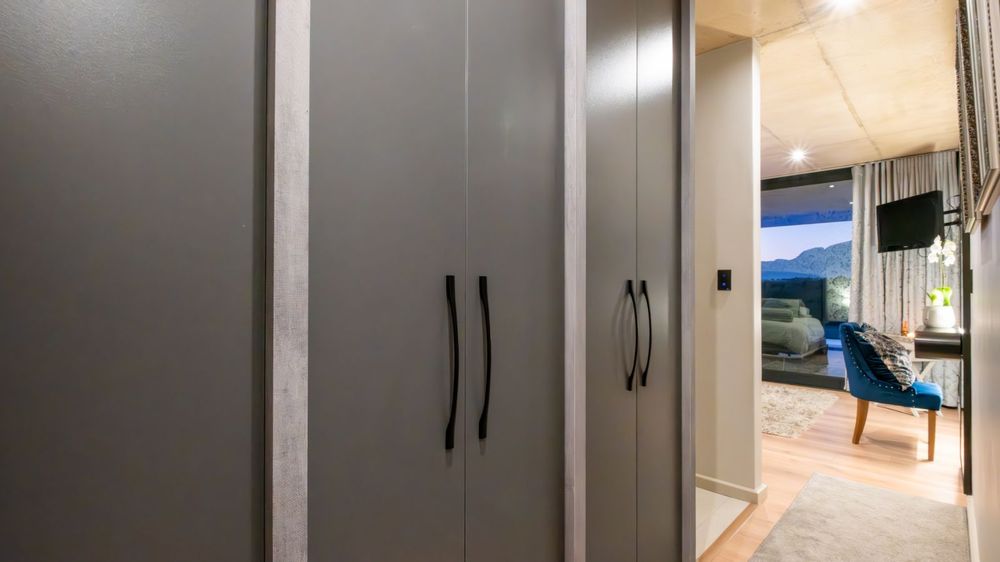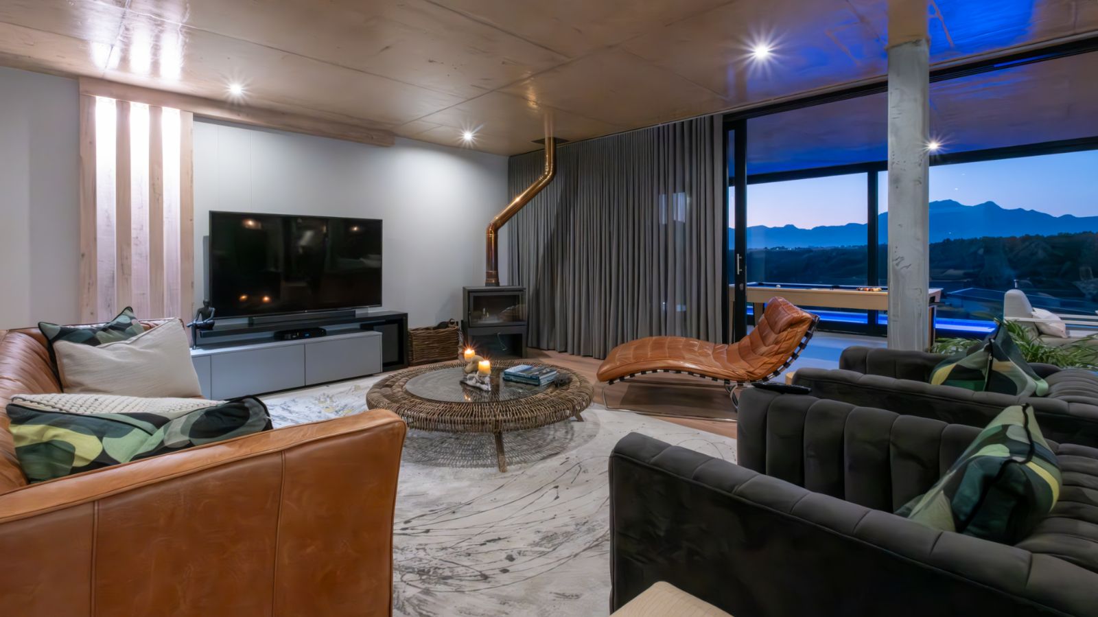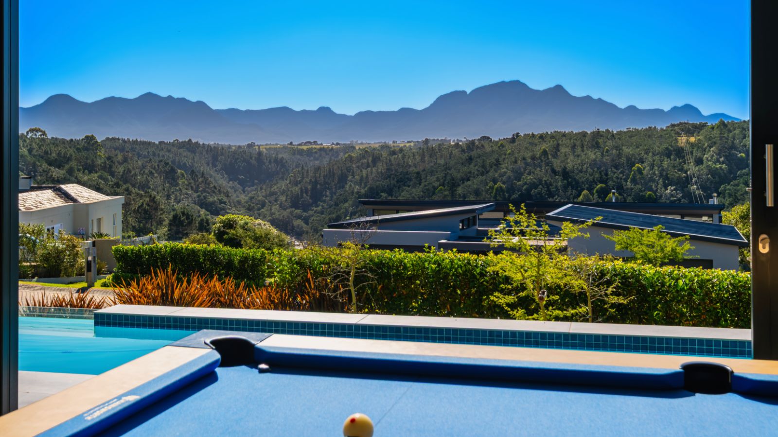 The entertainment journey continues through a spacious lounge that leads to a sophisticated braai room, complete with built-in braai and floor-to-ceiling glass windows framing a tranquil zen garden. To the left, a luxurious entertainment wing includes a lounge area and pool table space, with large stackable glass doors opening onto the sun-drenched pool deck. Outside, a contemporary boma fire pit and modern swimming pool create the perfect setting for evening relaxation — all north-facing to take in breathtaking mountain vistas.