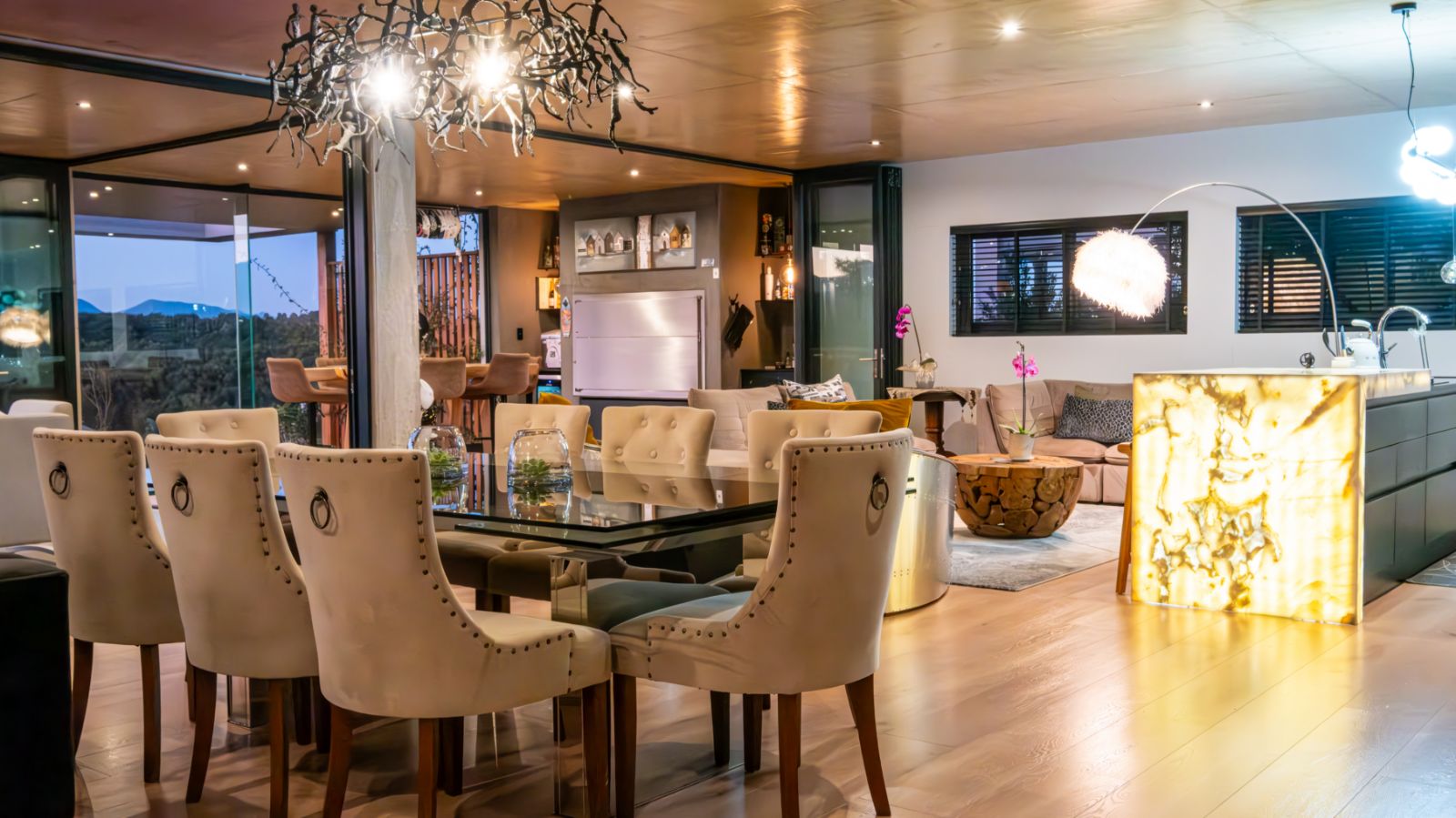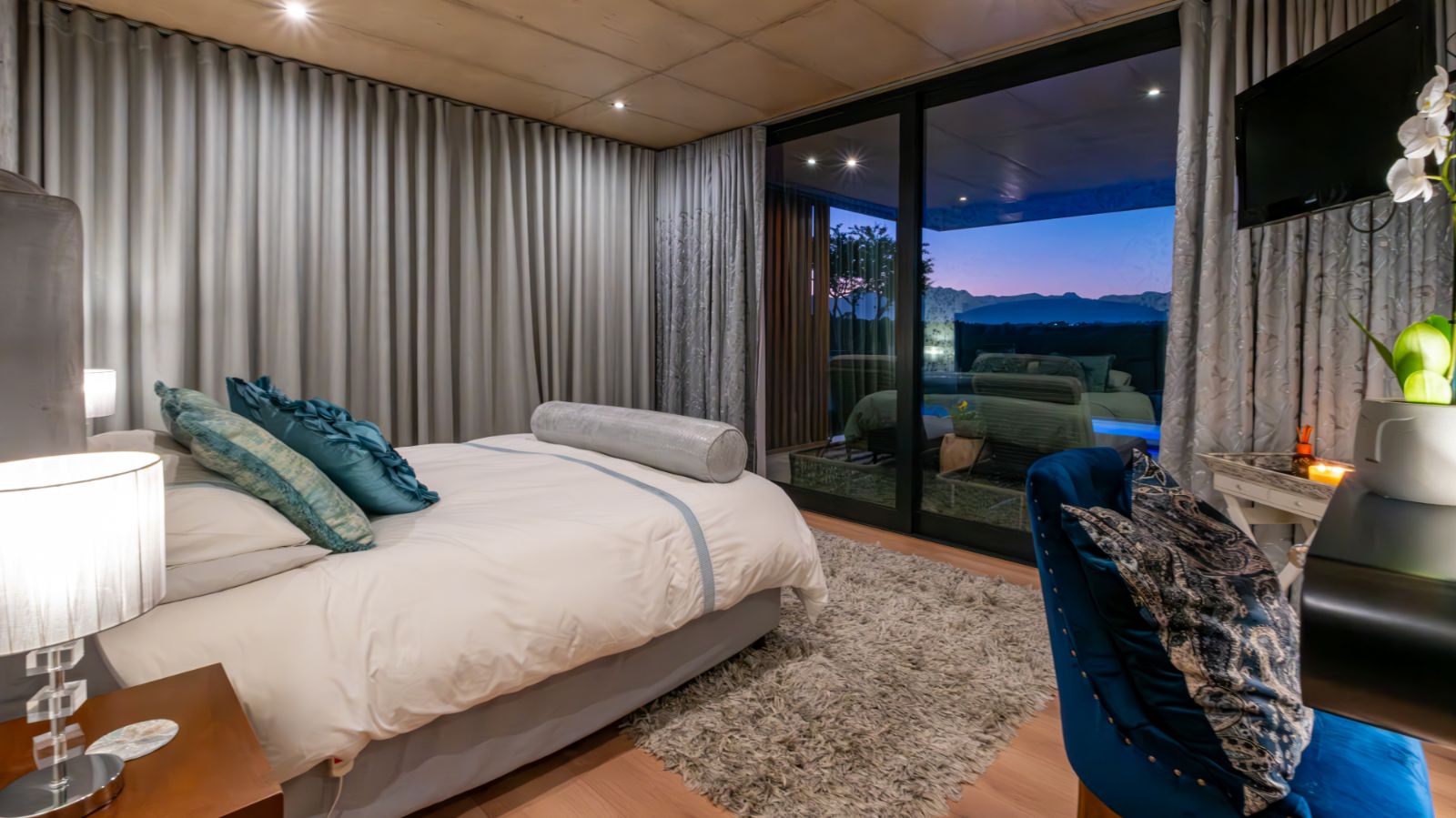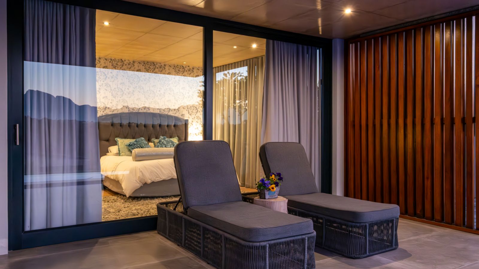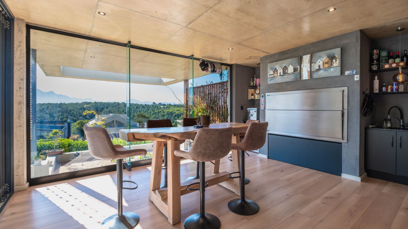 The entertainment journey continues through a spacious lounge that leads to a sophisticated braai room, complete with built-in braai and floor-to-ceiling glass windows framing a tranquil zen garden. To the left, a luxurious entertainment wing includes a lounge area and pool table space, with large stackable glass doors opening onto the sun-drenched pool deck. Outside, a contemporary boma fire pit and modern swimming pool create the perfect setting for evening relaxation — all north-facing to take in breathtaking mountain vistas.