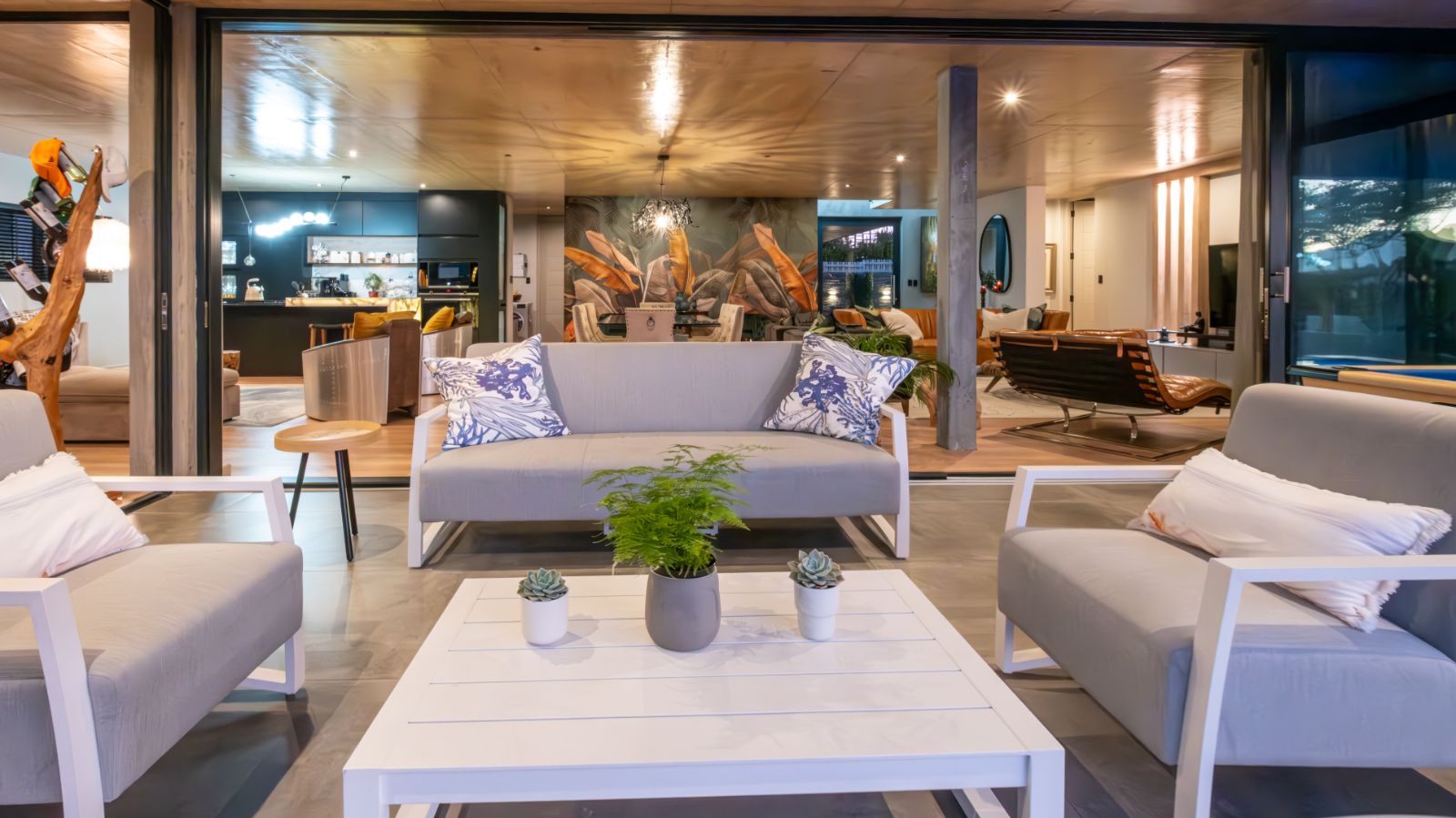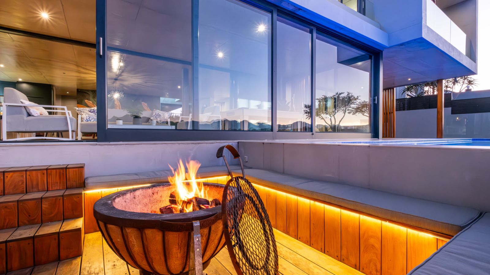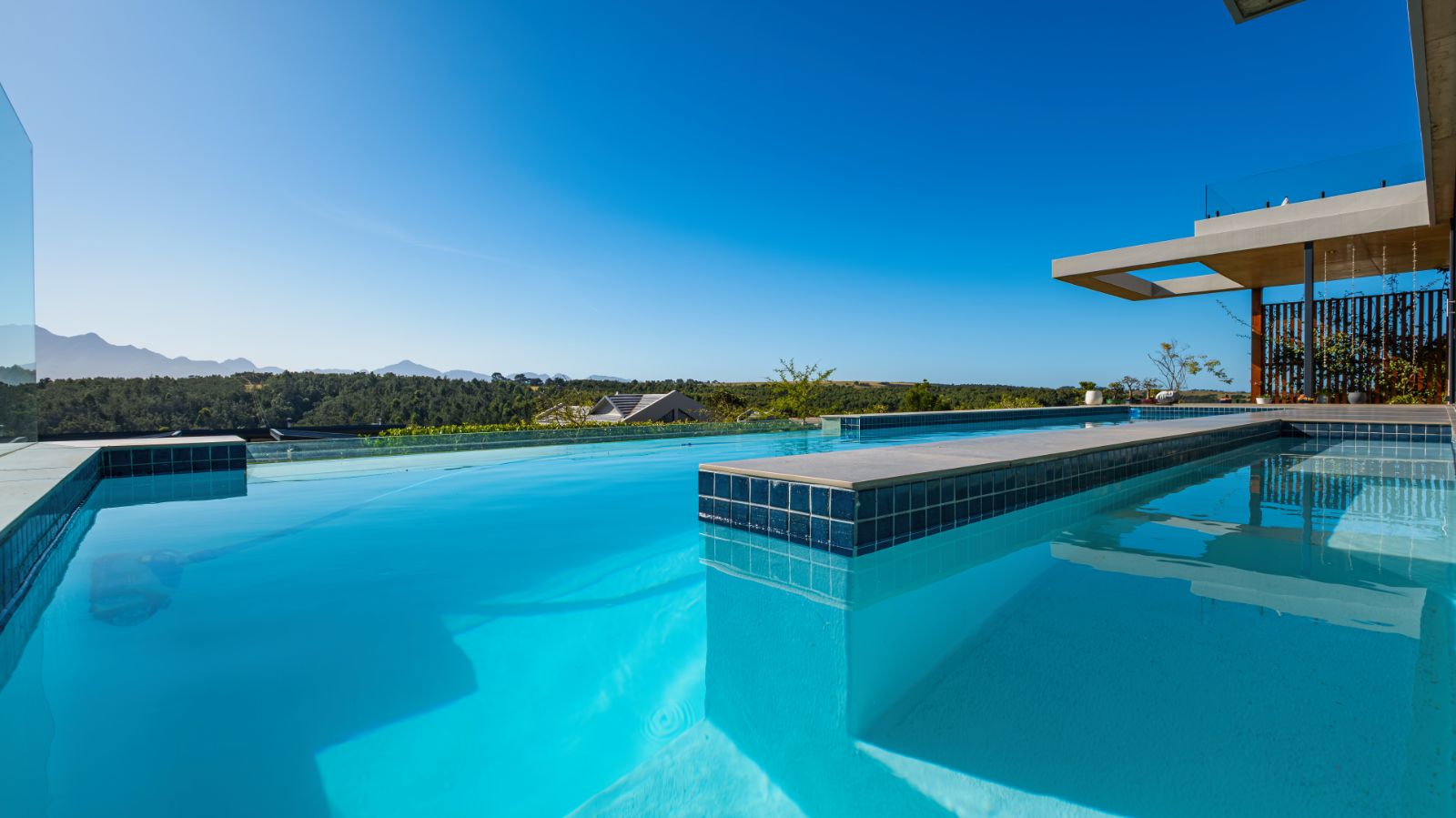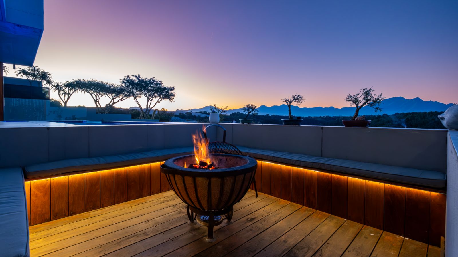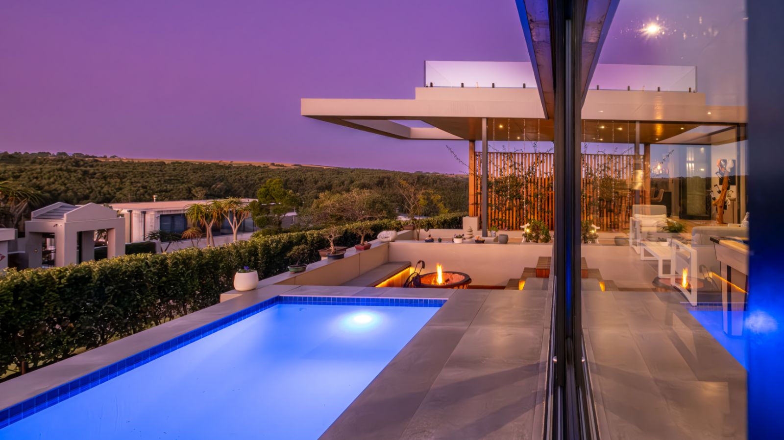 The entertainment journey continues through a spacious lounge that leads to a sophisticated braai room, complete with built-in braai and floor-to-ceiling glass windows framing a tranquil zen garden. To the left, a luxurious entertainment wing includes a lounge area and pool table space, with large stackable glass doors opening onto the sun-drenched pool deck. Outside, a contemporary boma fire pit and modern swimming pool create the perfect setting for evening relaxation — all north-facing to take in breathtaking mountain vistas.